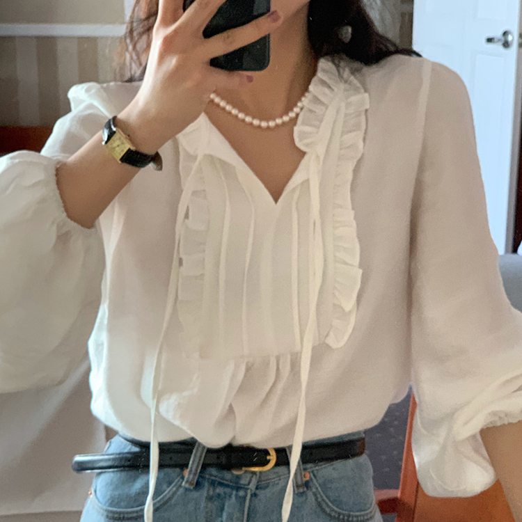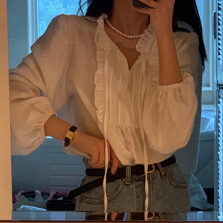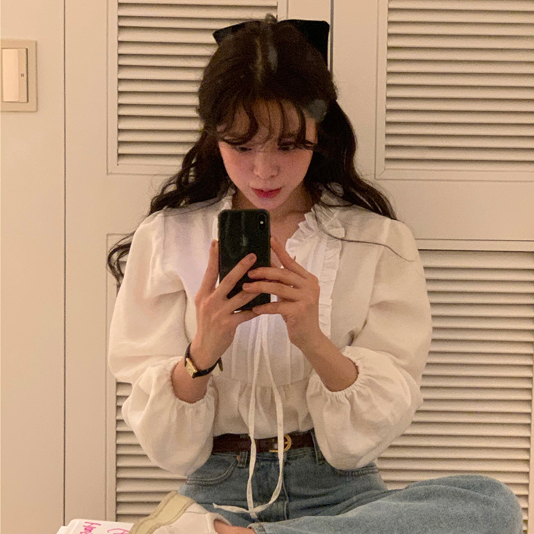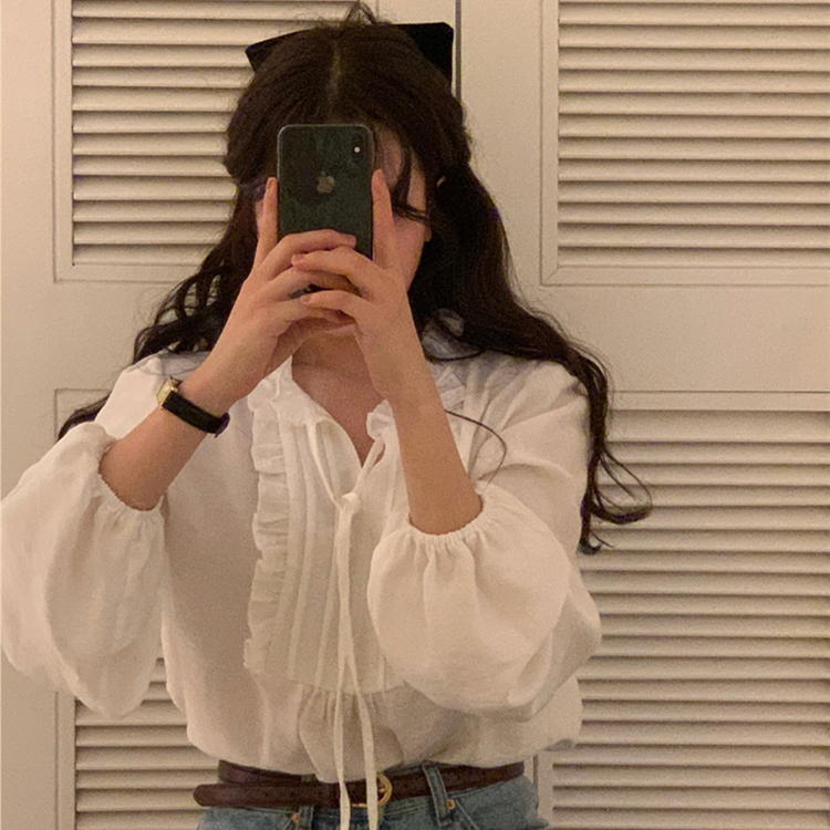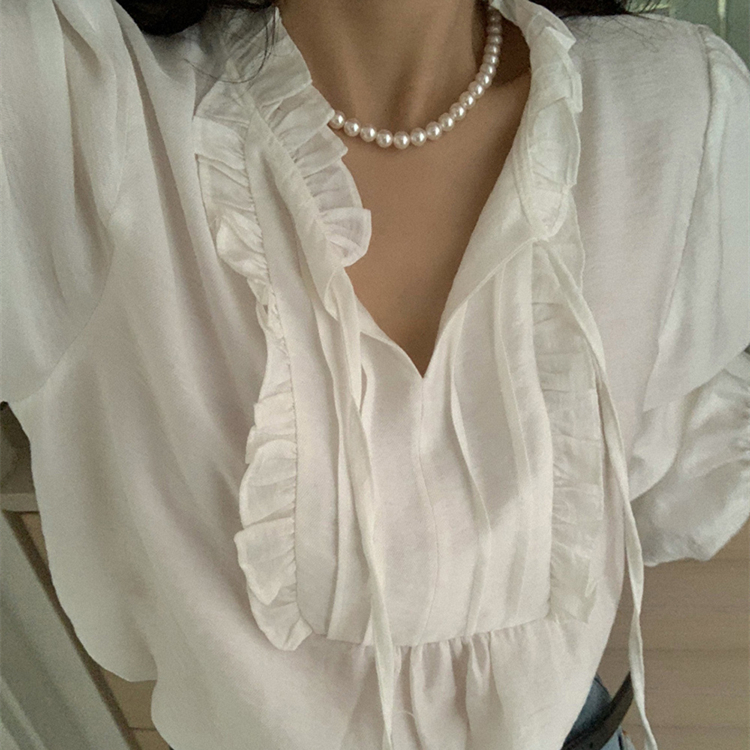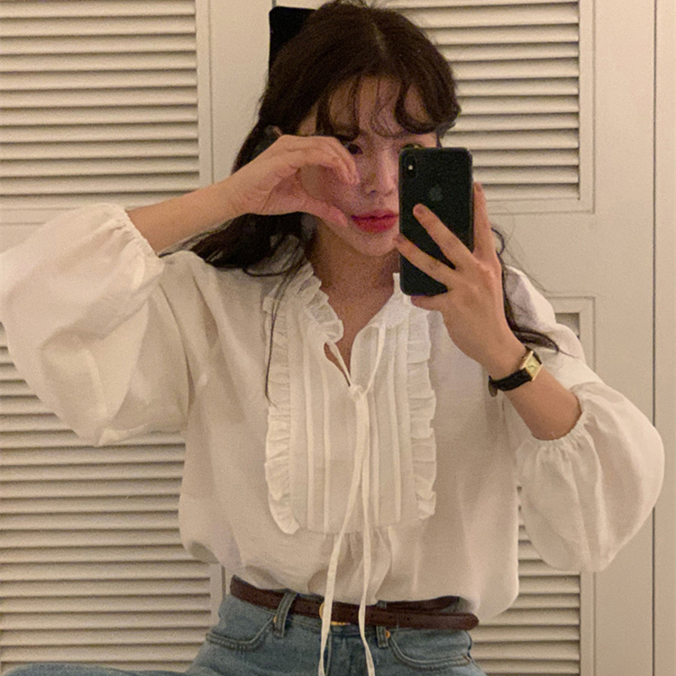 品质版!!实价~韩系甜美木耳花边系带白色衬衫
