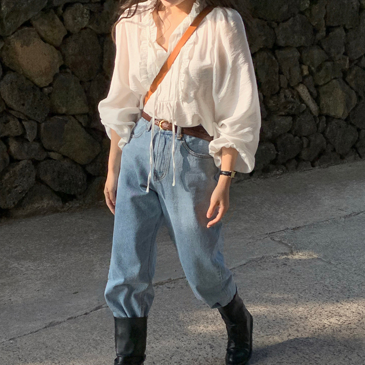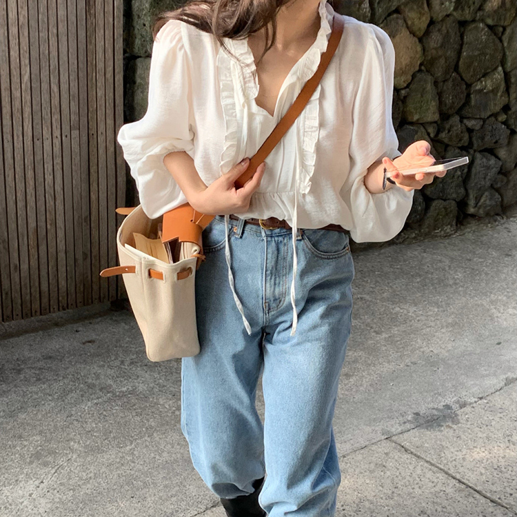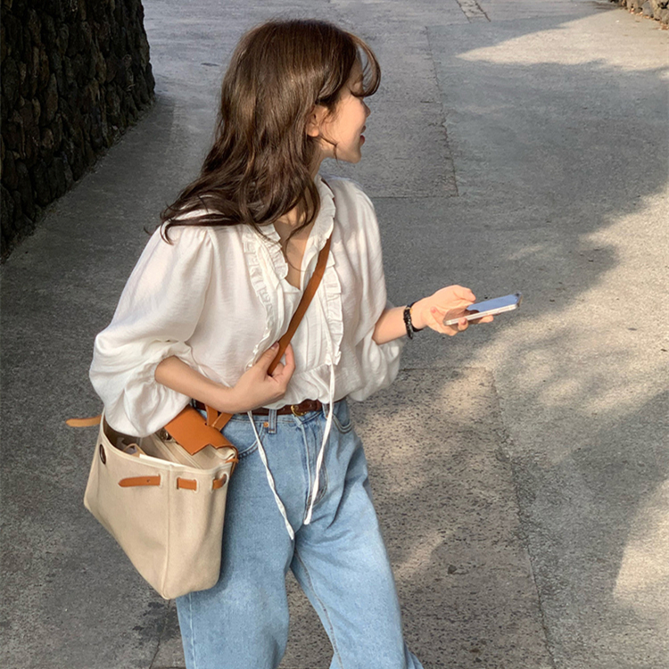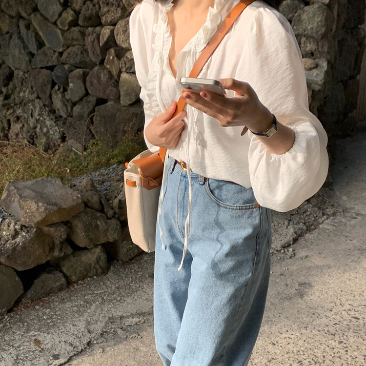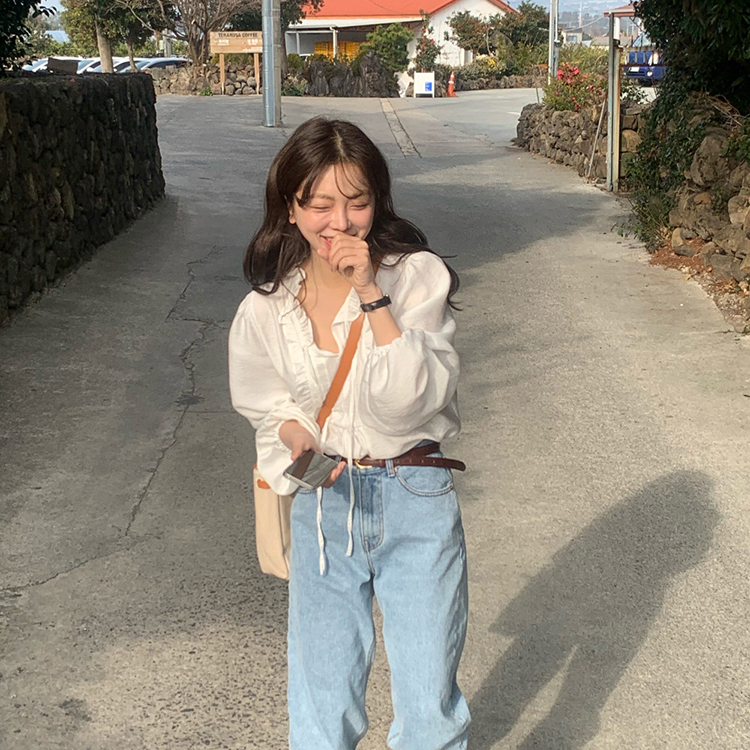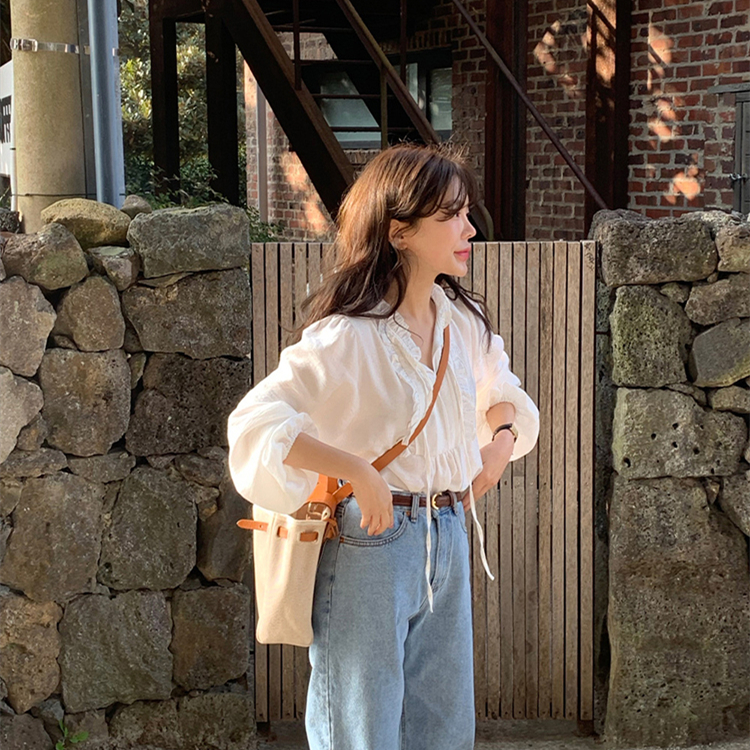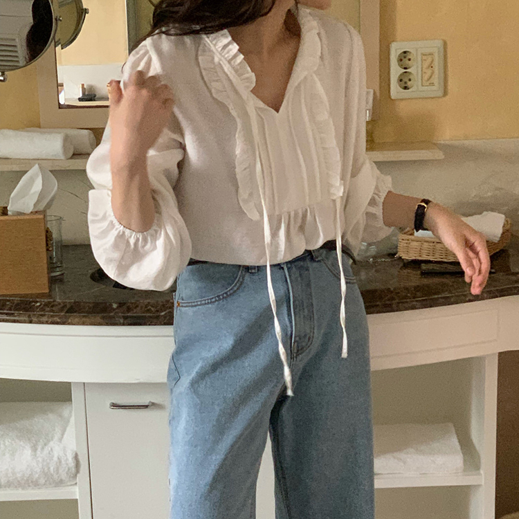 品质版!!实价~韩系甜美木耳花边系带白色衬衫