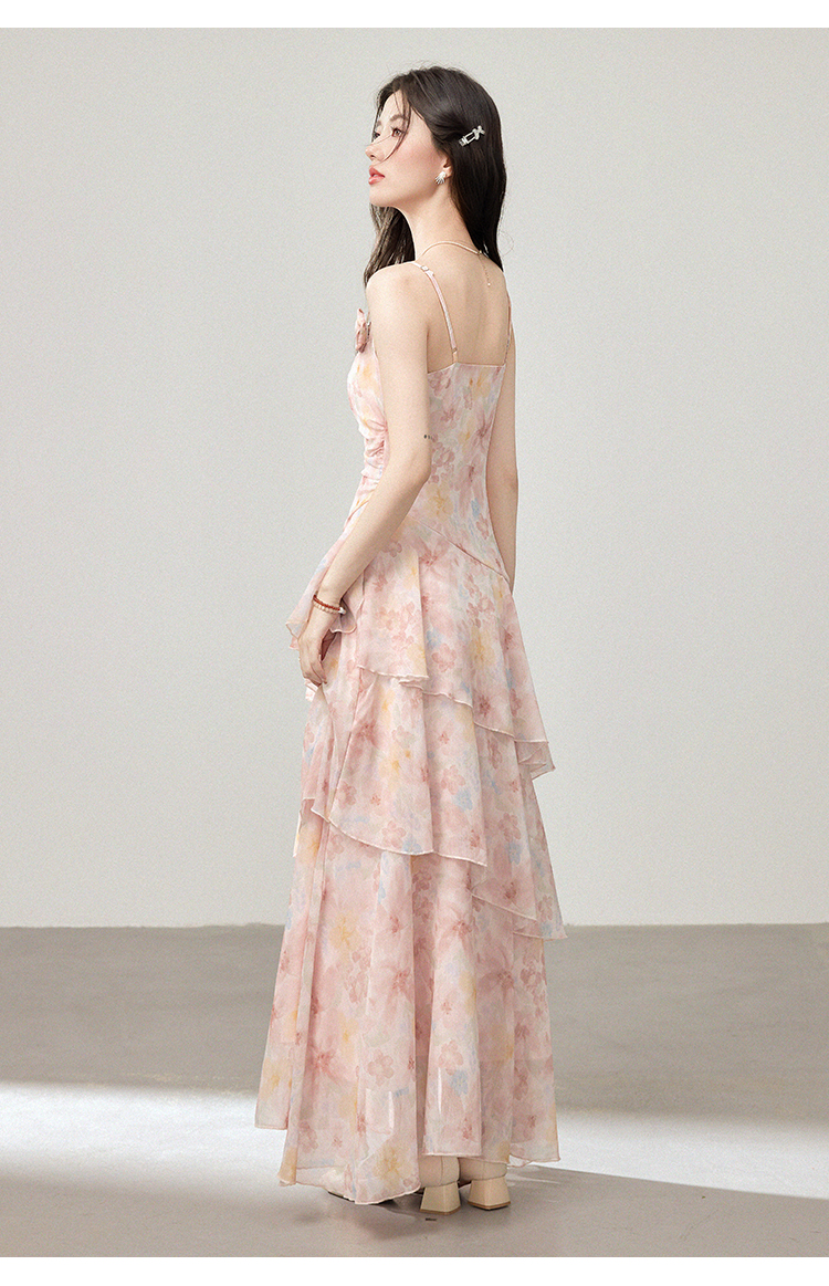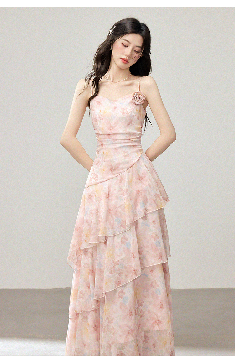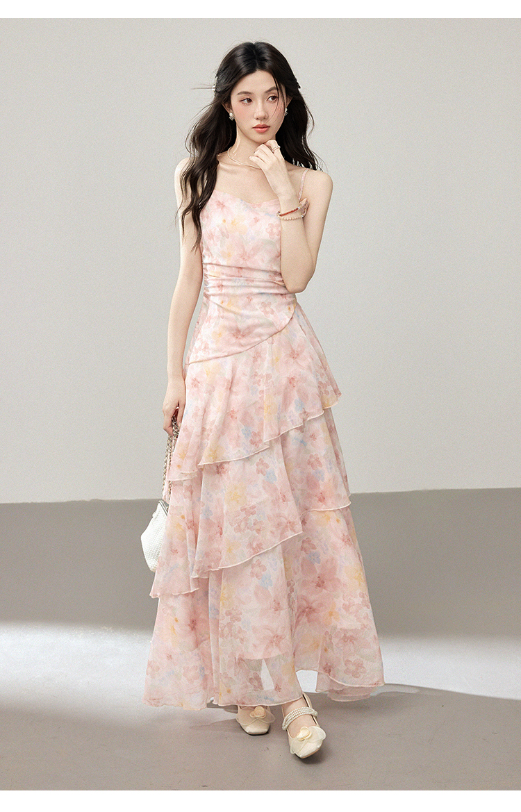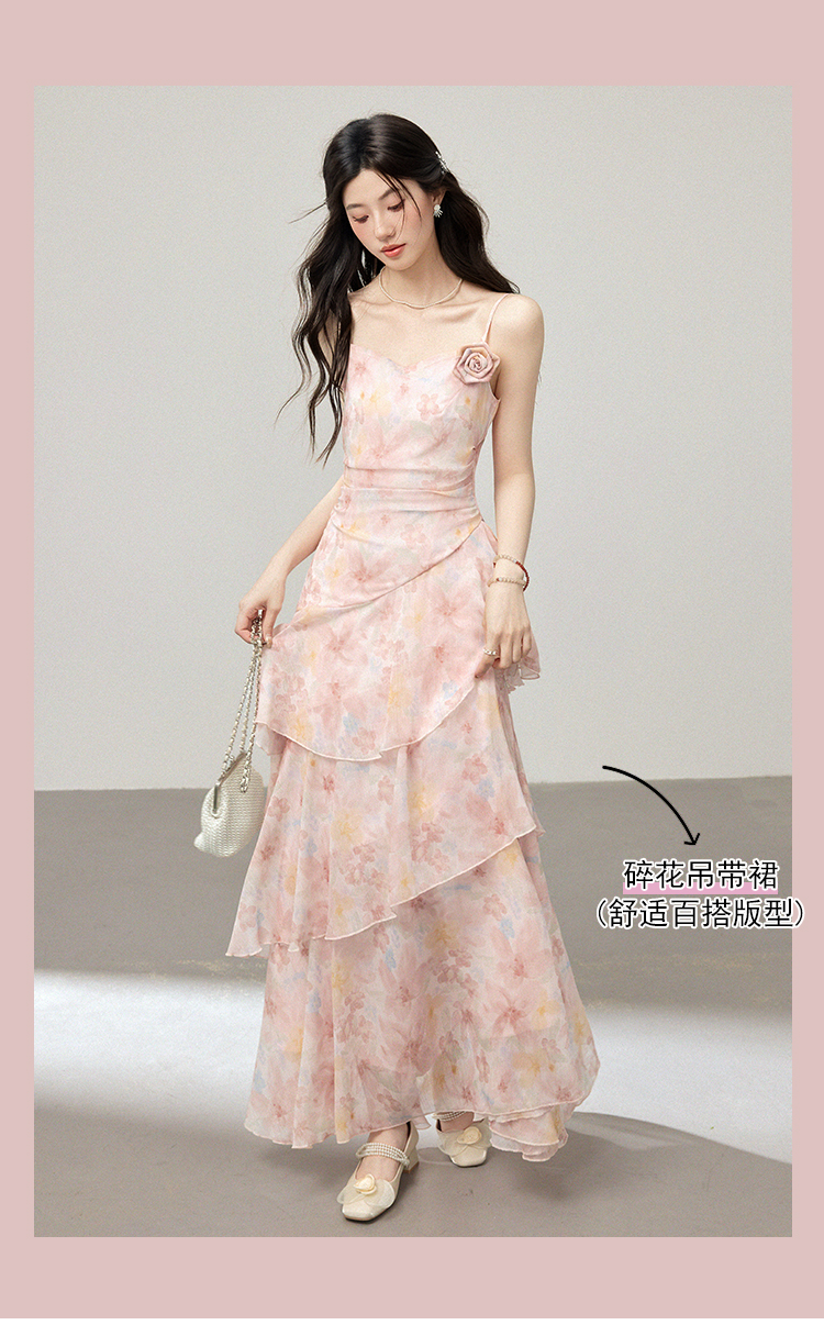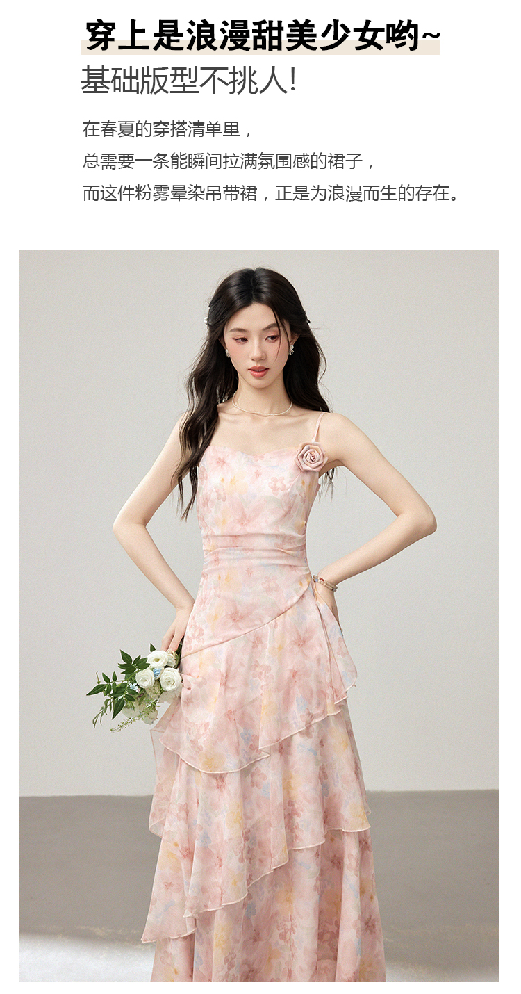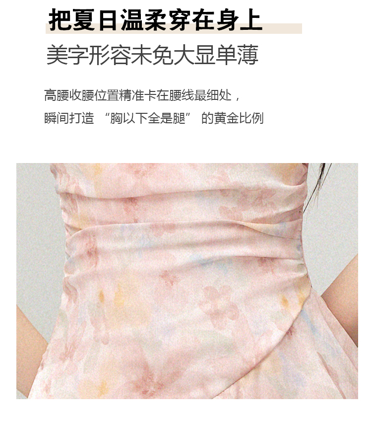 法式小资荷叶边印花连衣裙不规则鱼尾裙子碎花吊带度假日蛋糕裙