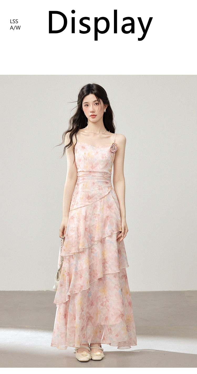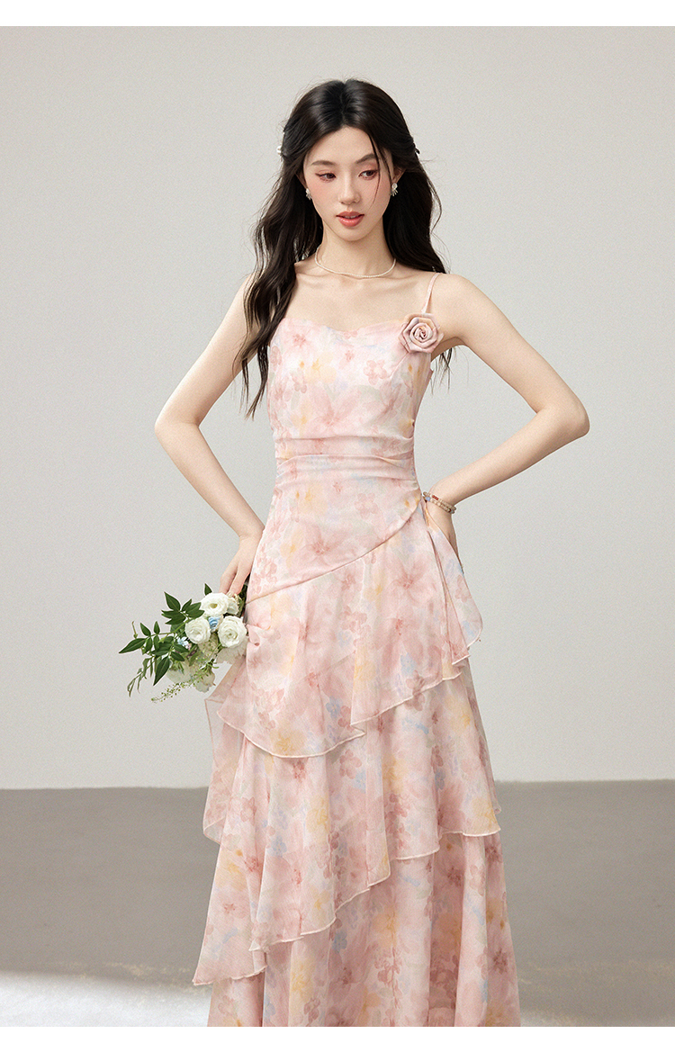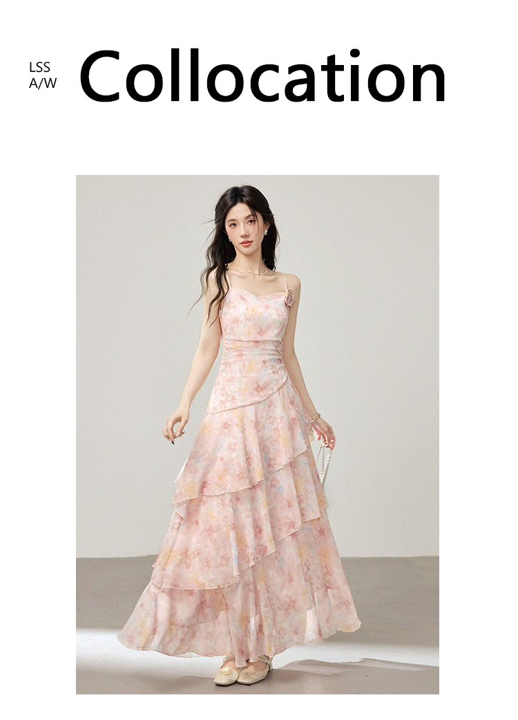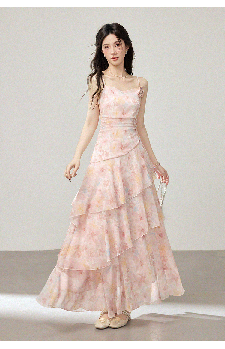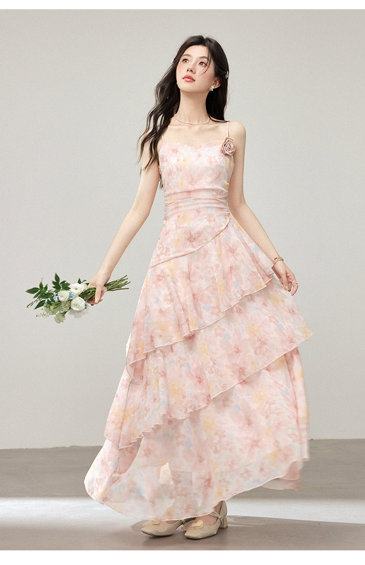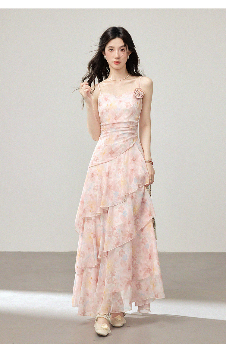法式小资荷叶边印花连衣裙不规则鱼尾裙子碎花吊带度假日蛋糕裙
