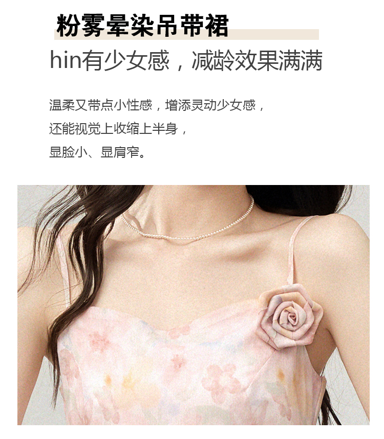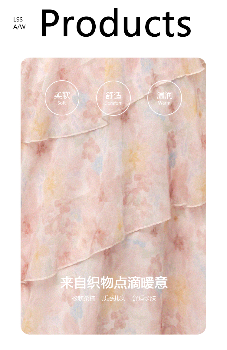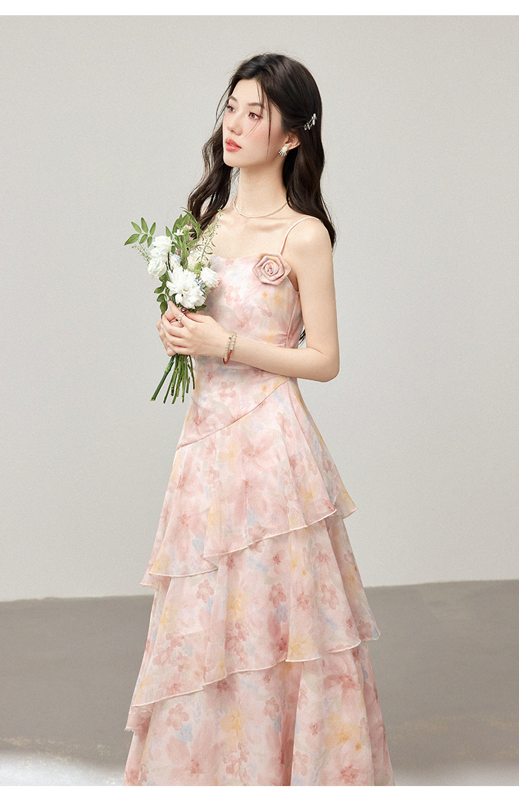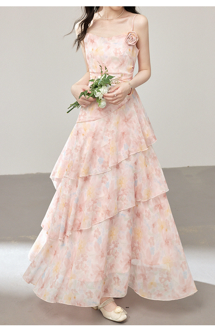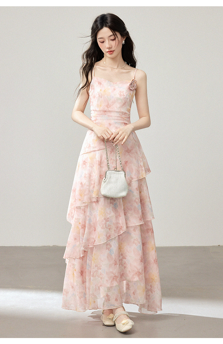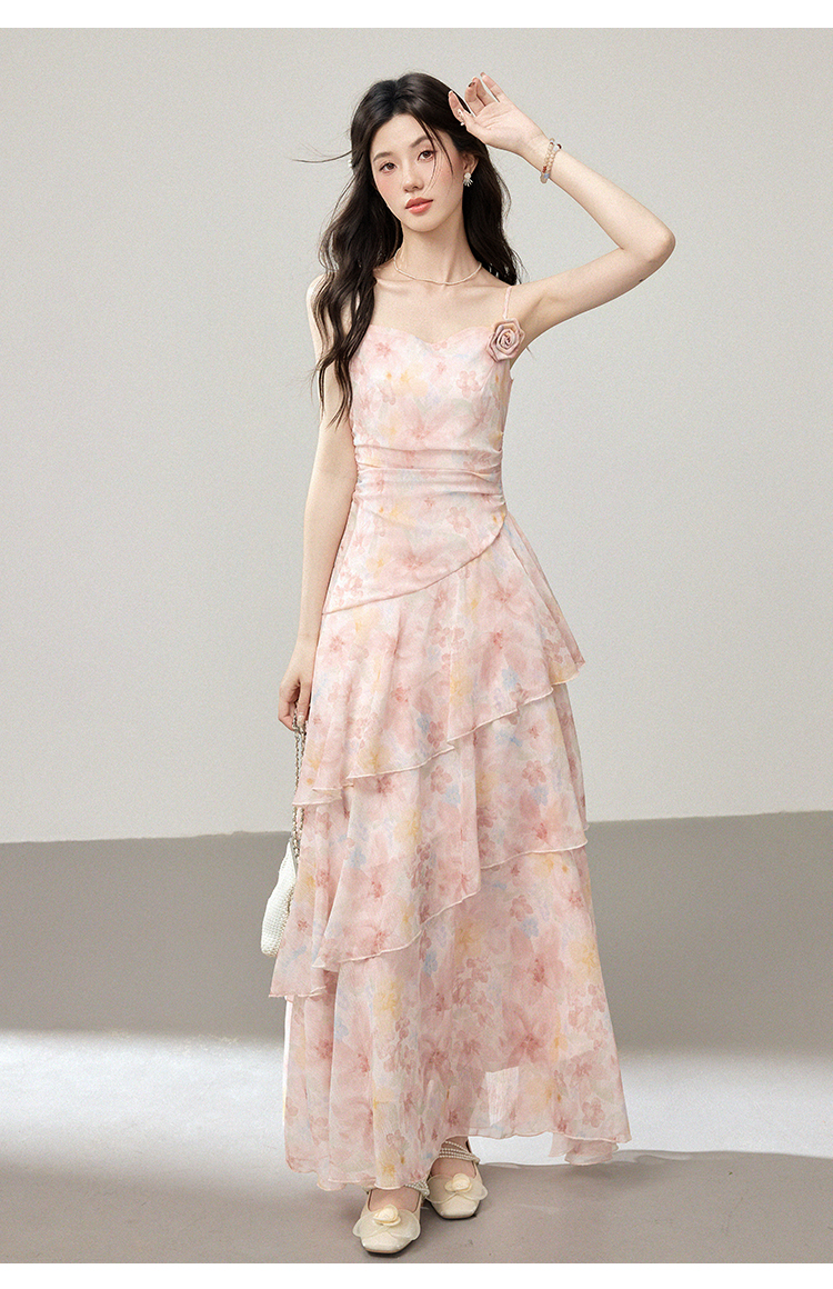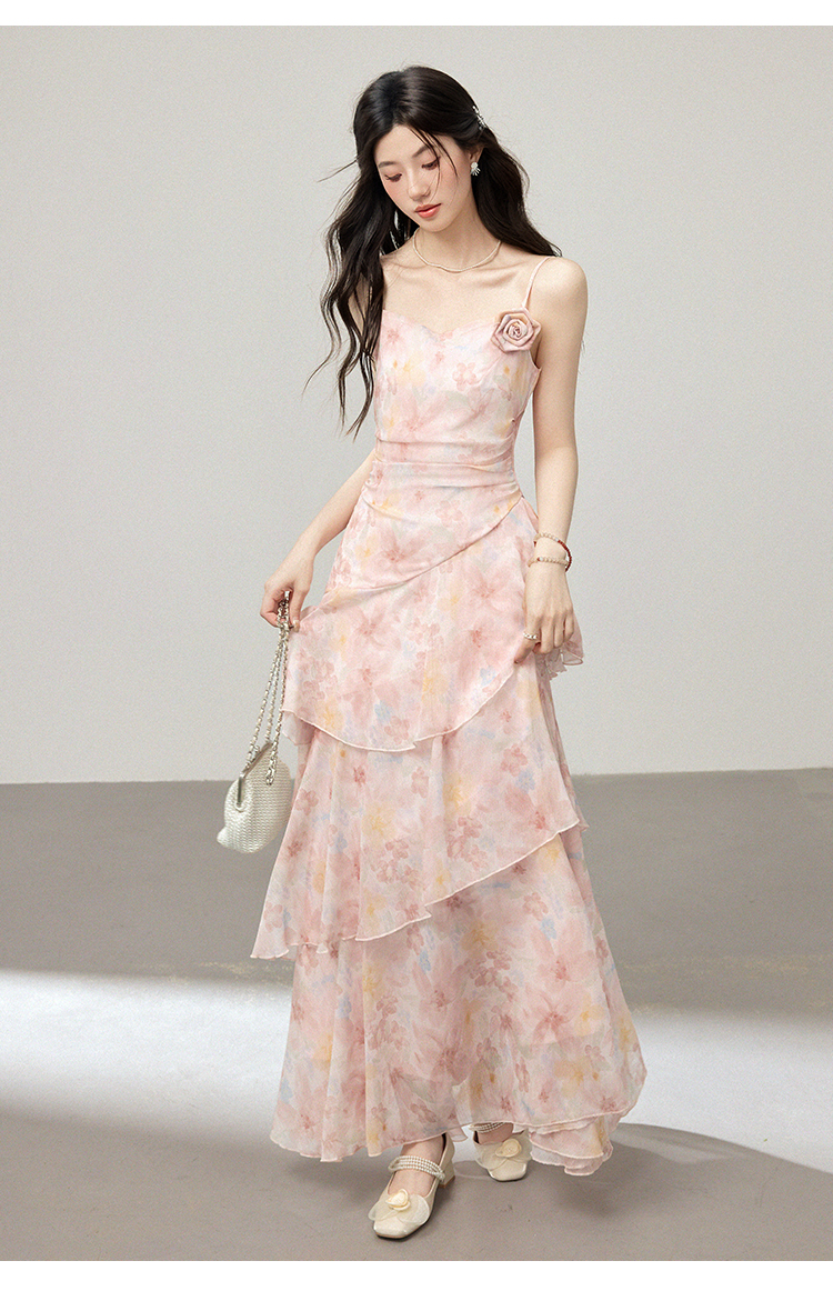 法式小资荷叶边印花连衣裙不规则鱼尾裙子碎花吊带度假日蛋糕裙