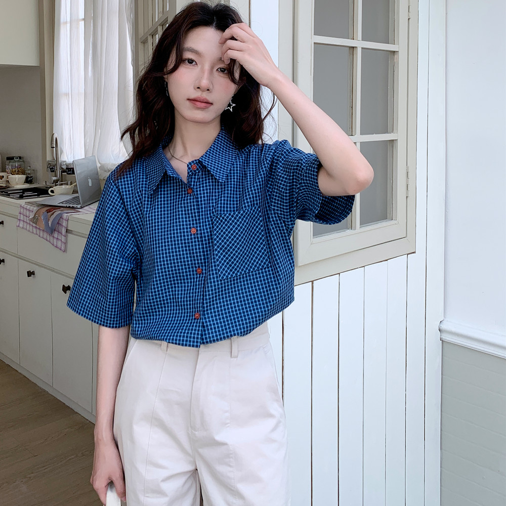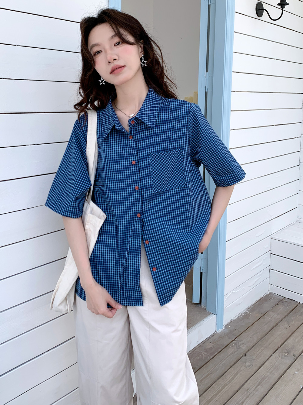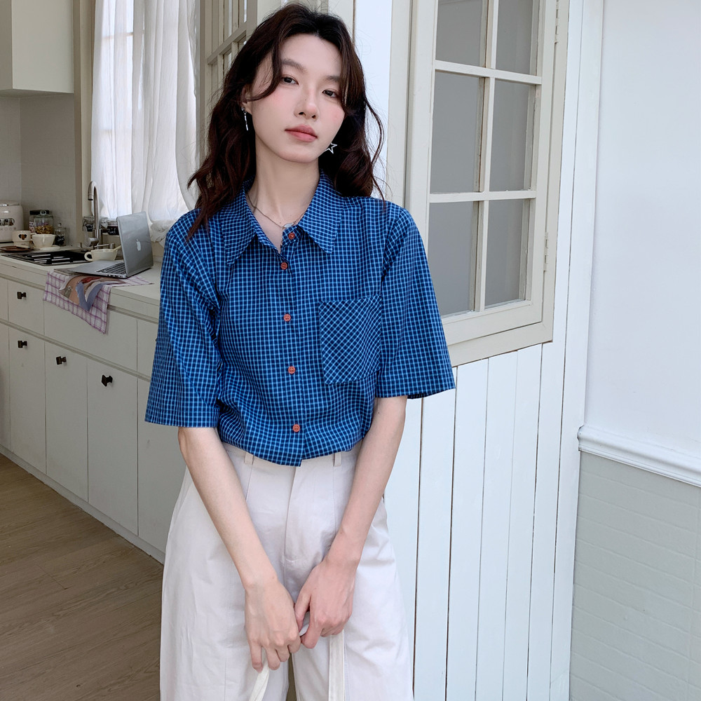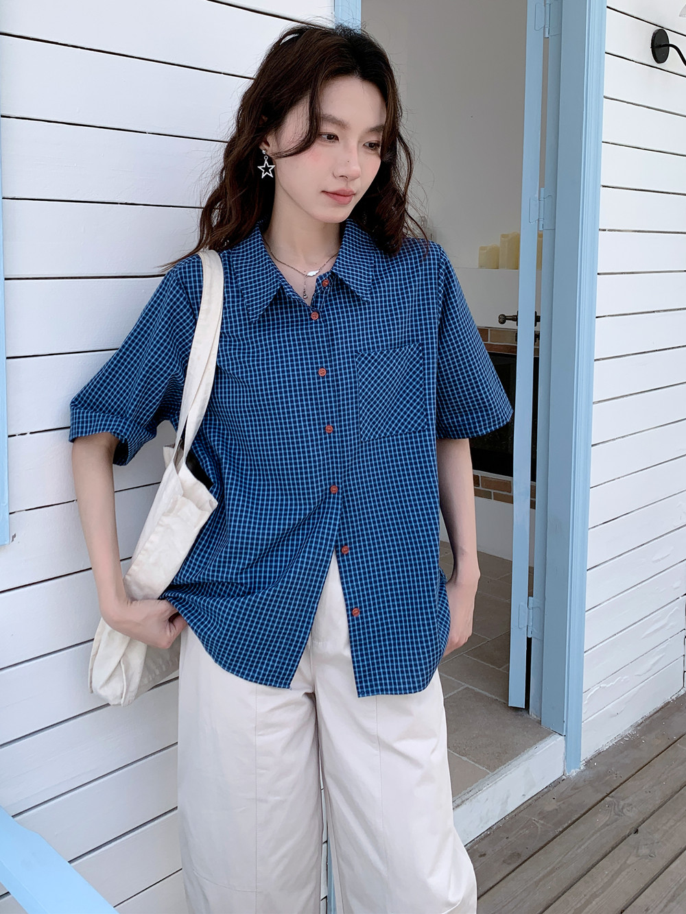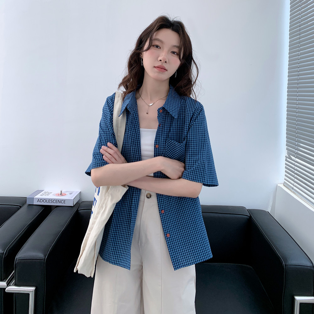 实拍 复古蓝色格子衬衫女夏季休闲上衣翻领纯棉短袖衬衣
