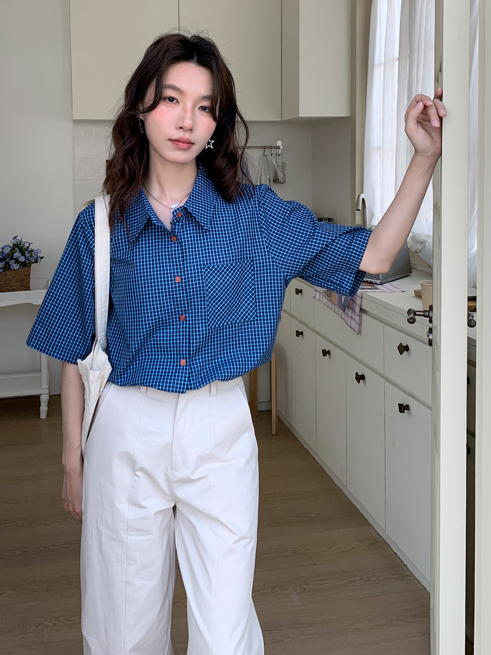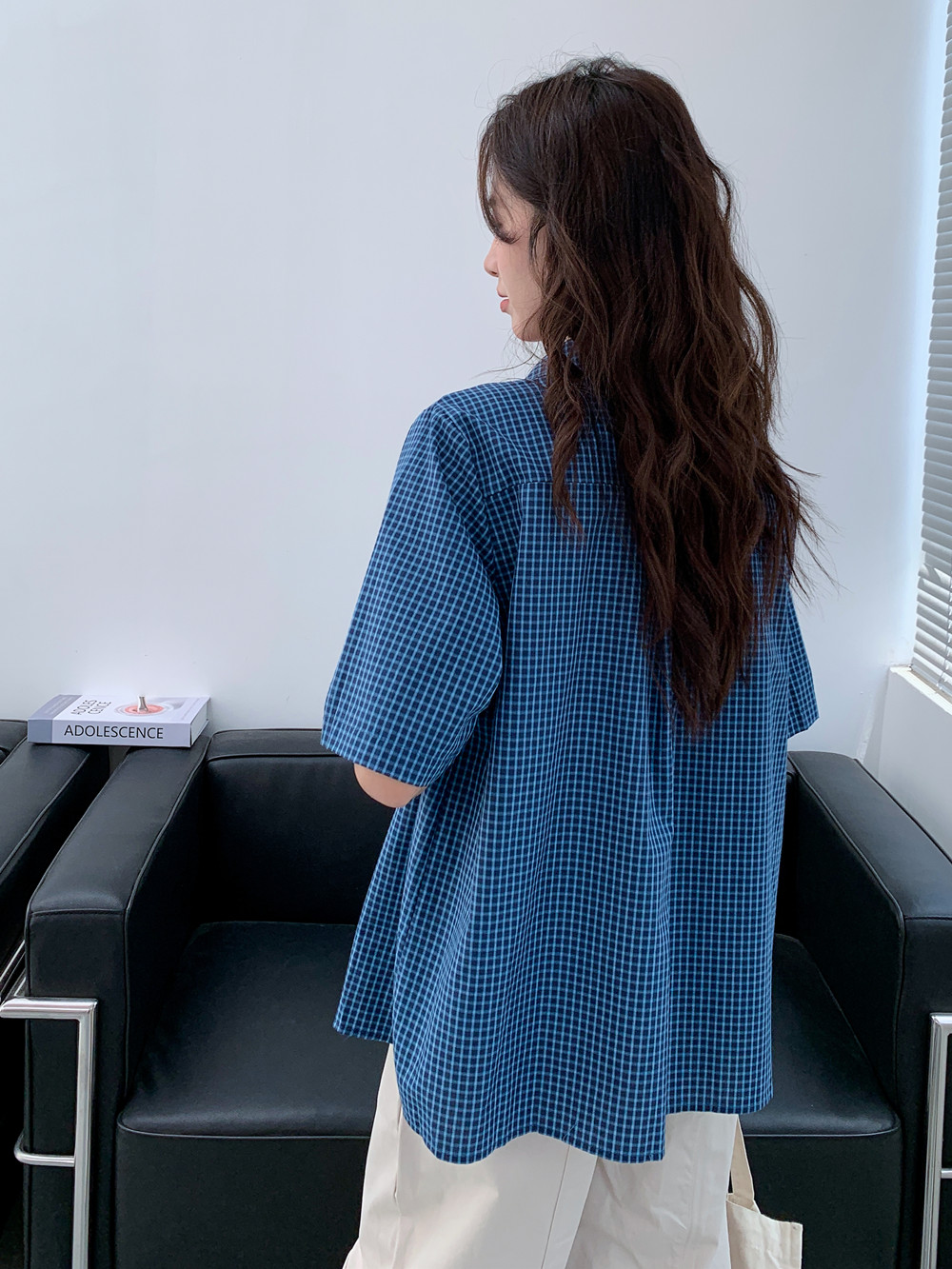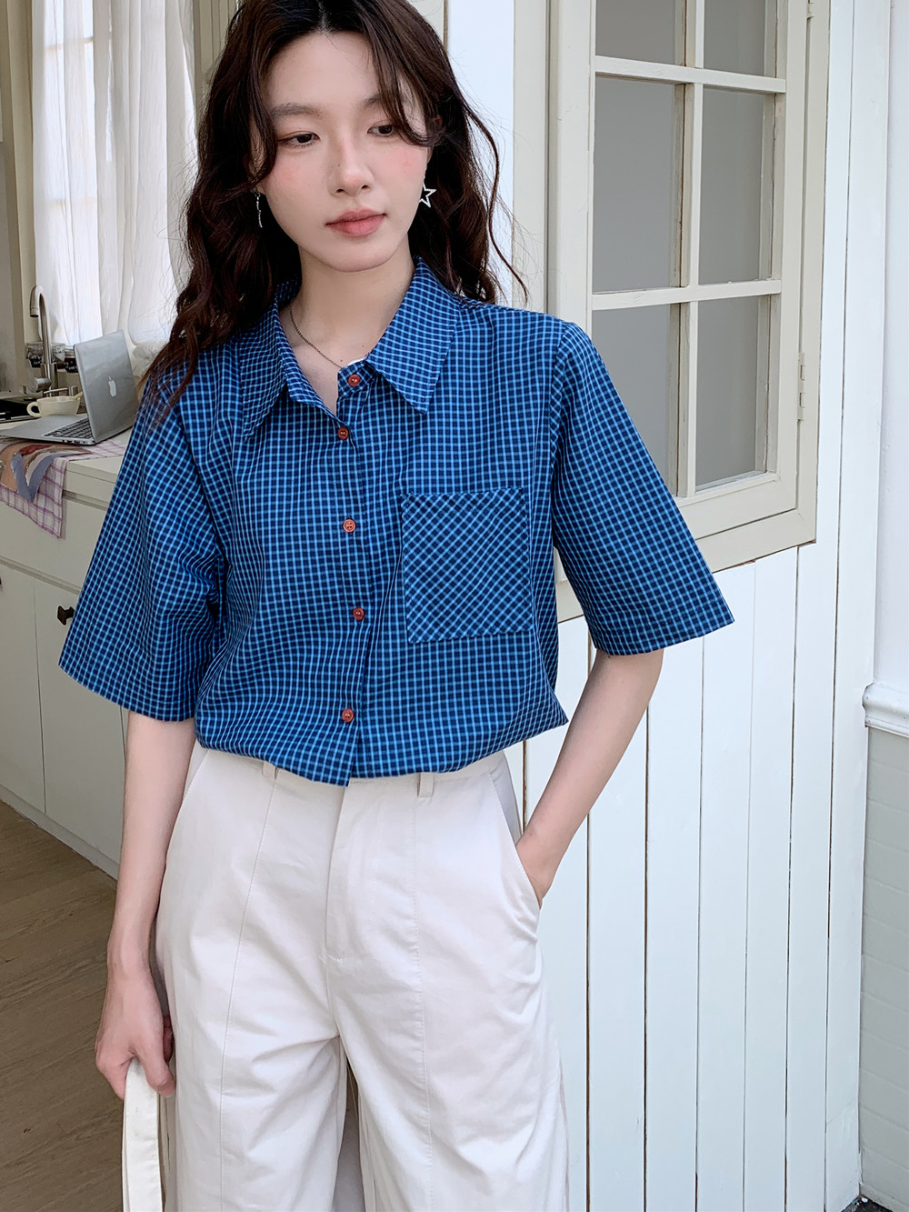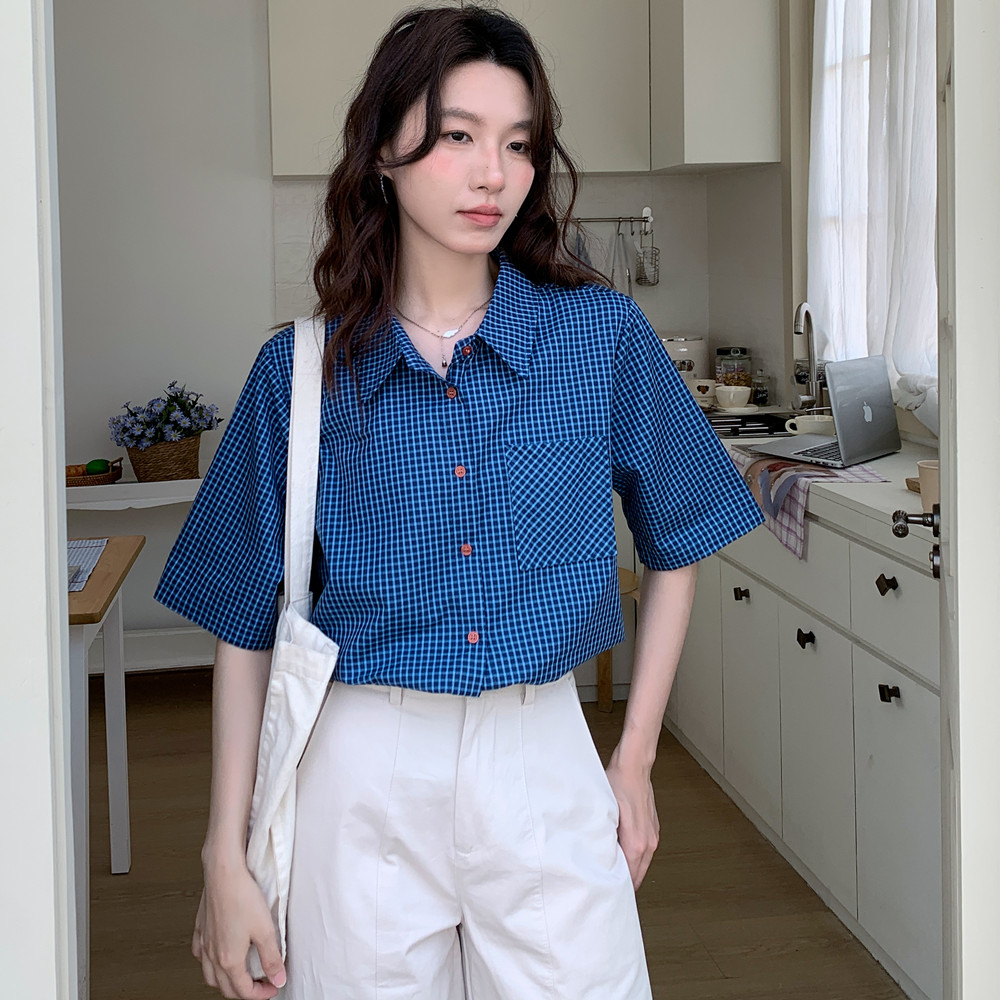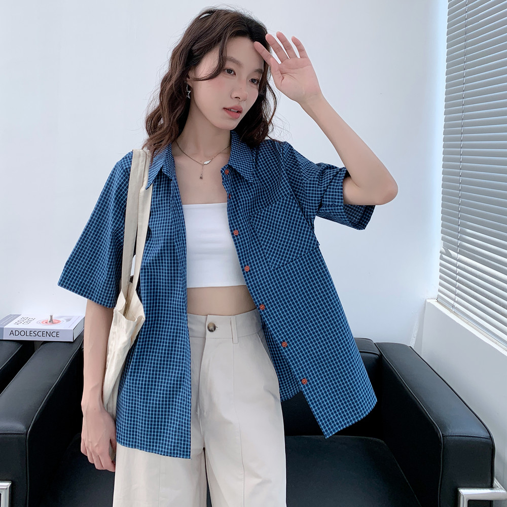 实拍 复古蓝色格子衬衫女夏季休闲上衣翻领纯棉短袖衬衣