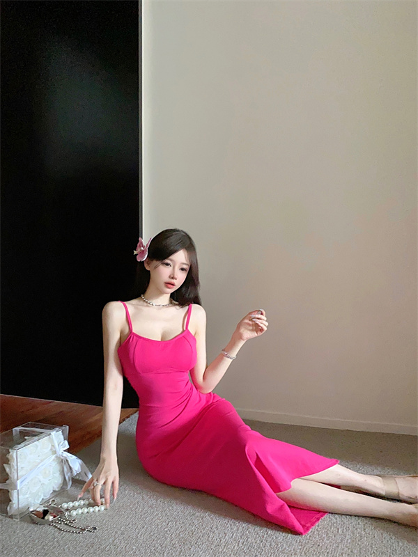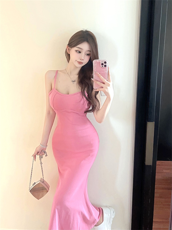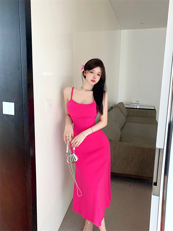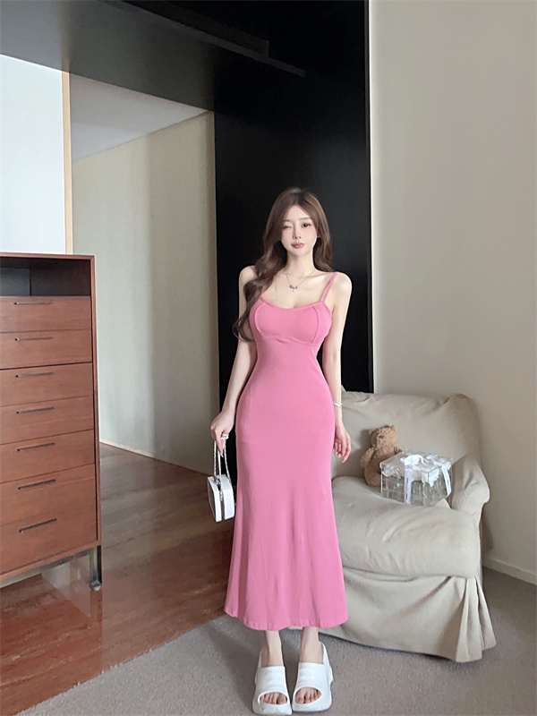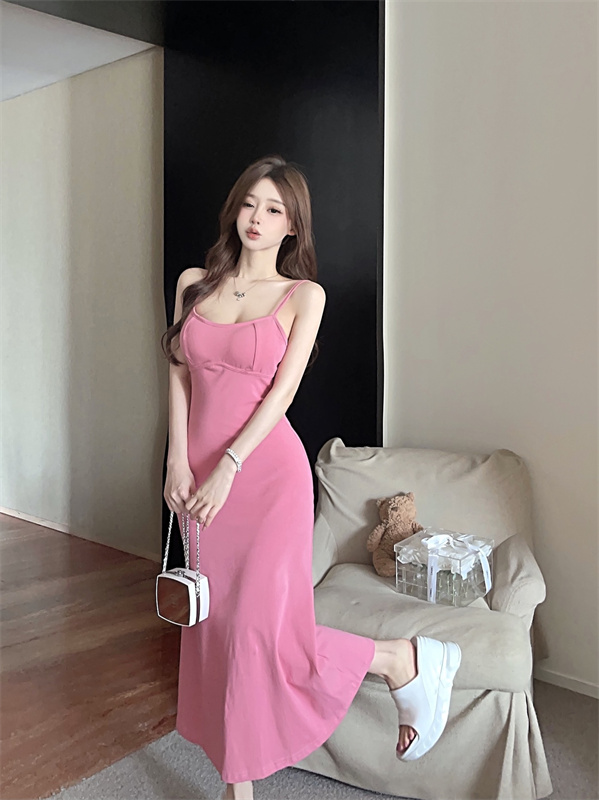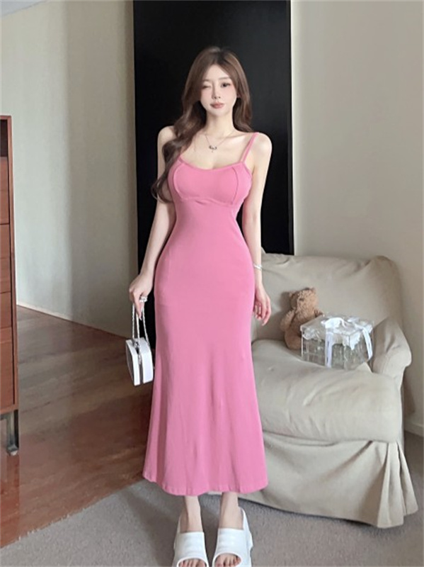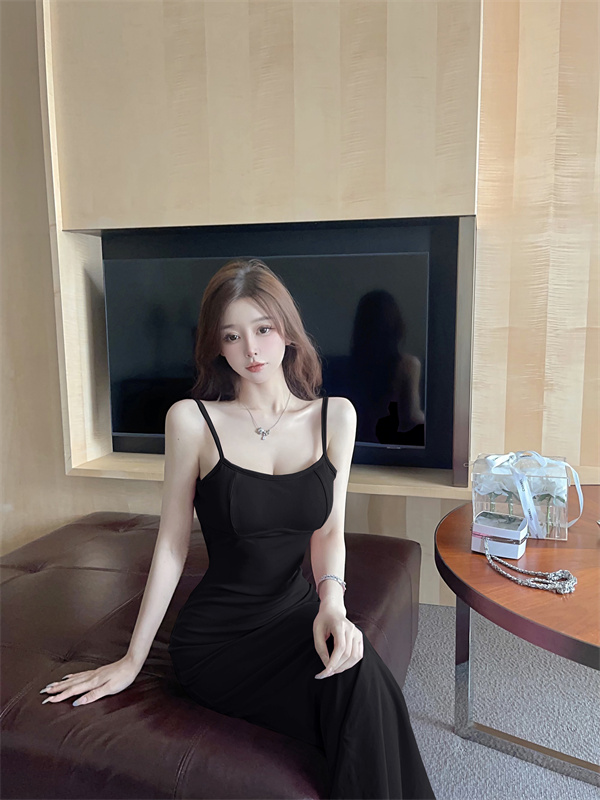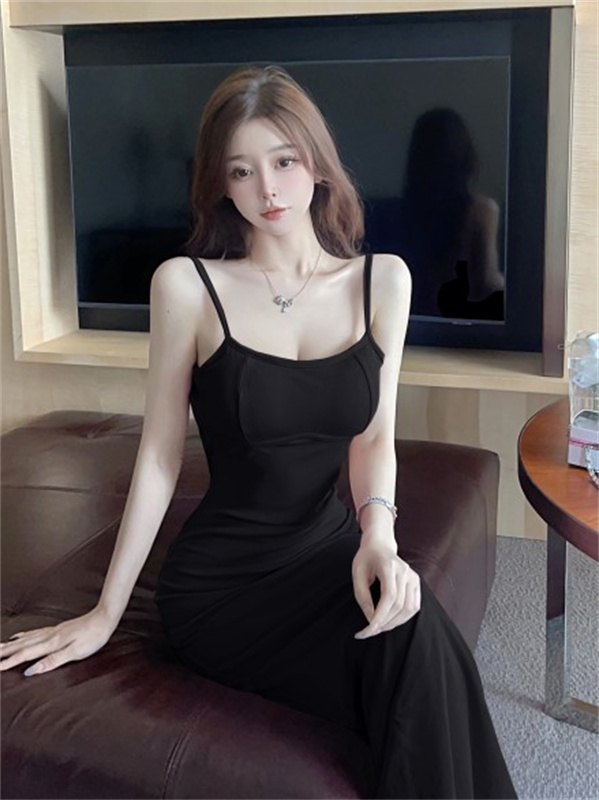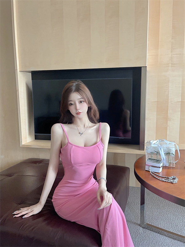 带胸垫性感甜辣连衣裙女2024夏新款修身气质度假风纯色吊带长裙子