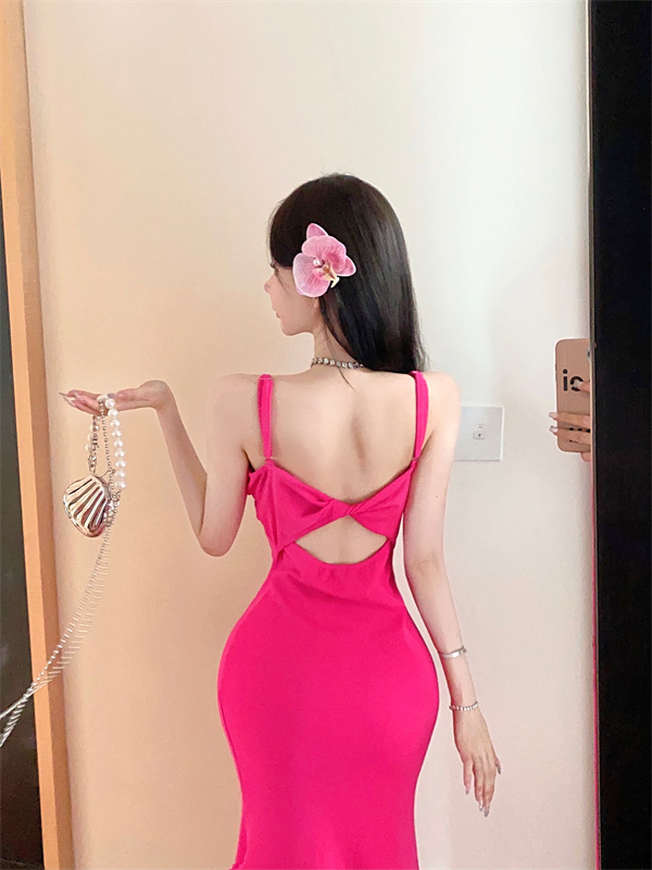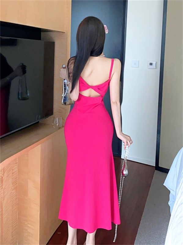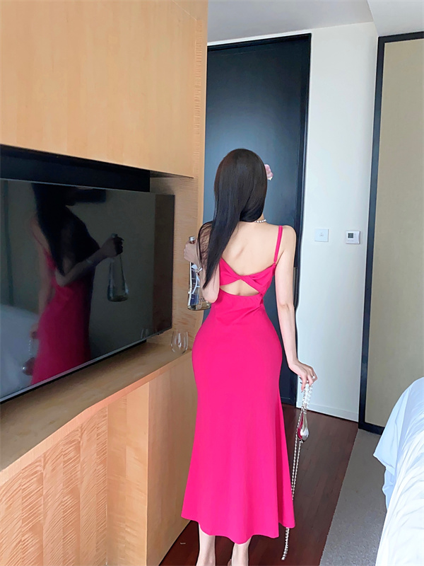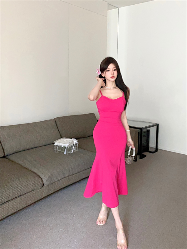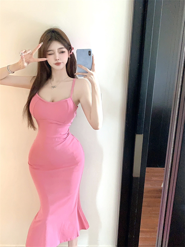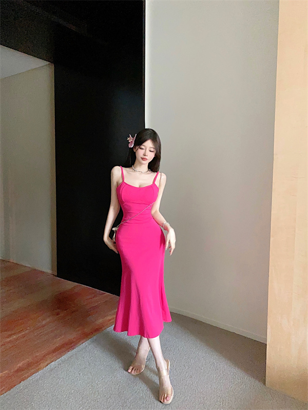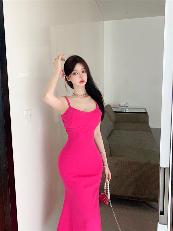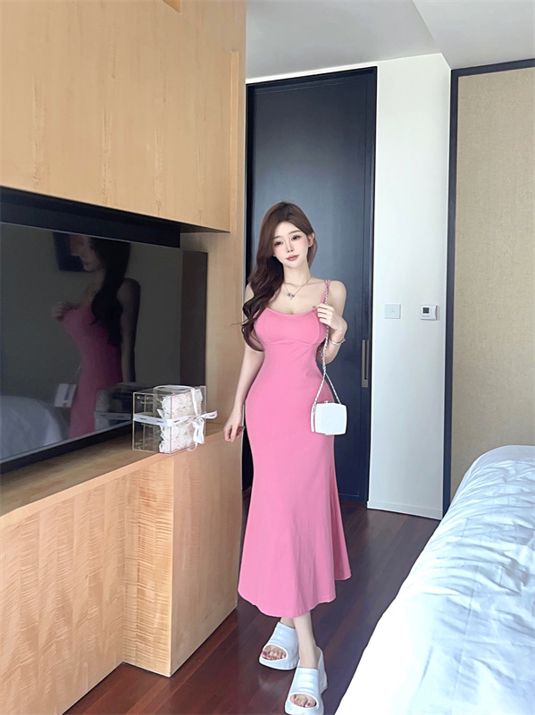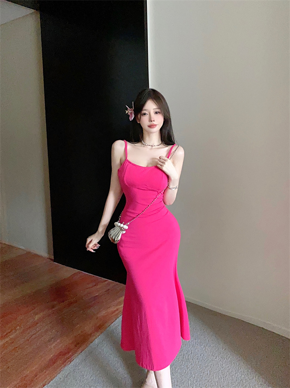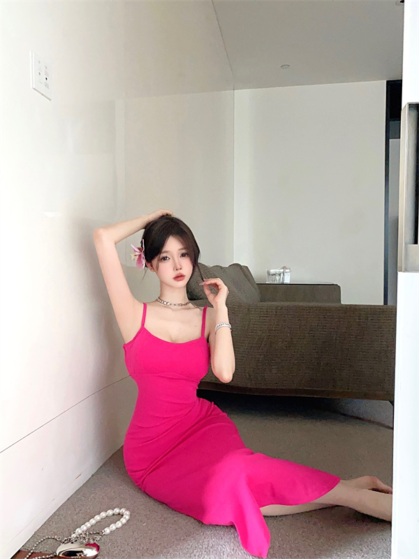 带胸垫性感甜辣连衣裙女2024夏新款修身气质度假风纯色吊带长裙子