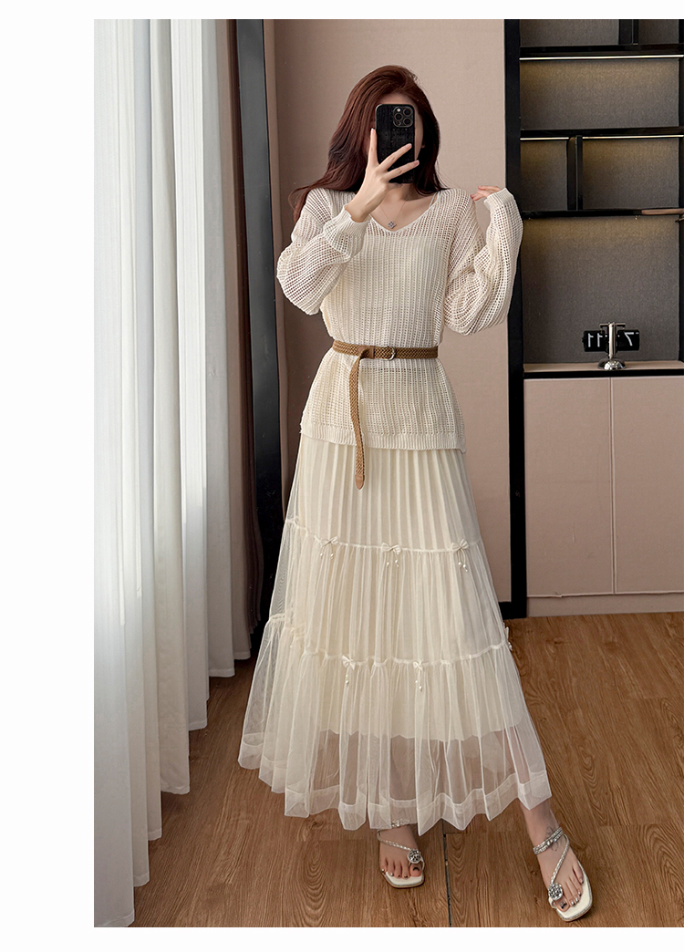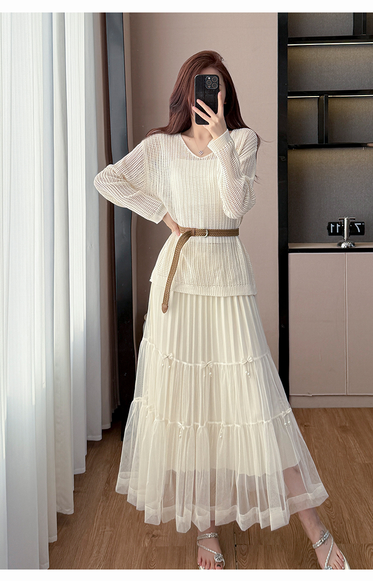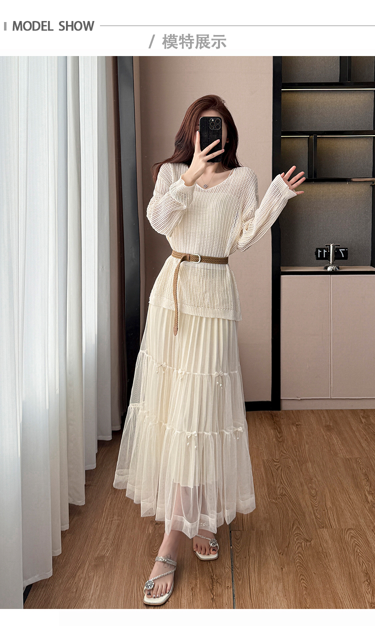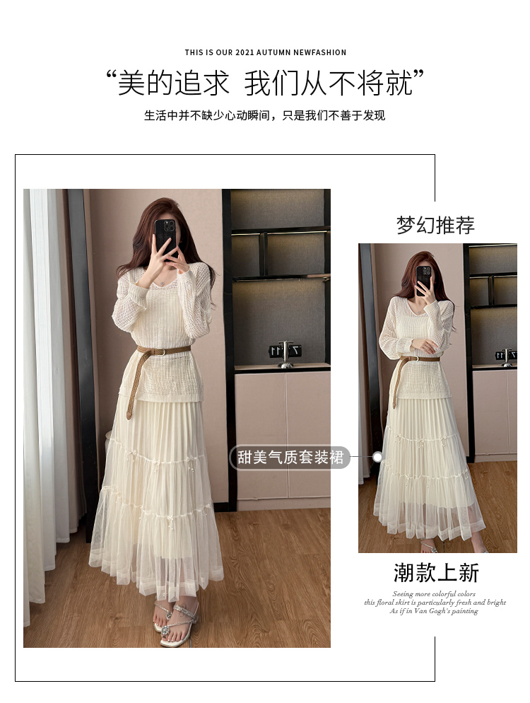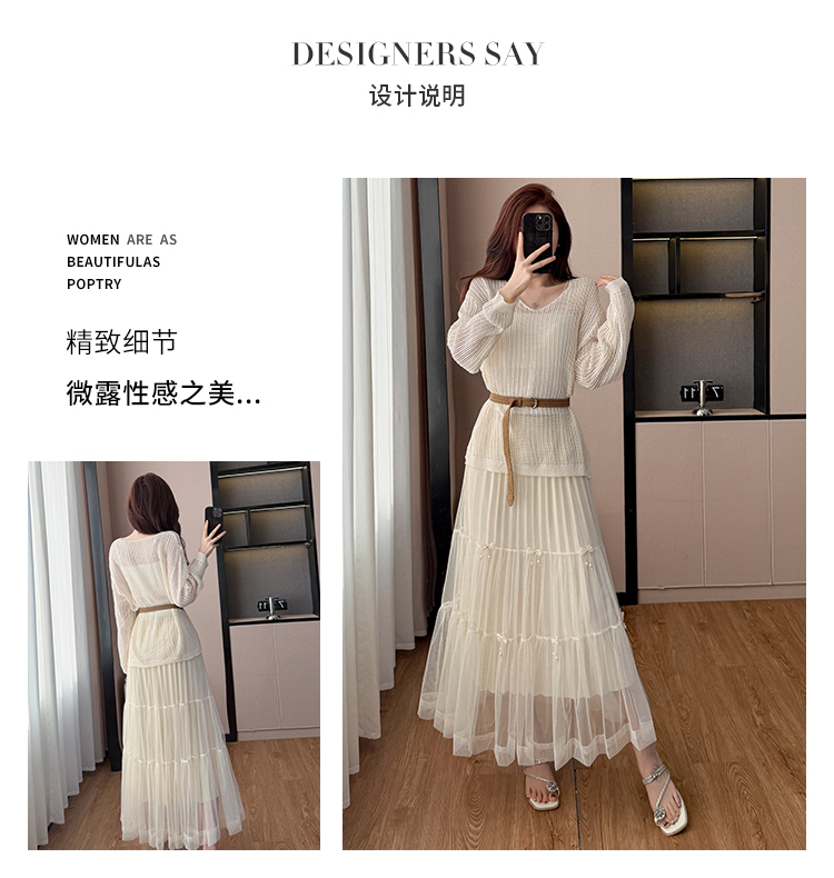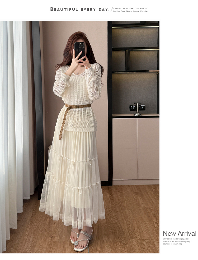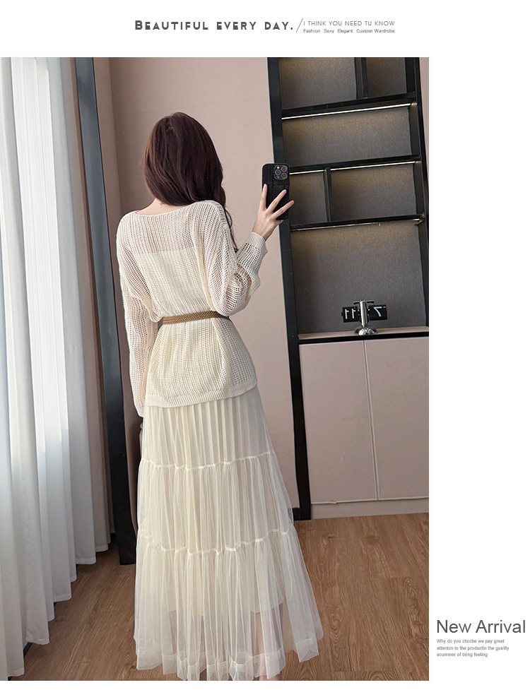 春夏季慵懒风宽松缕空防晒罩衫性感吊带背心高腰花边半身裙三件套