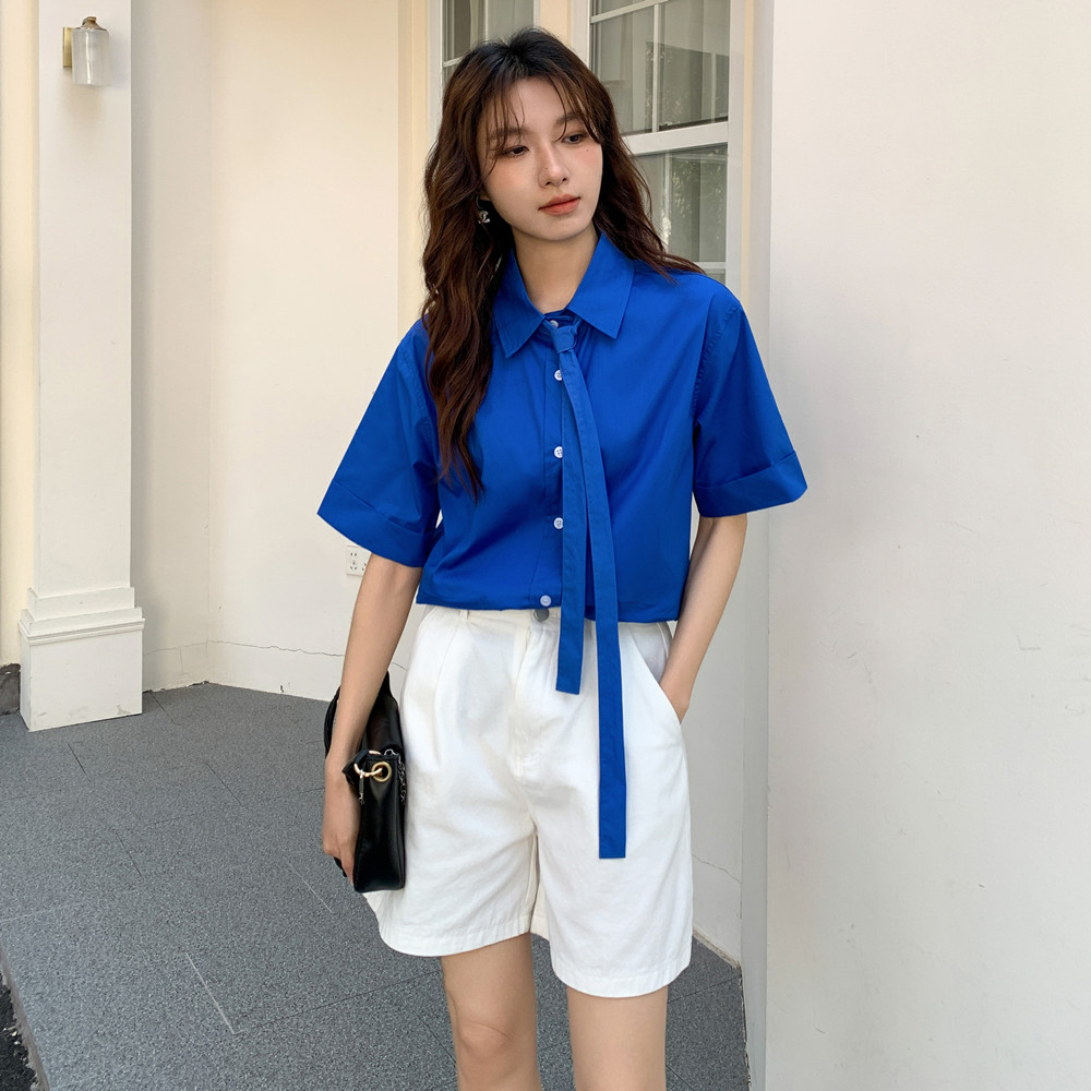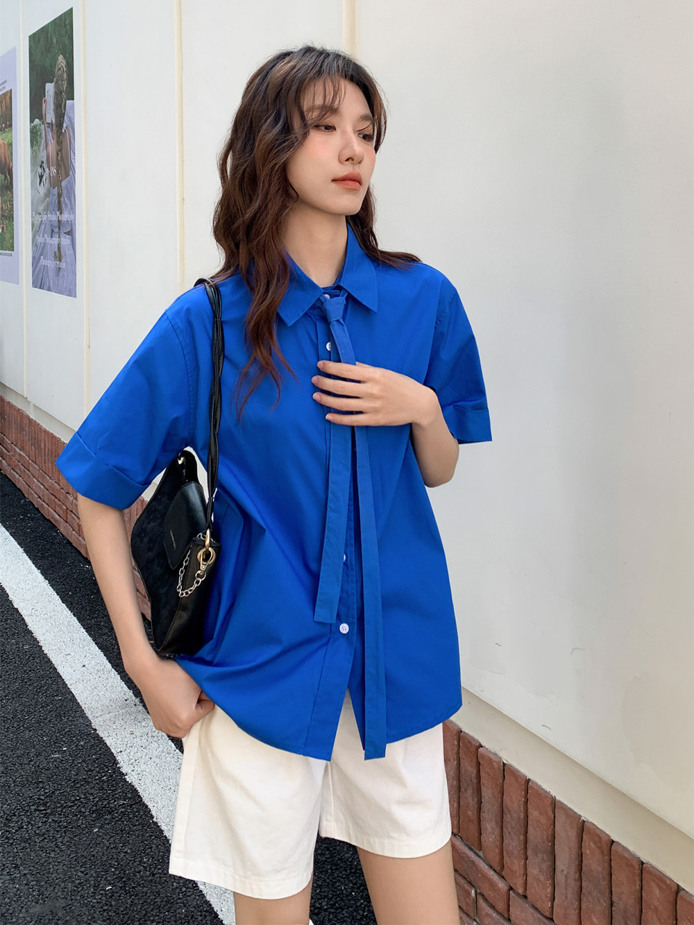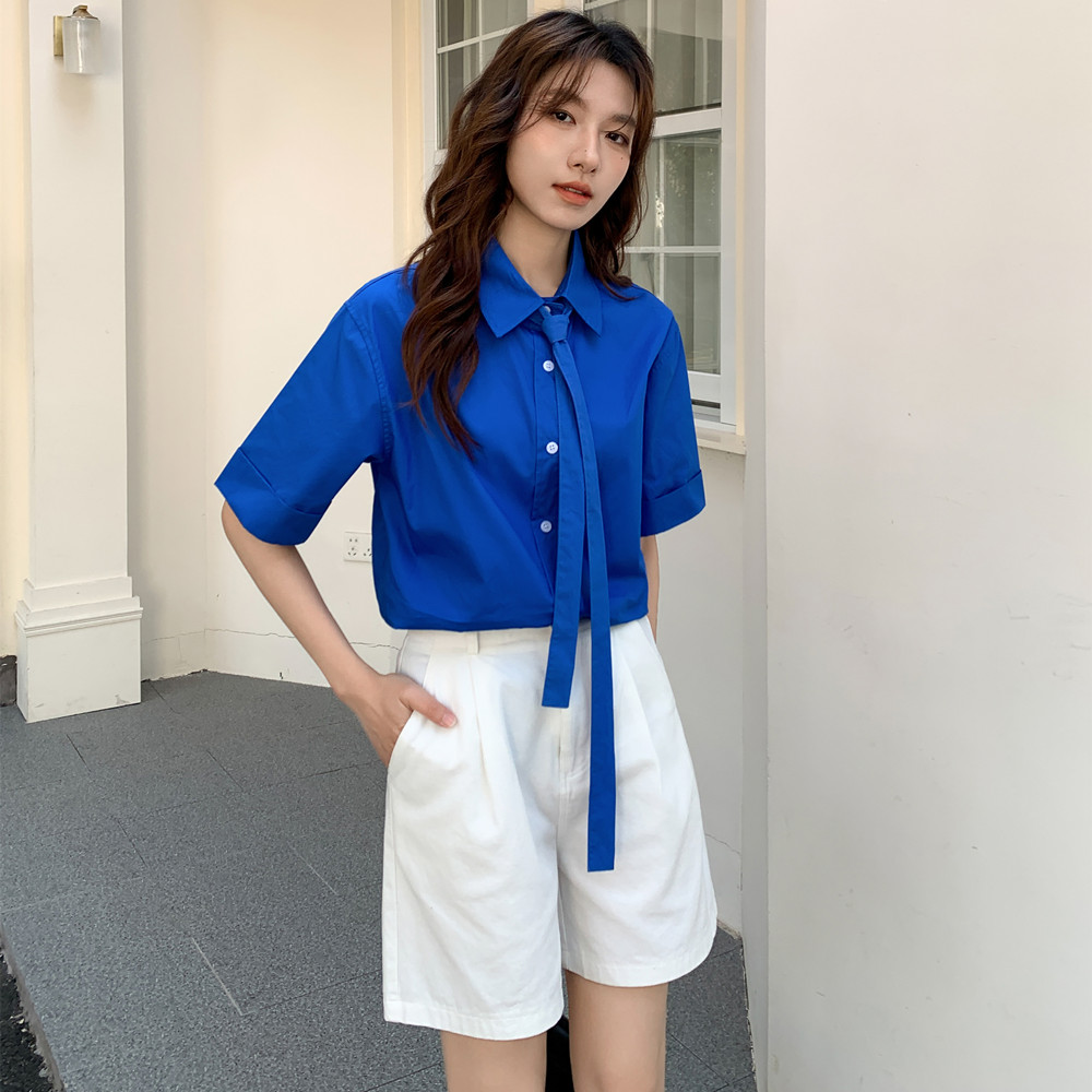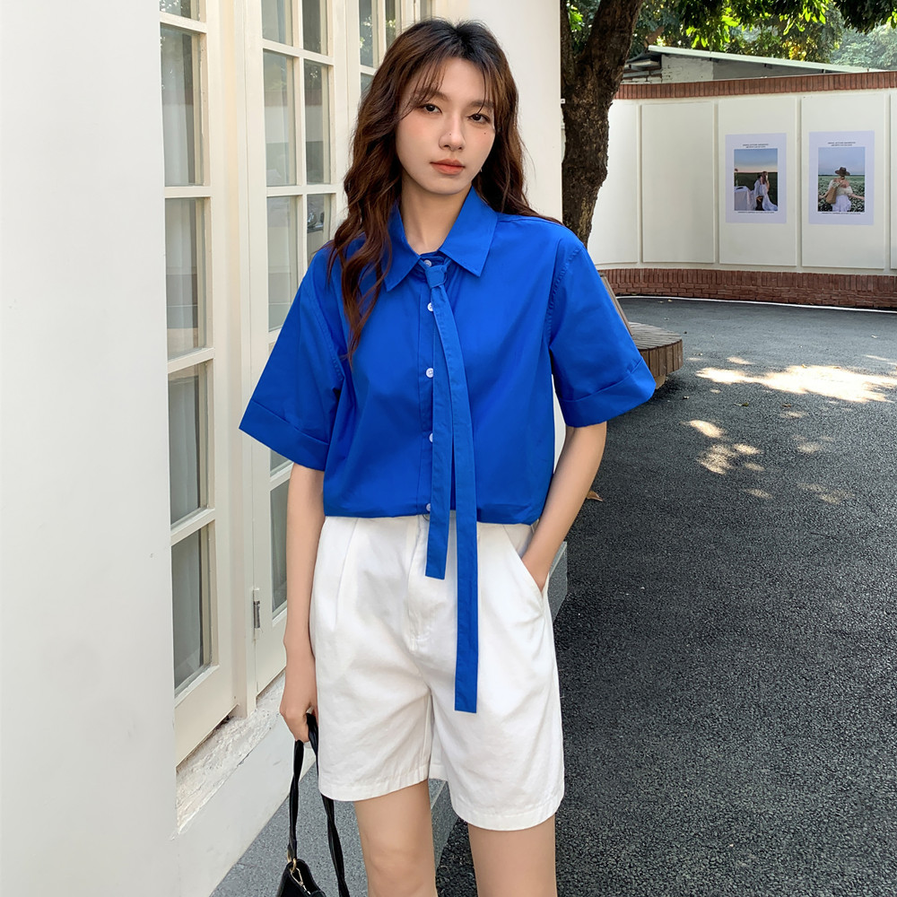 实拍 克莱因蓝短袖衬衫女夏季高级感气质百搭上衣洋气衬配领带