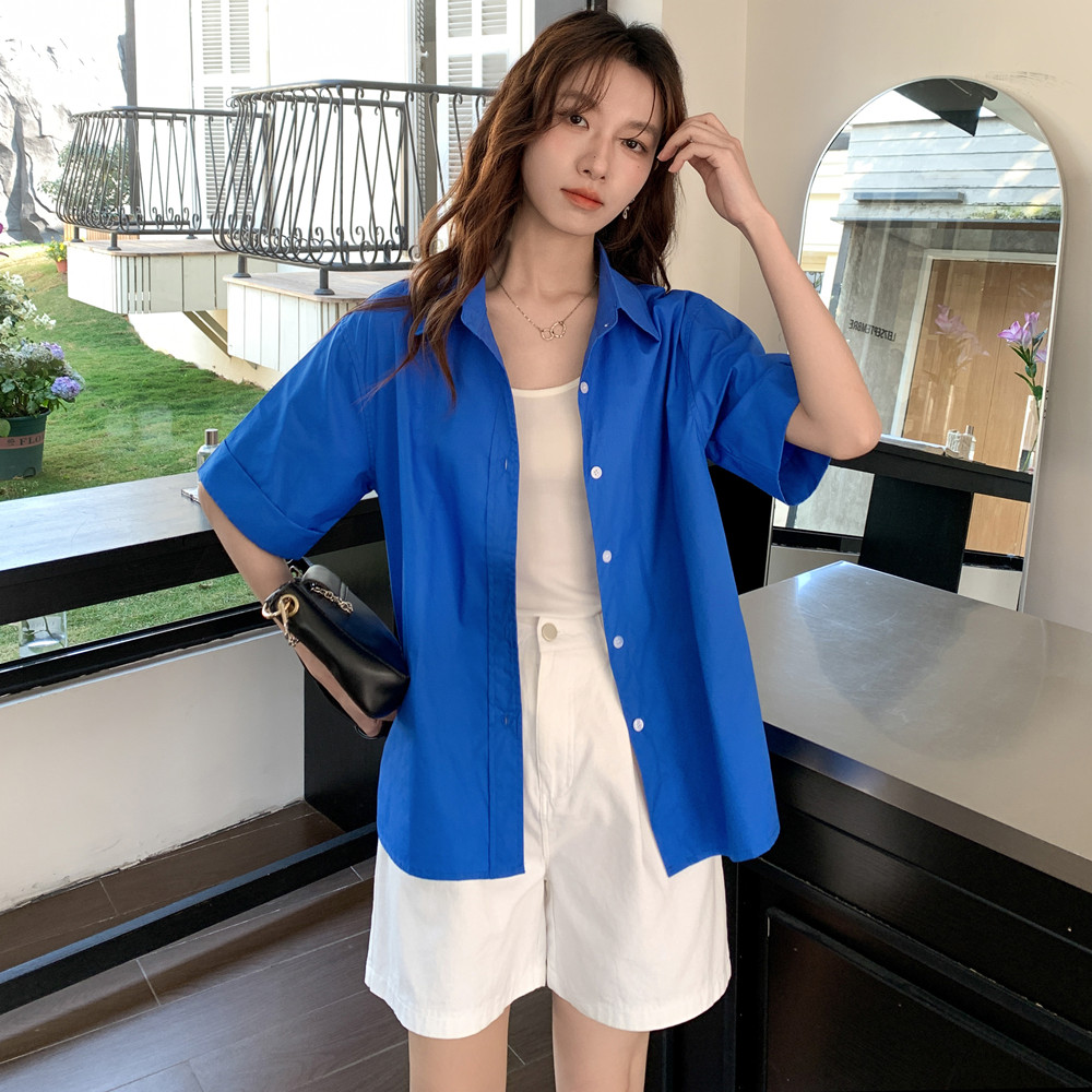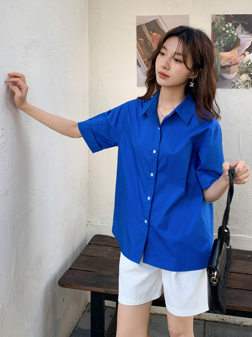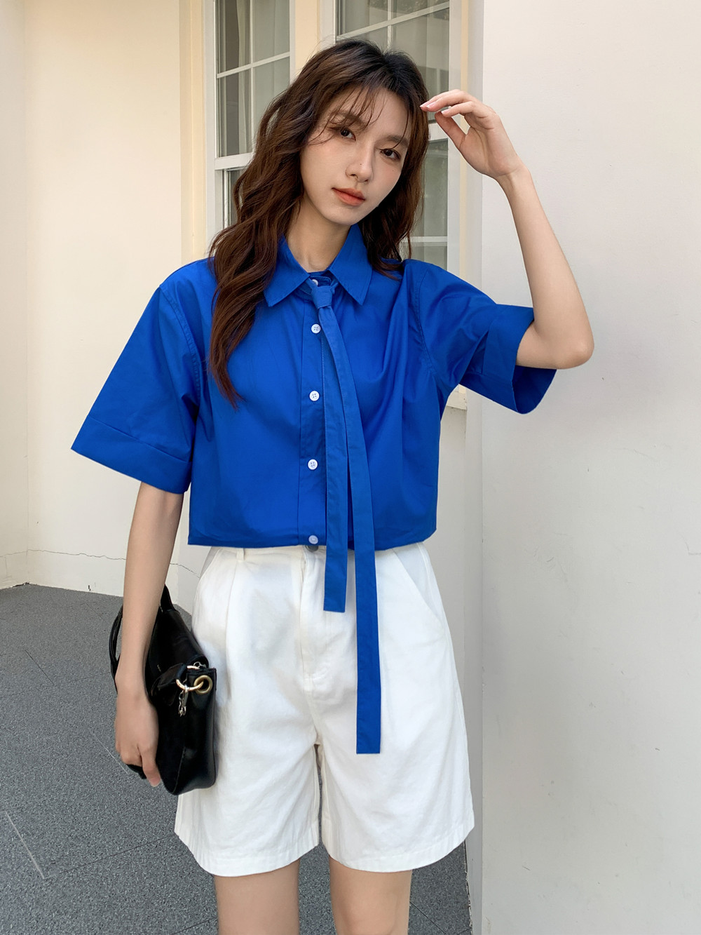 实拍 克莱因蓝短袖衬衫女夏季高级感气质百搭上衣洋气衬配领带