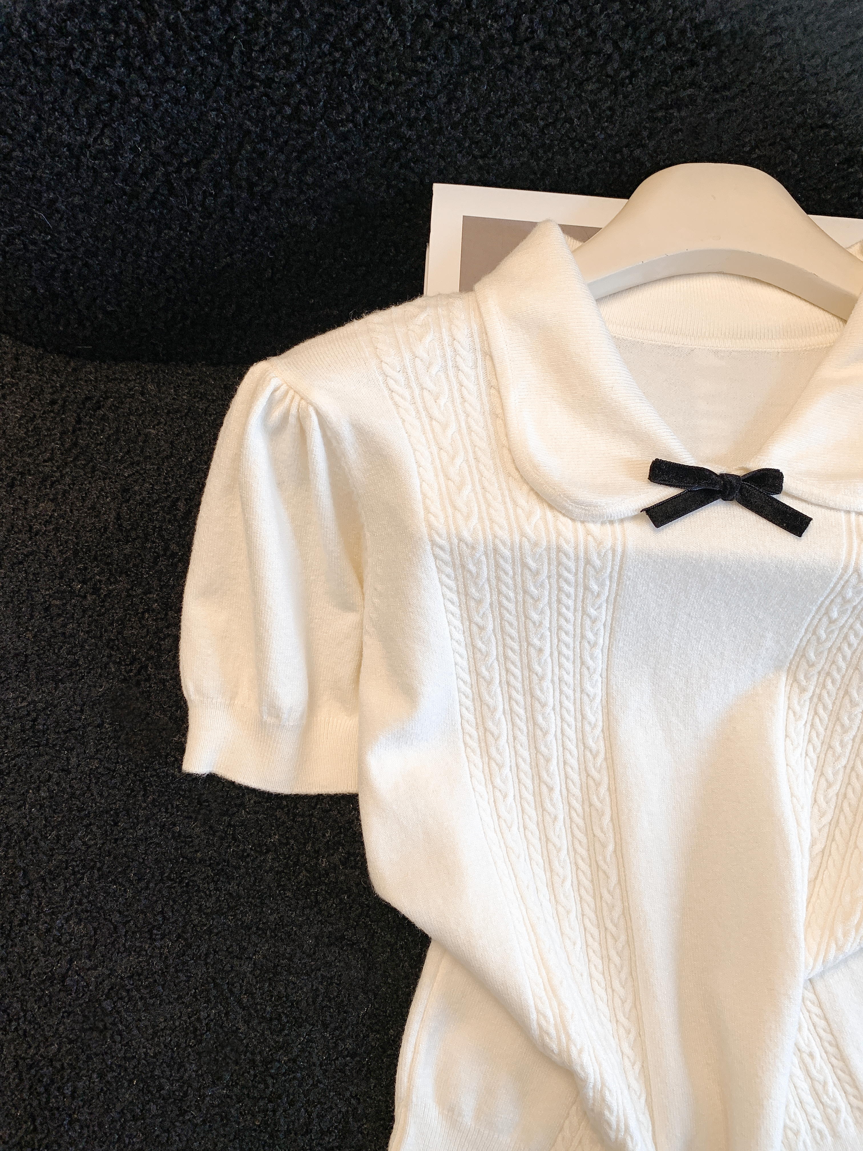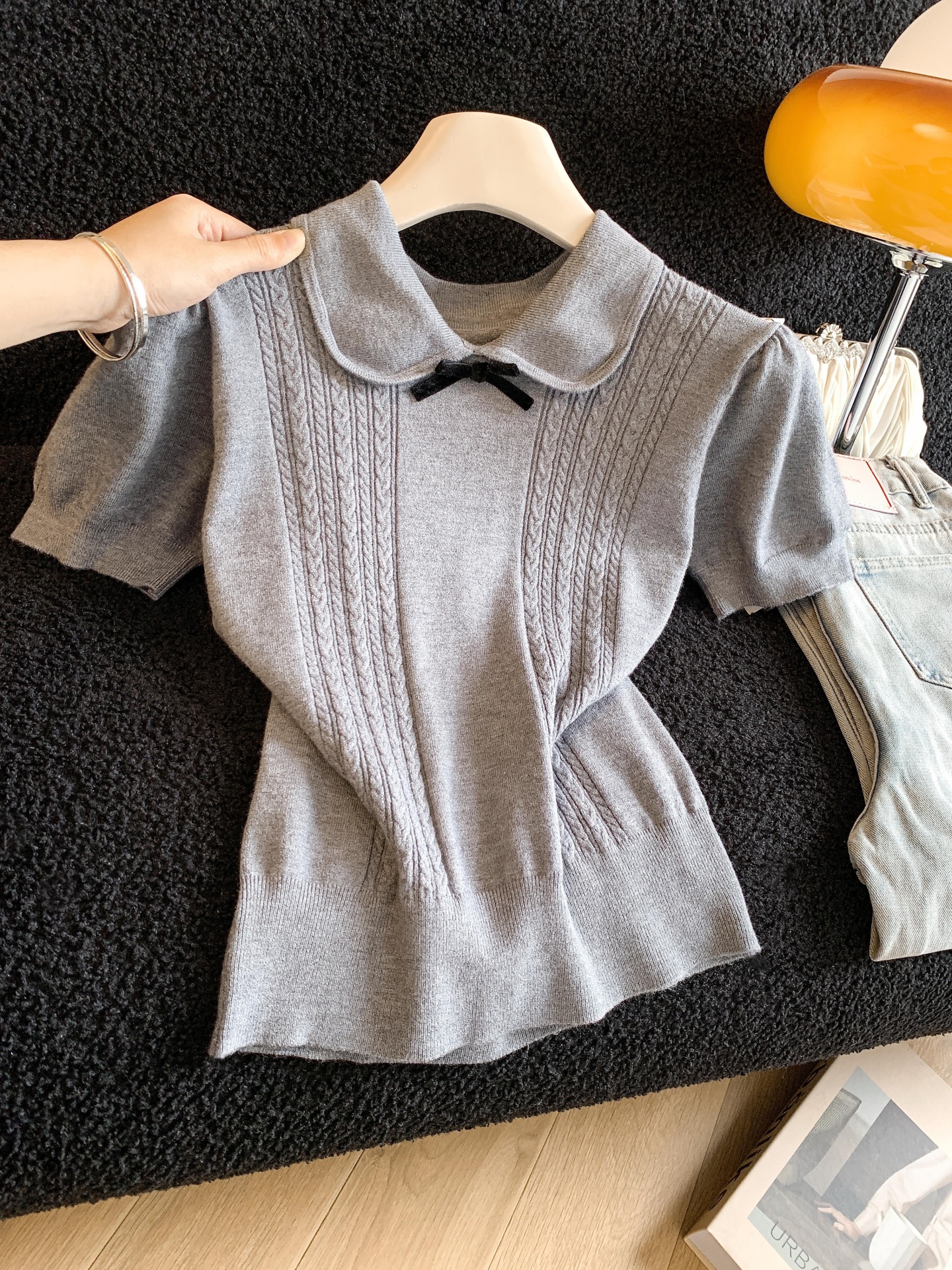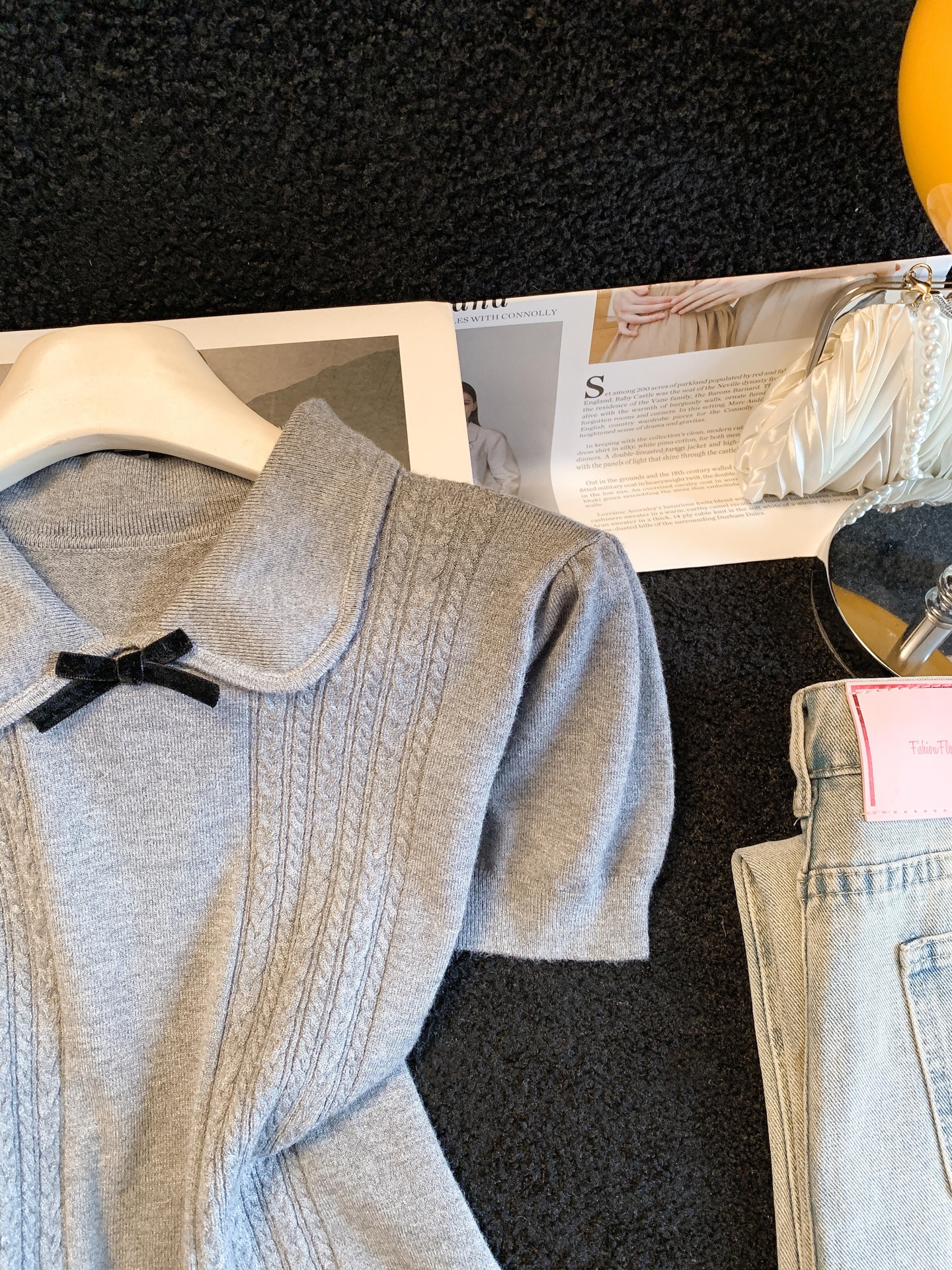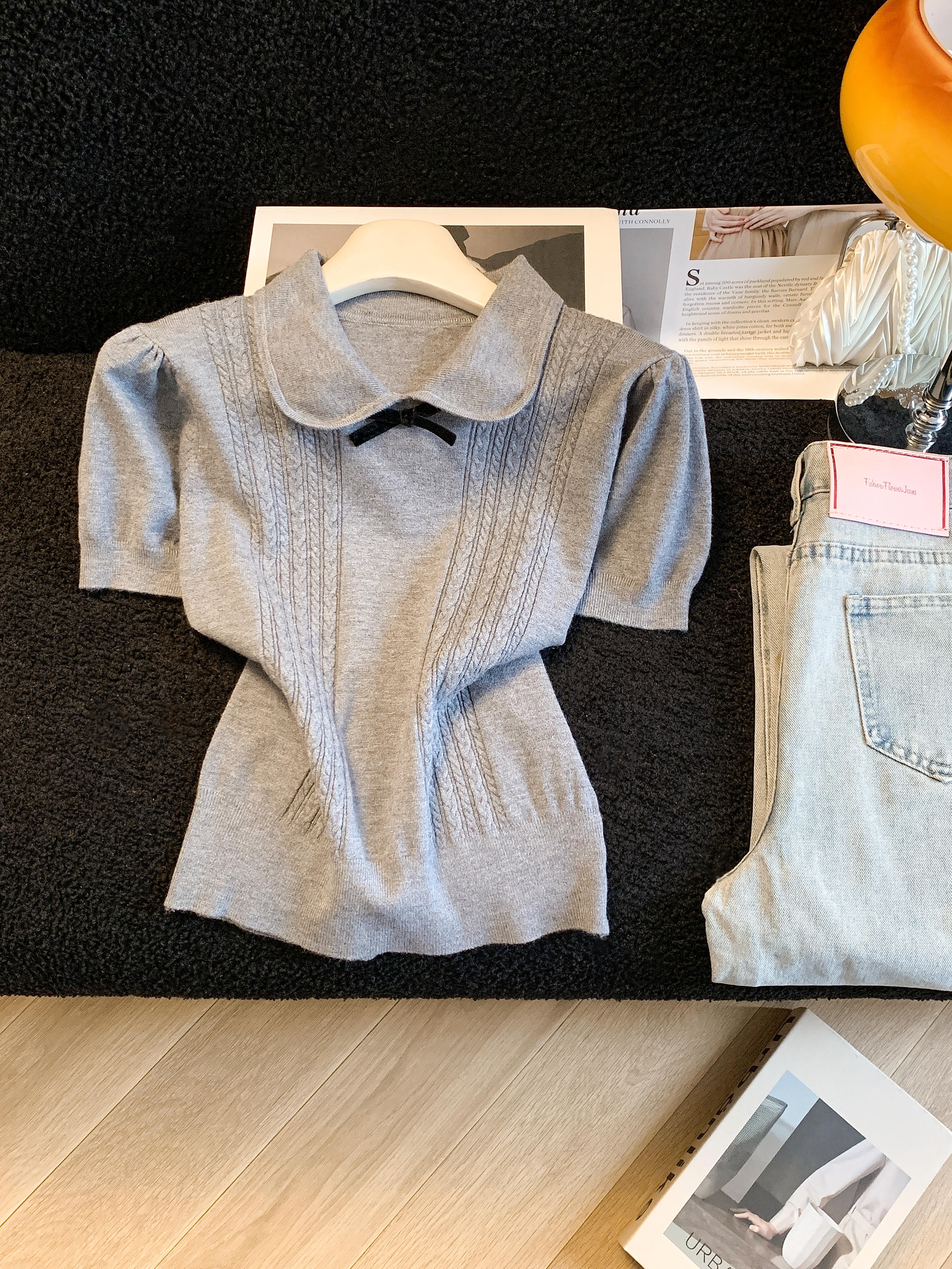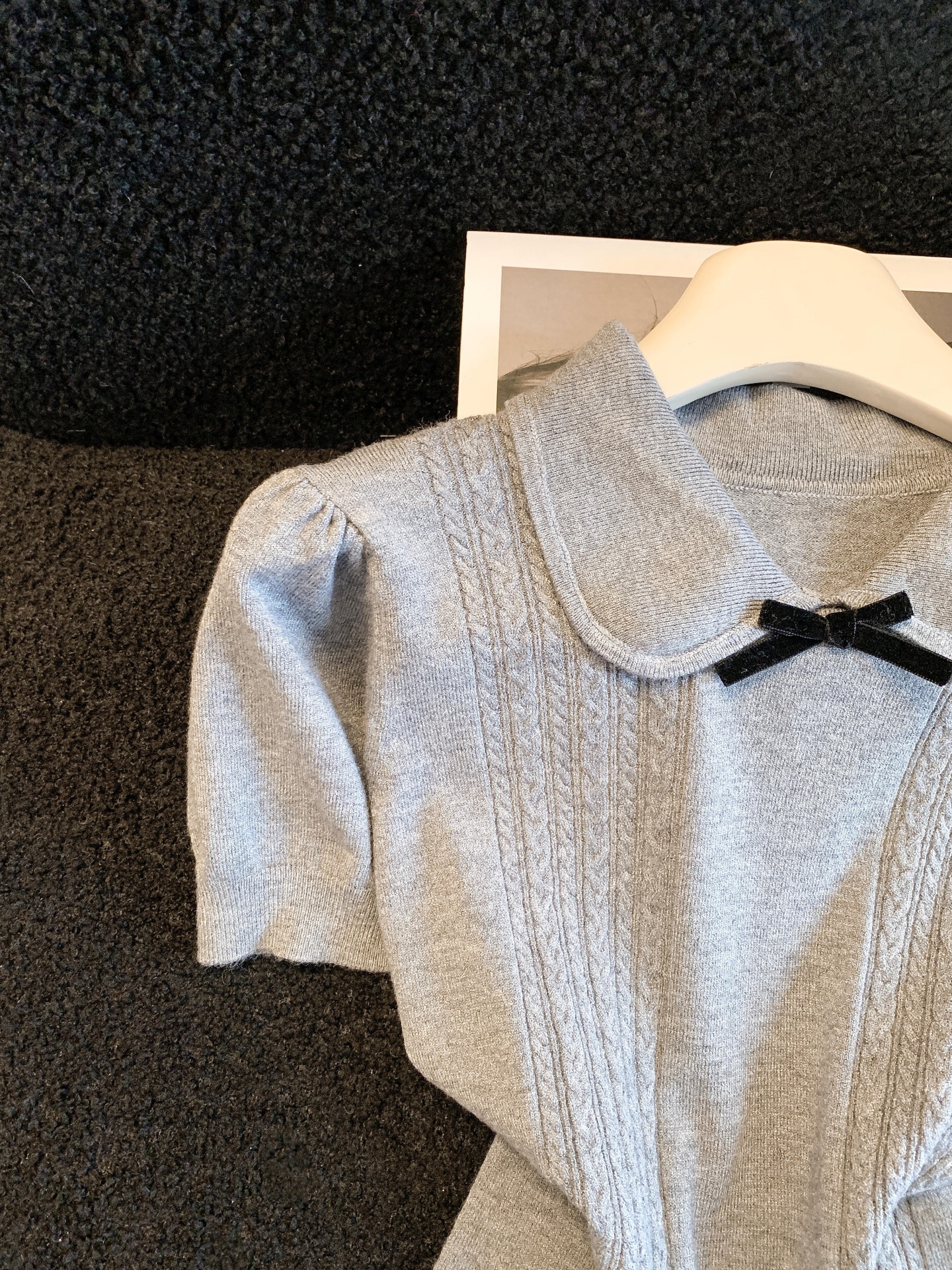 实拍~2026新款灰色娃娃领蝴蝶结针织短袖T恤掐腰别致小上衣女夏季