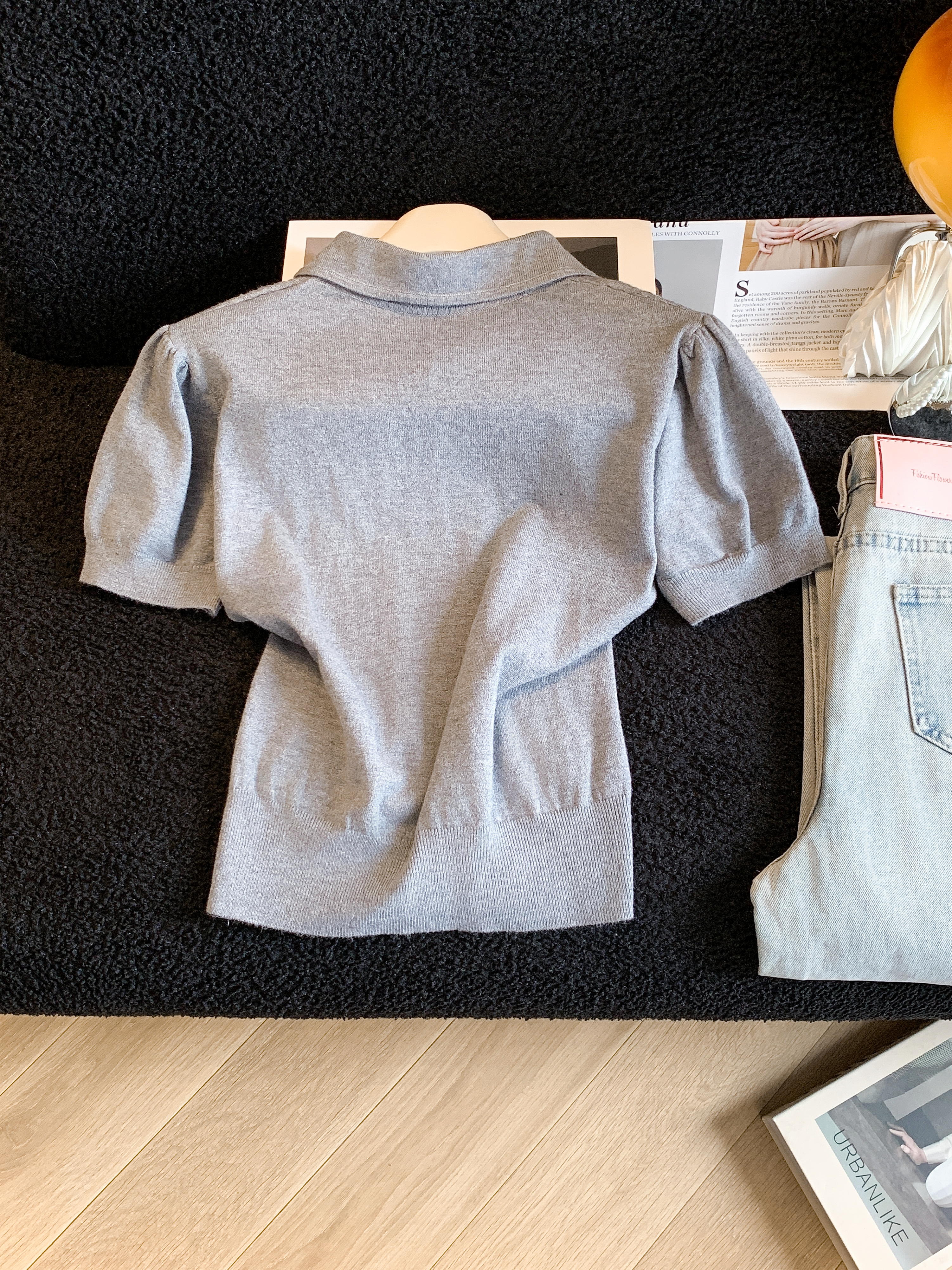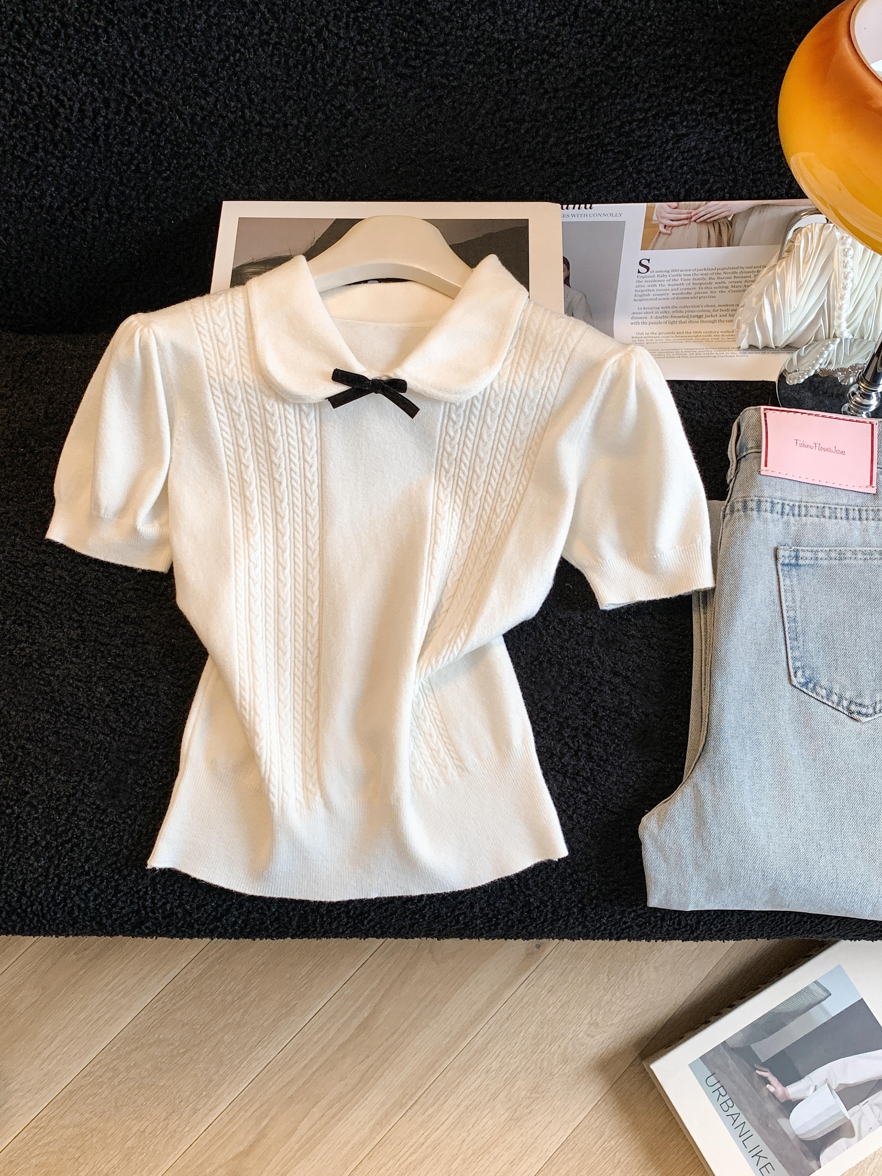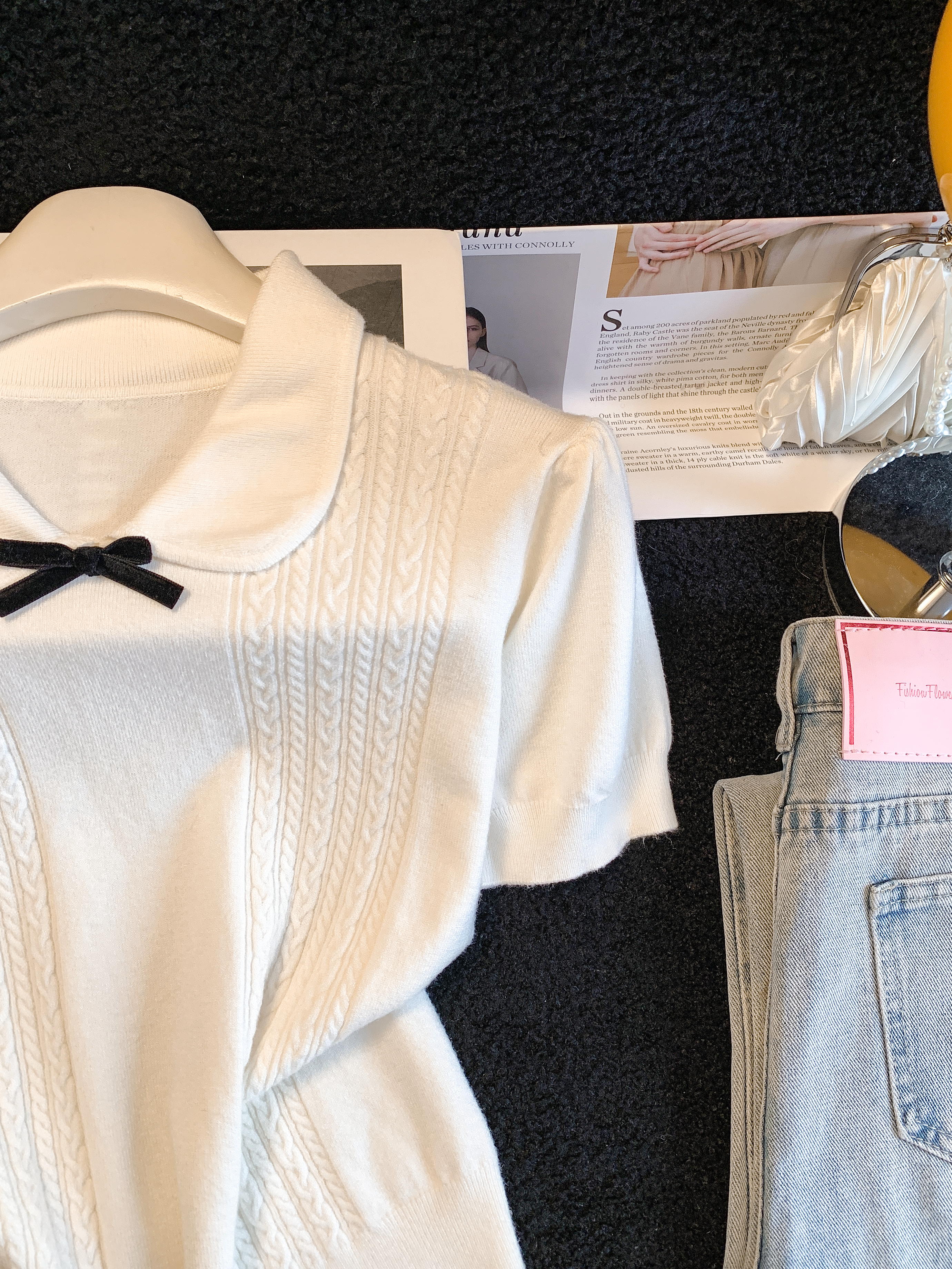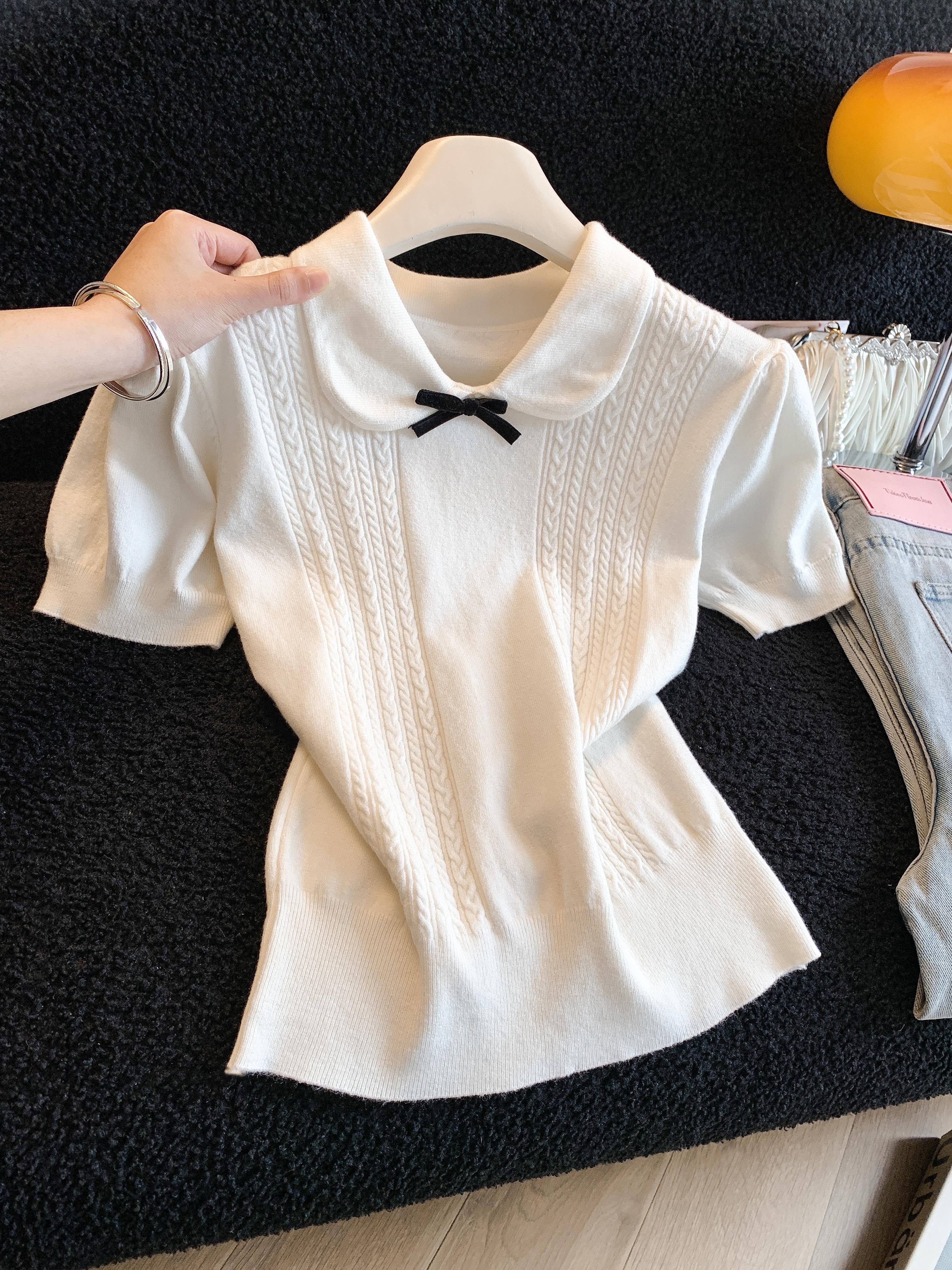 实拍~2026新款灰色娃娃领蝴蝶结针织短袖T恤掐腰别致小上衣女夏季