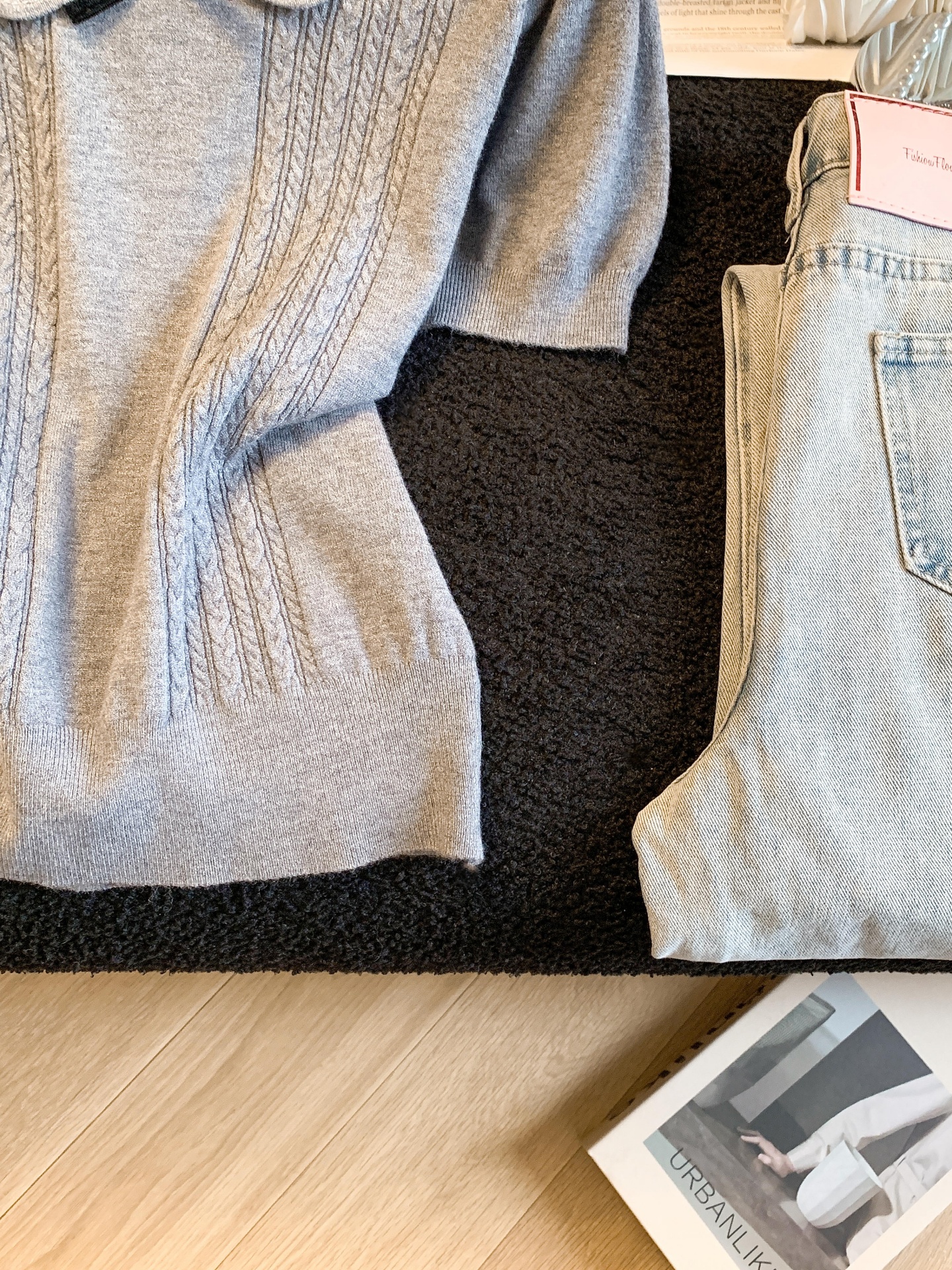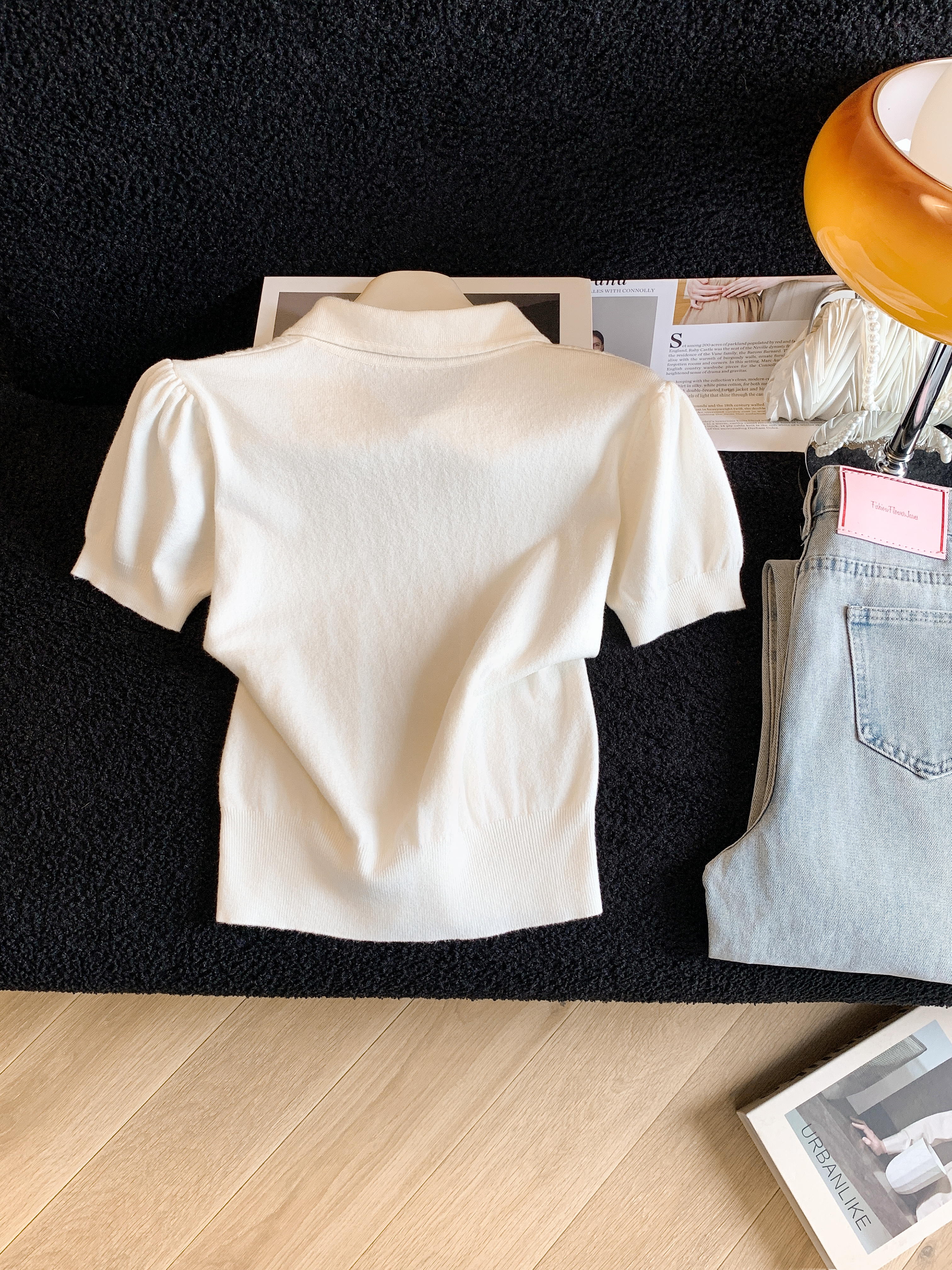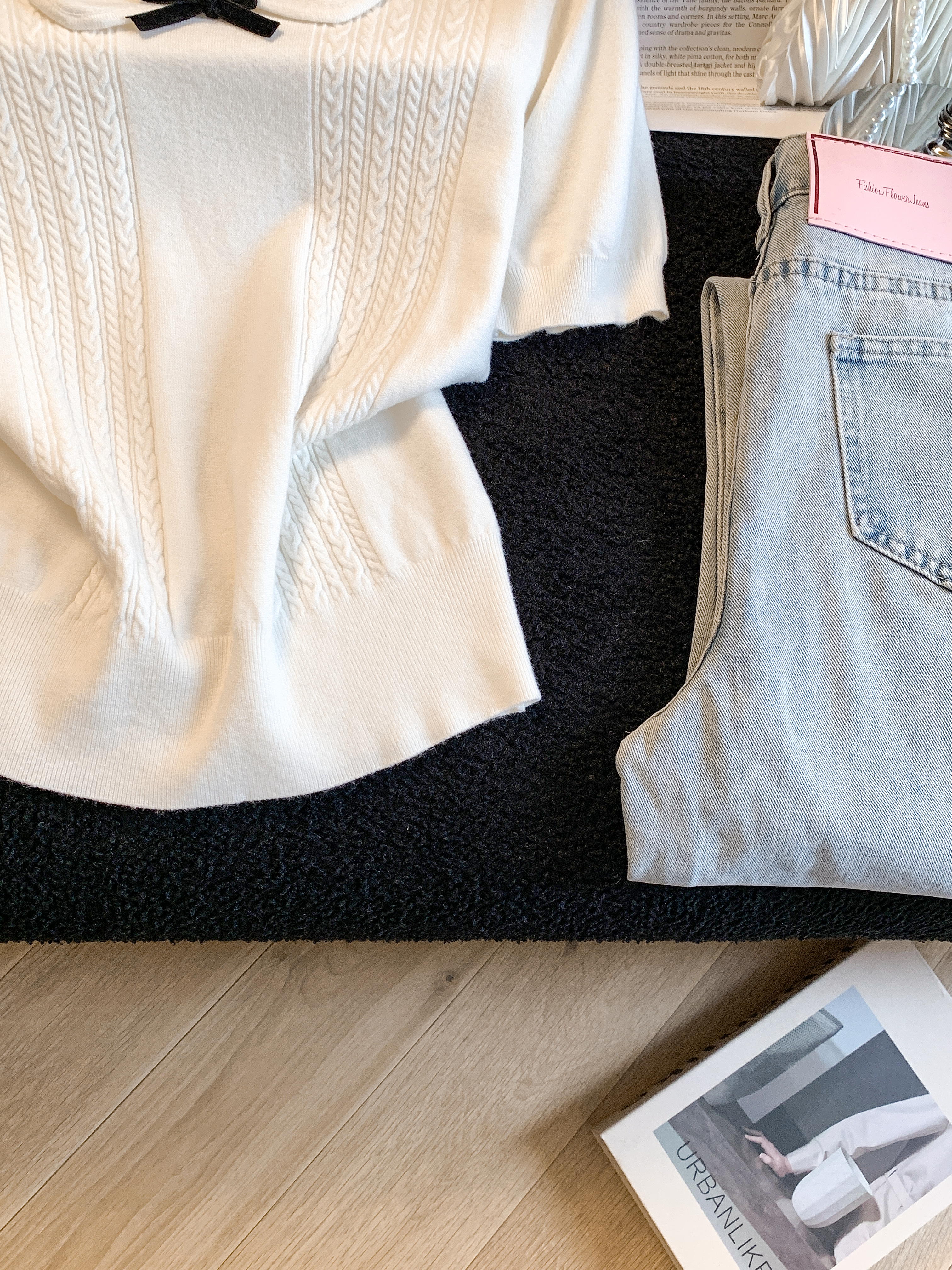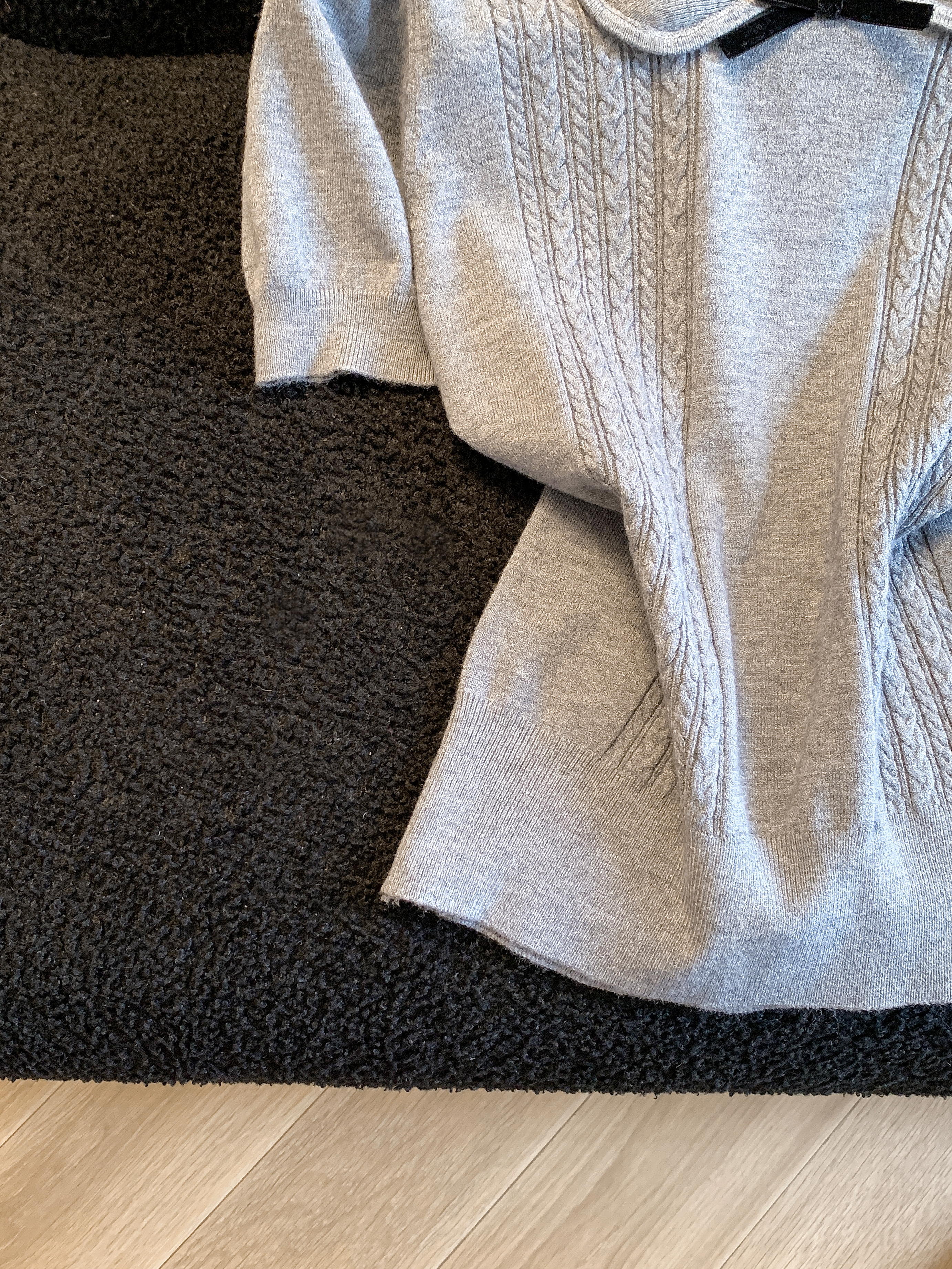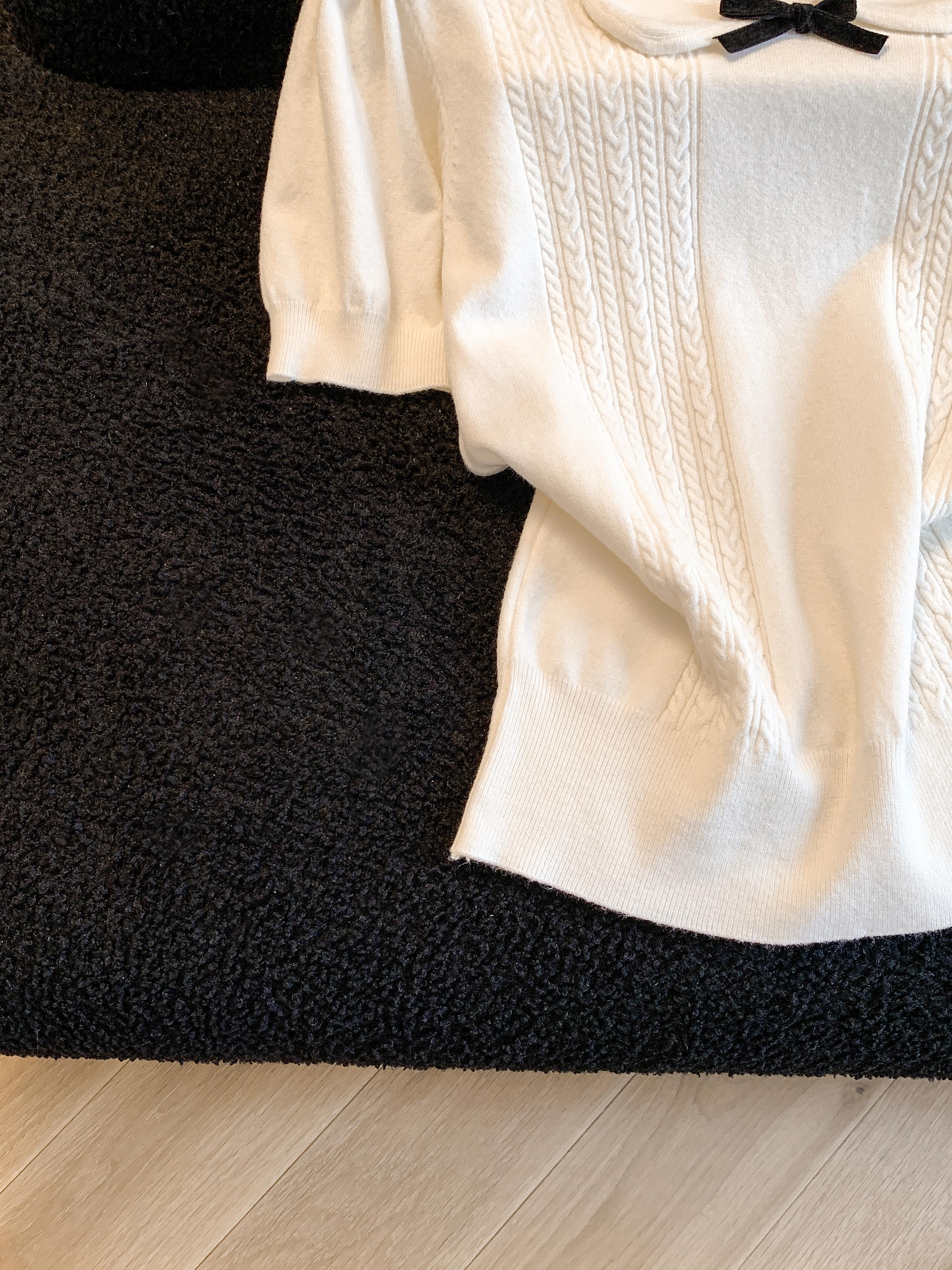 实拍~2026新款灰色娃娃领蝴蝶结针织短袖T恤掐腰别致小上衣女夏季