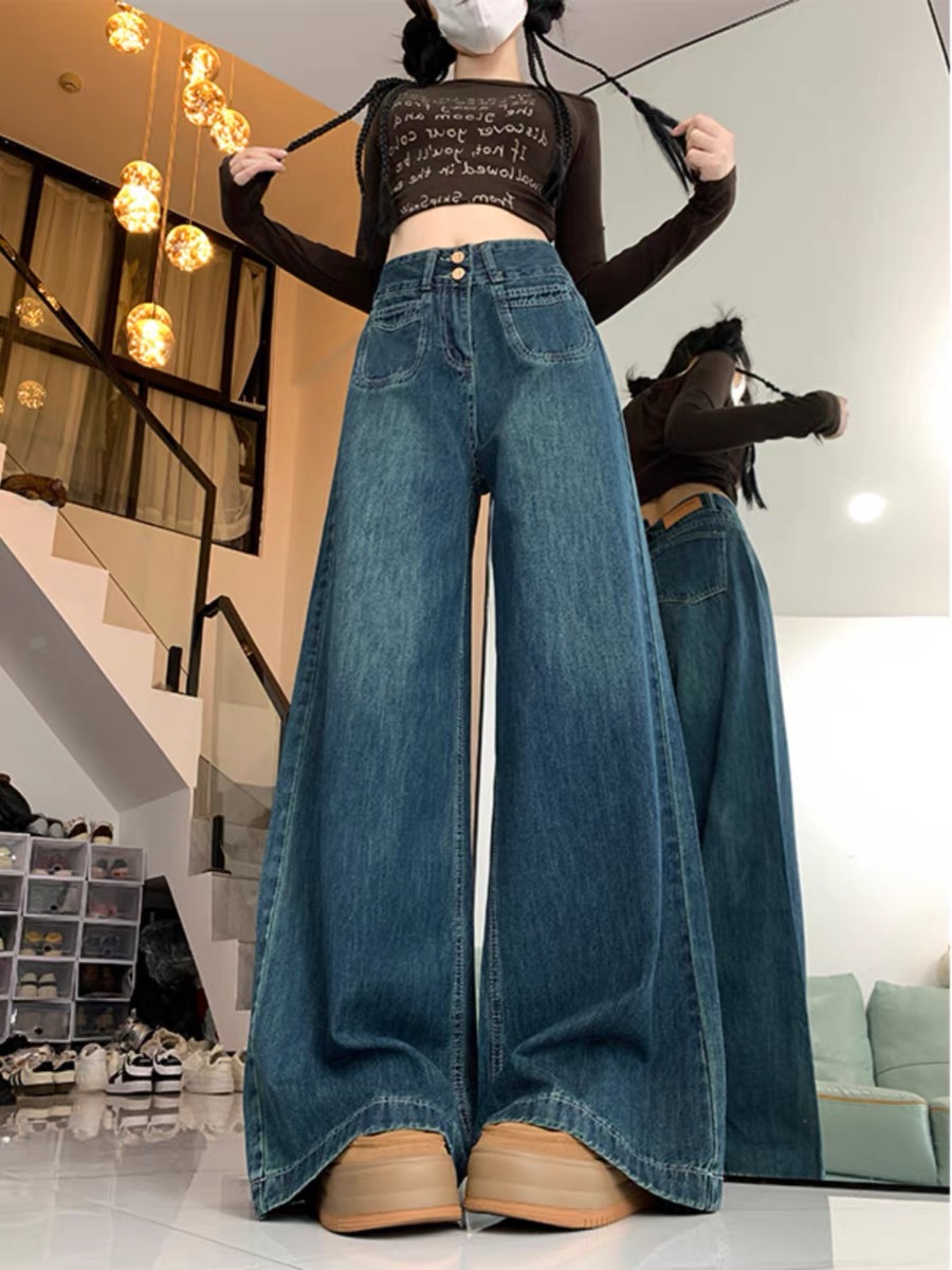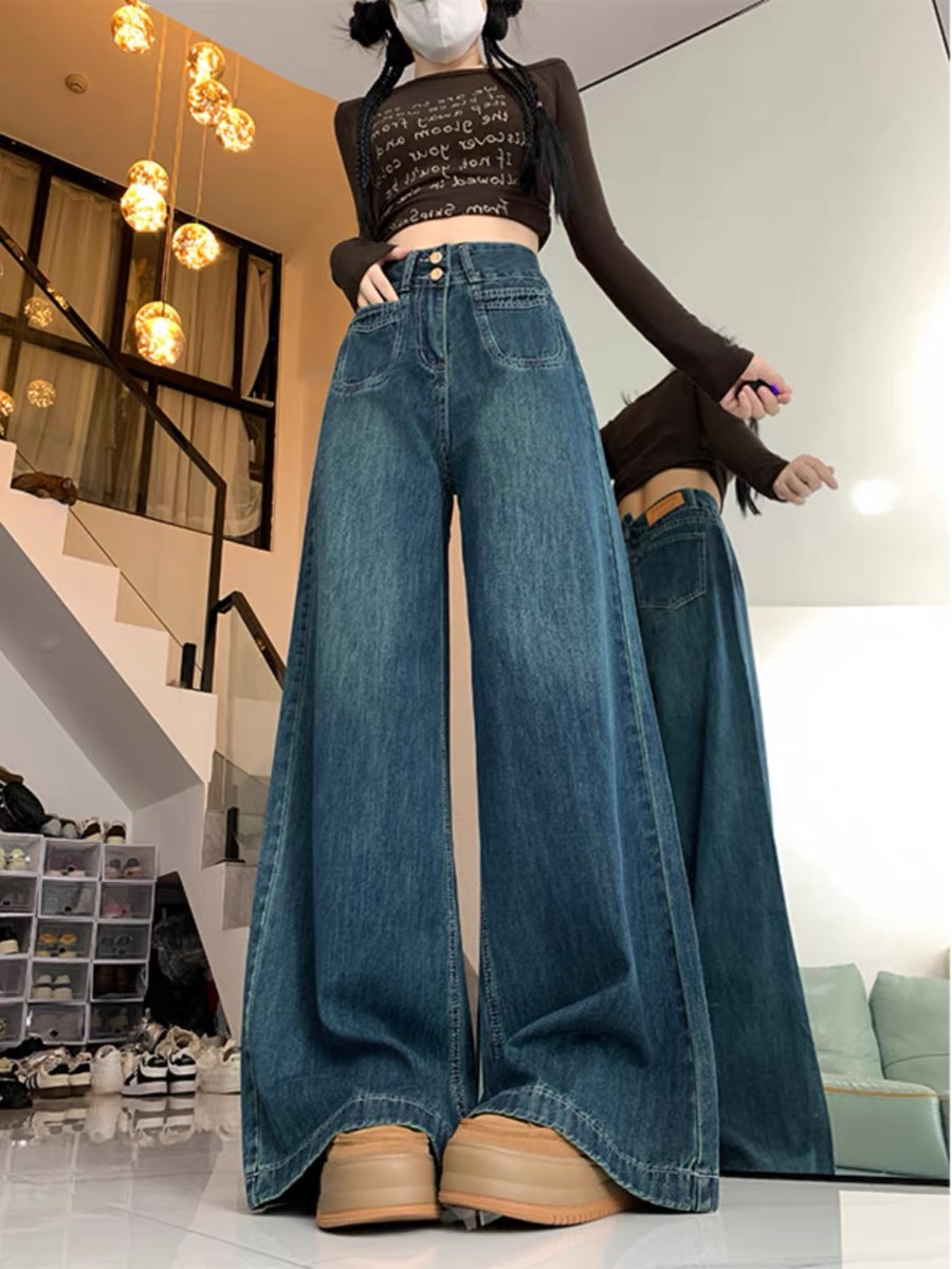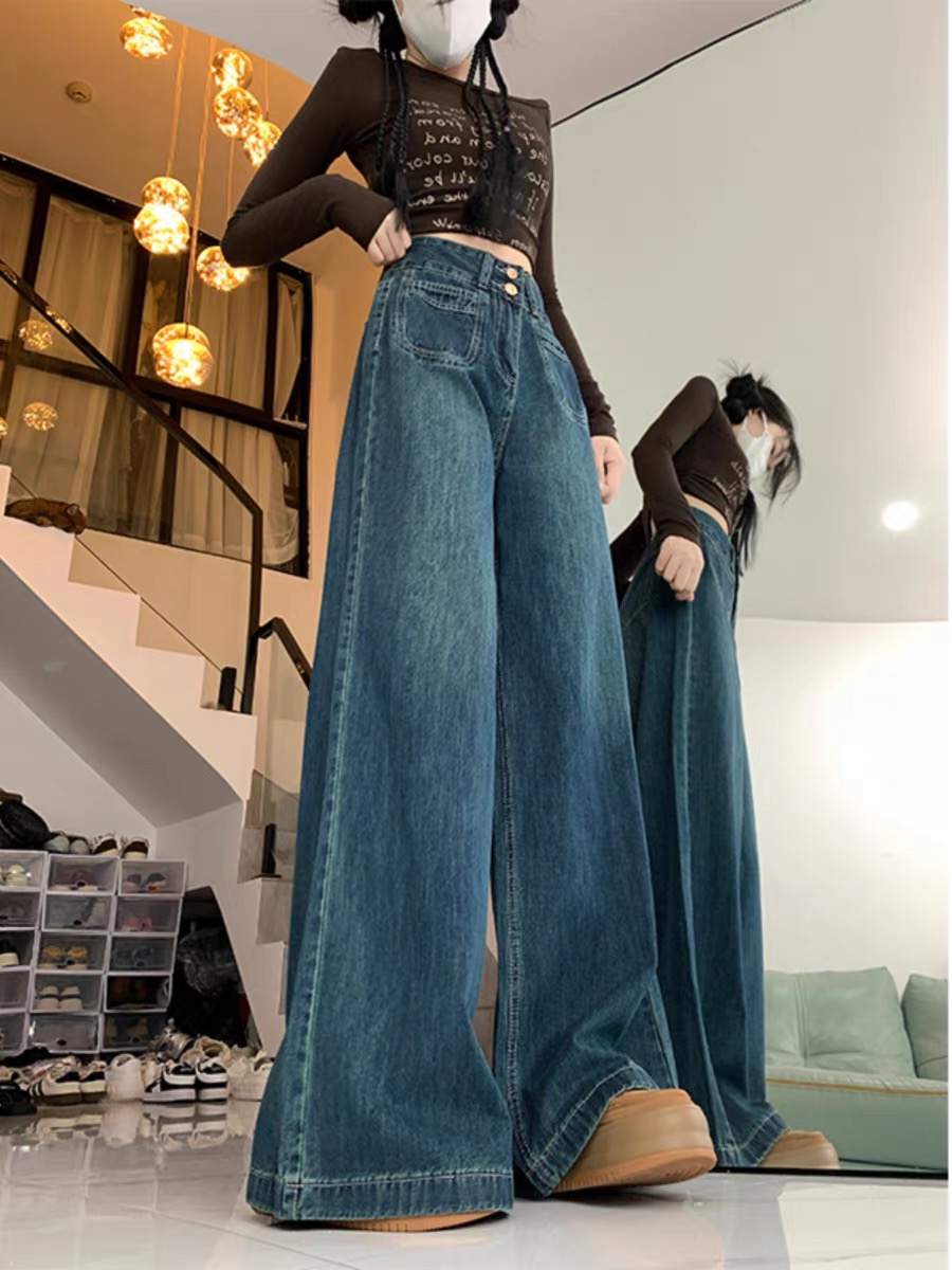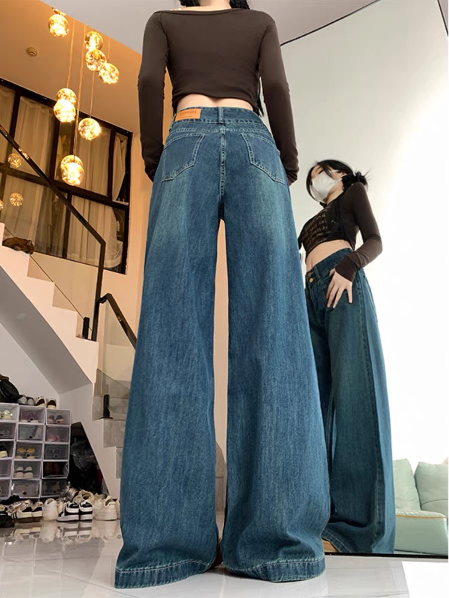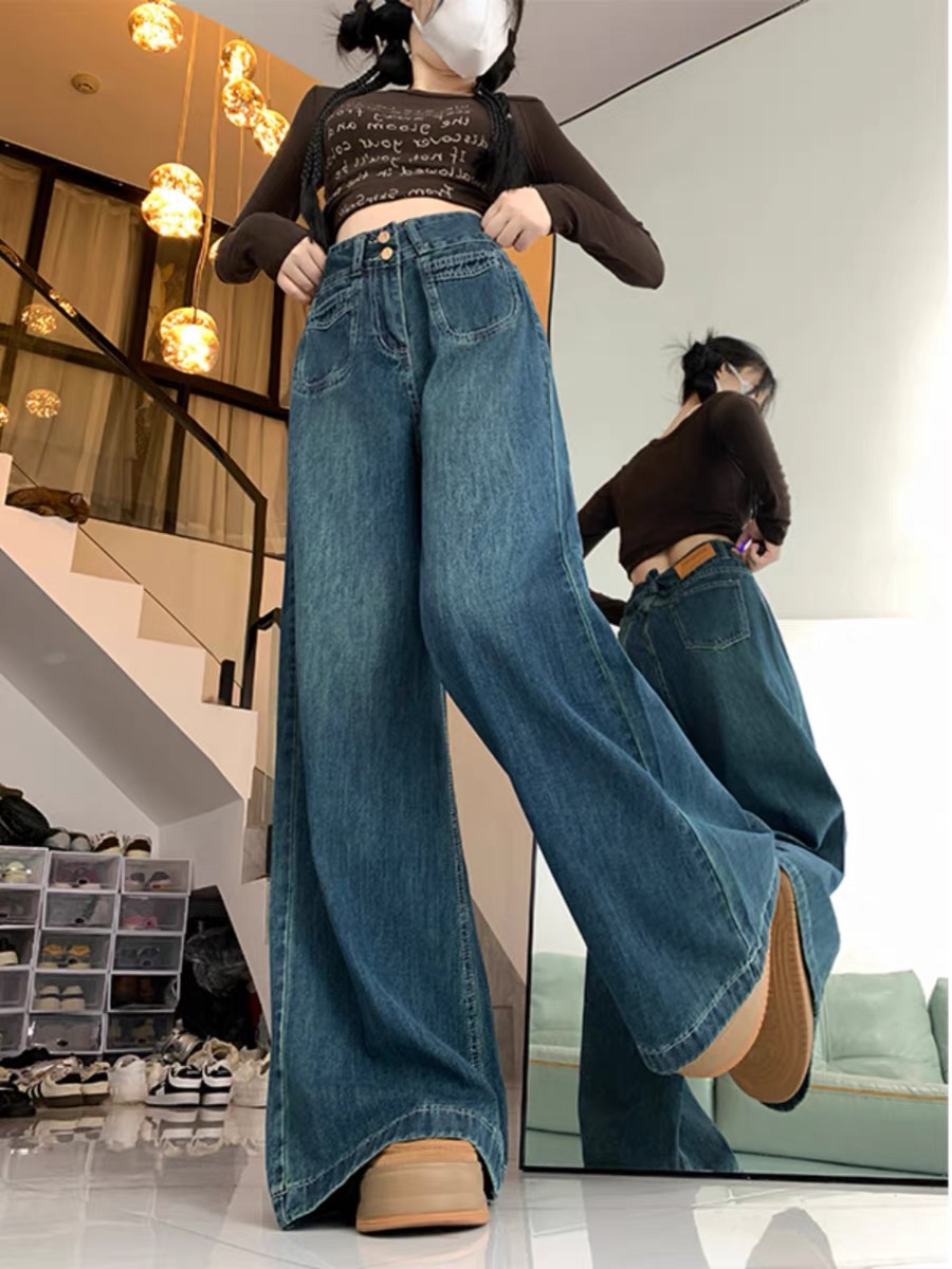 实拍秋季复古高腰喇叭裤大码牛仔裤女宽松胖MM拖地阔腿裤