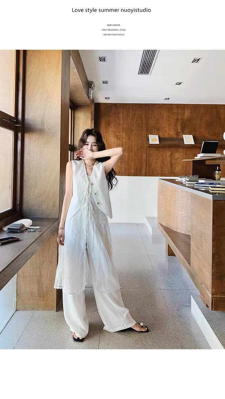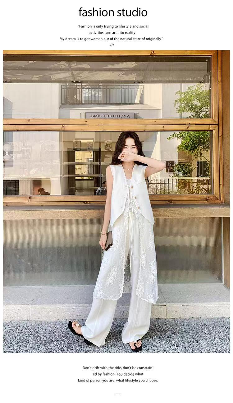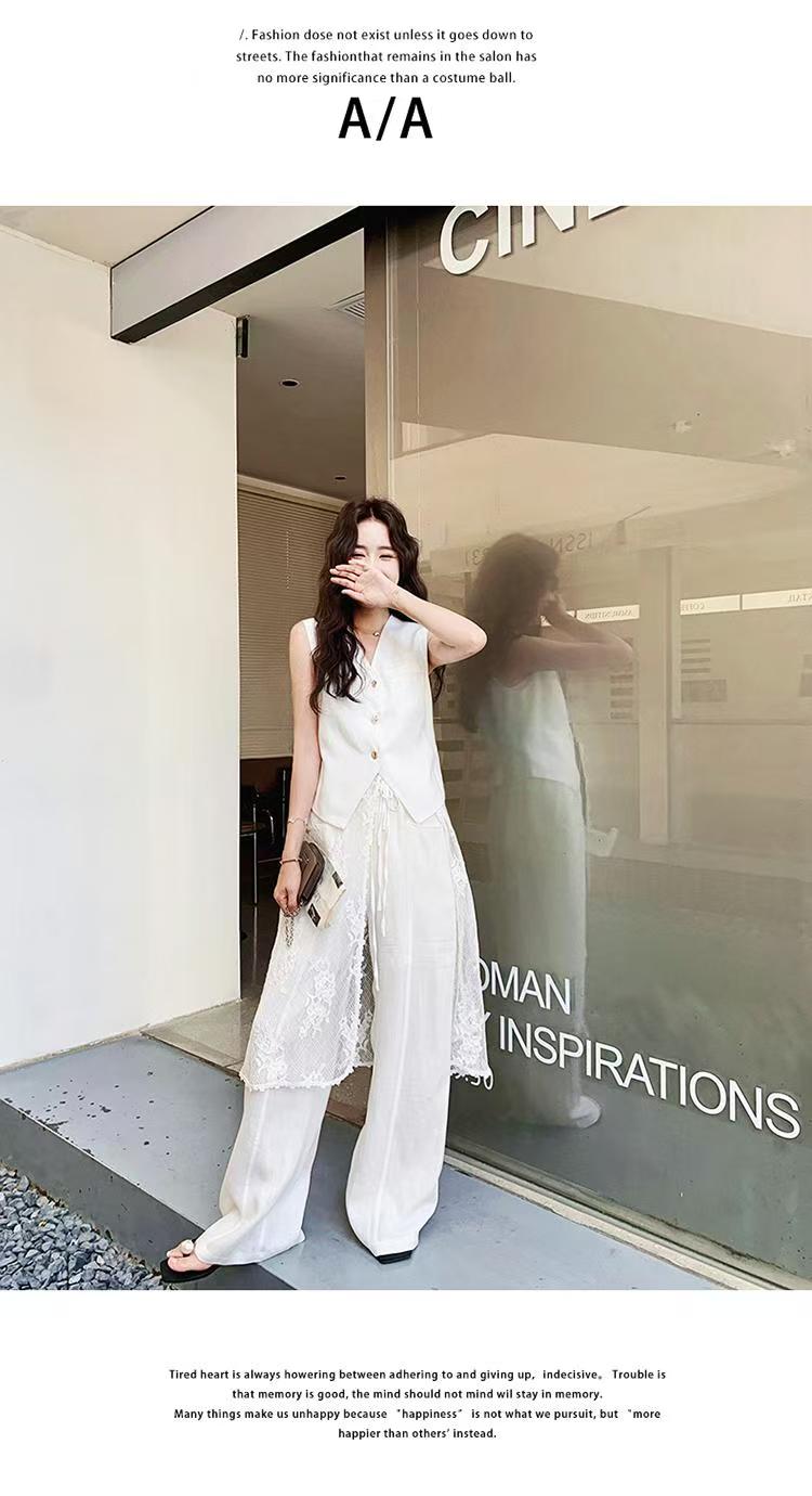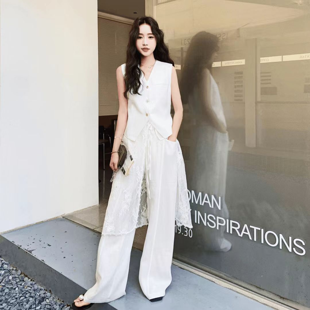 又A又飒松弛感套装裤女2025年夏季新款蕾丝罩衫马甲阔腿裤三件套