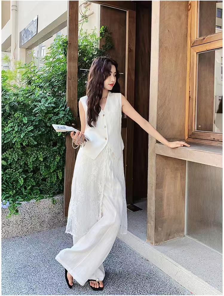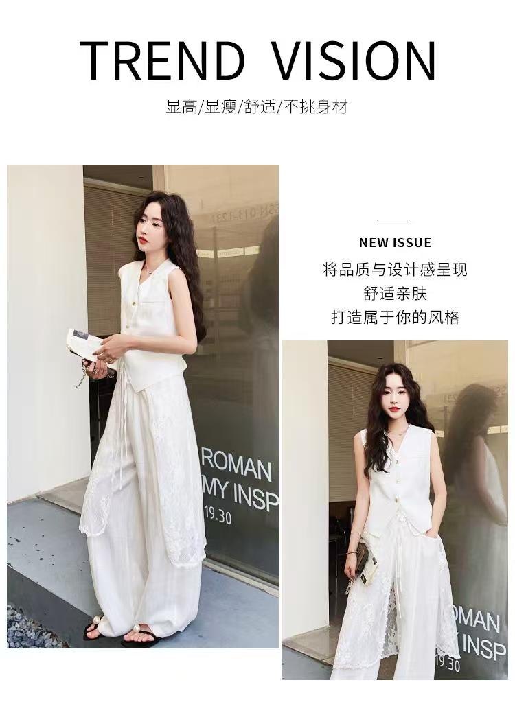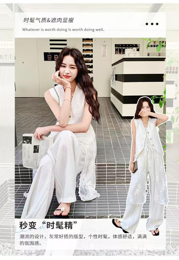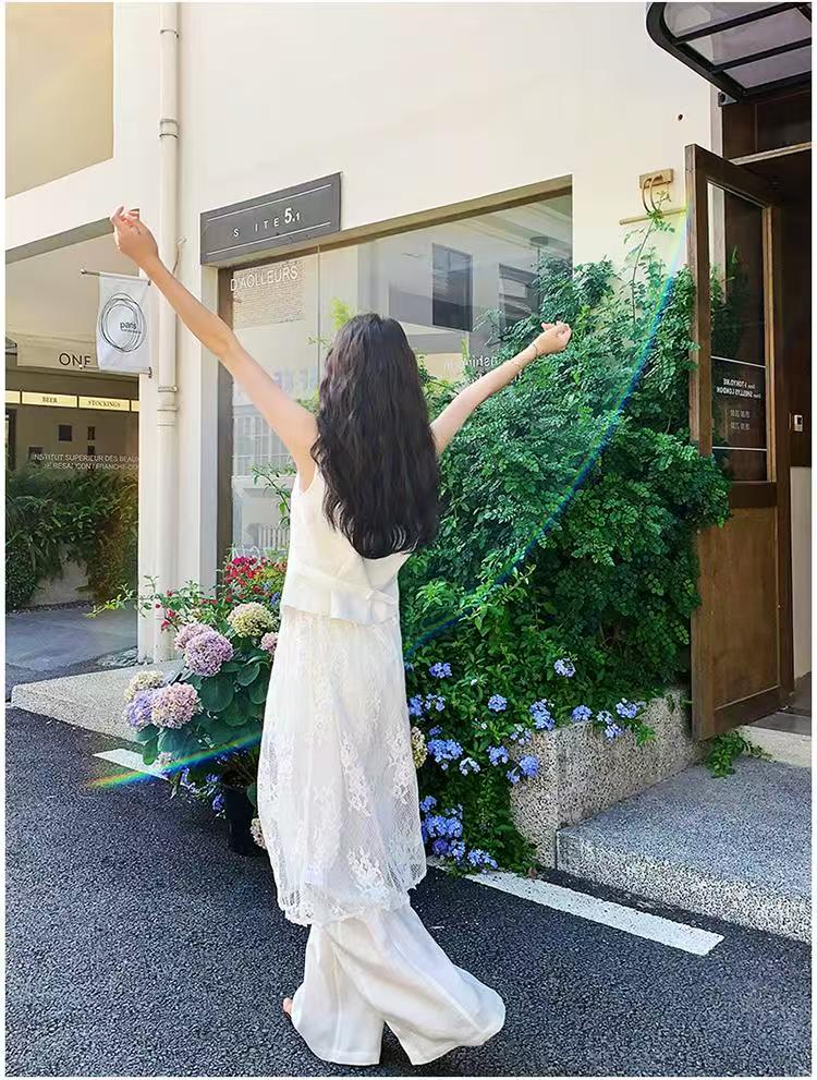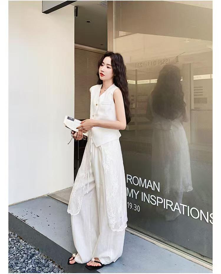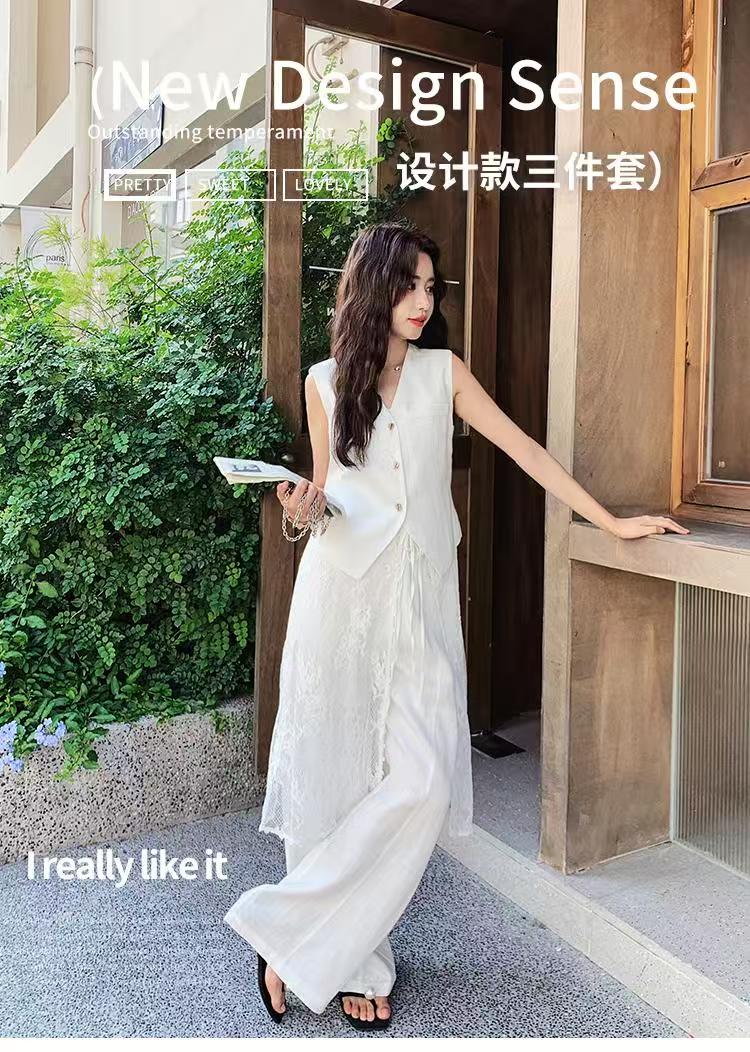 又A又飒松弛感套装裤女2025年夏季新款蕾丝罩衫马甲阔腿裤三件套
