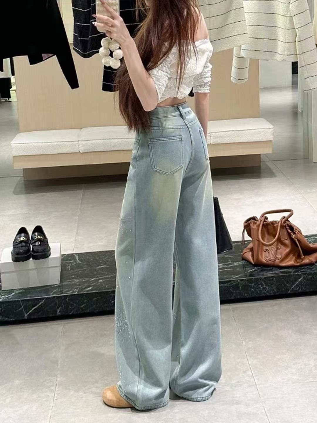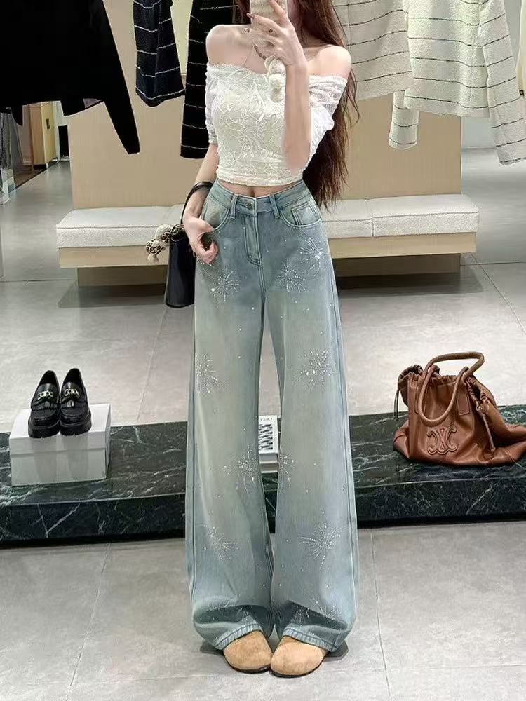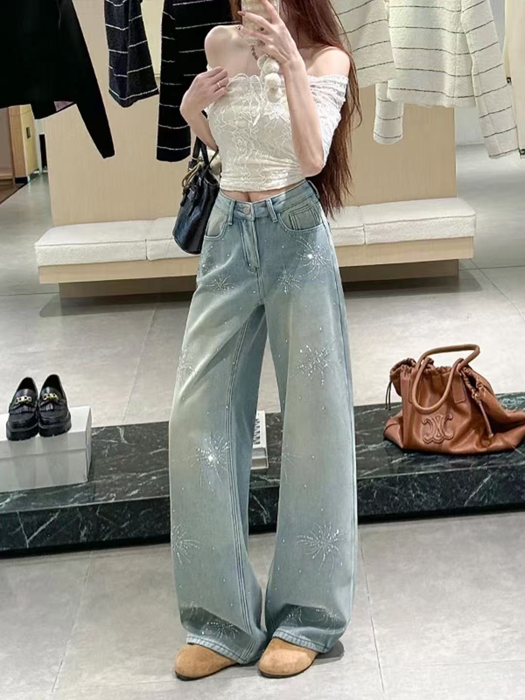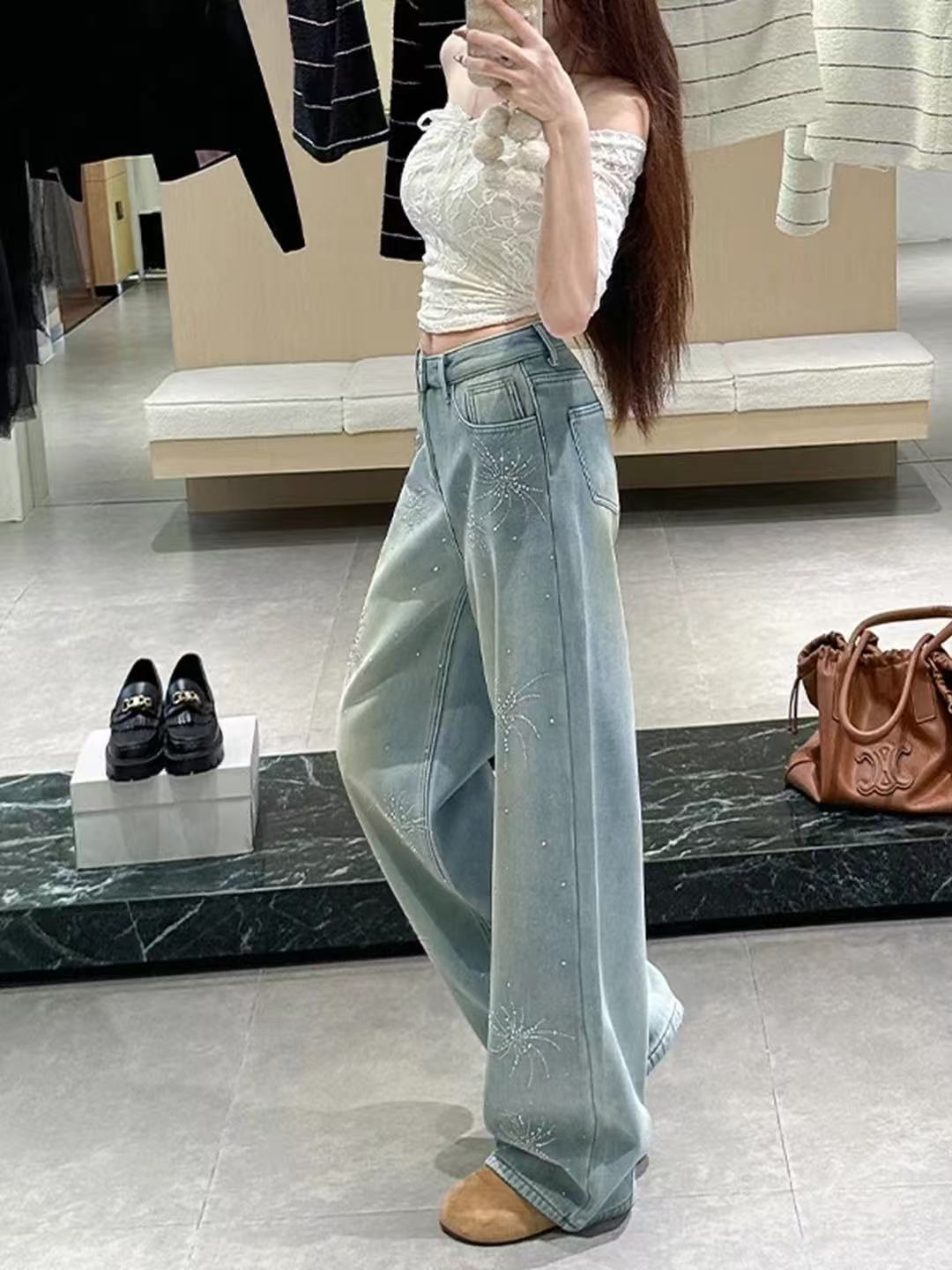 175高个子烫钻烟花阔腿牛仔裤女高腰休闲2026新款宽松直筒拖地裤