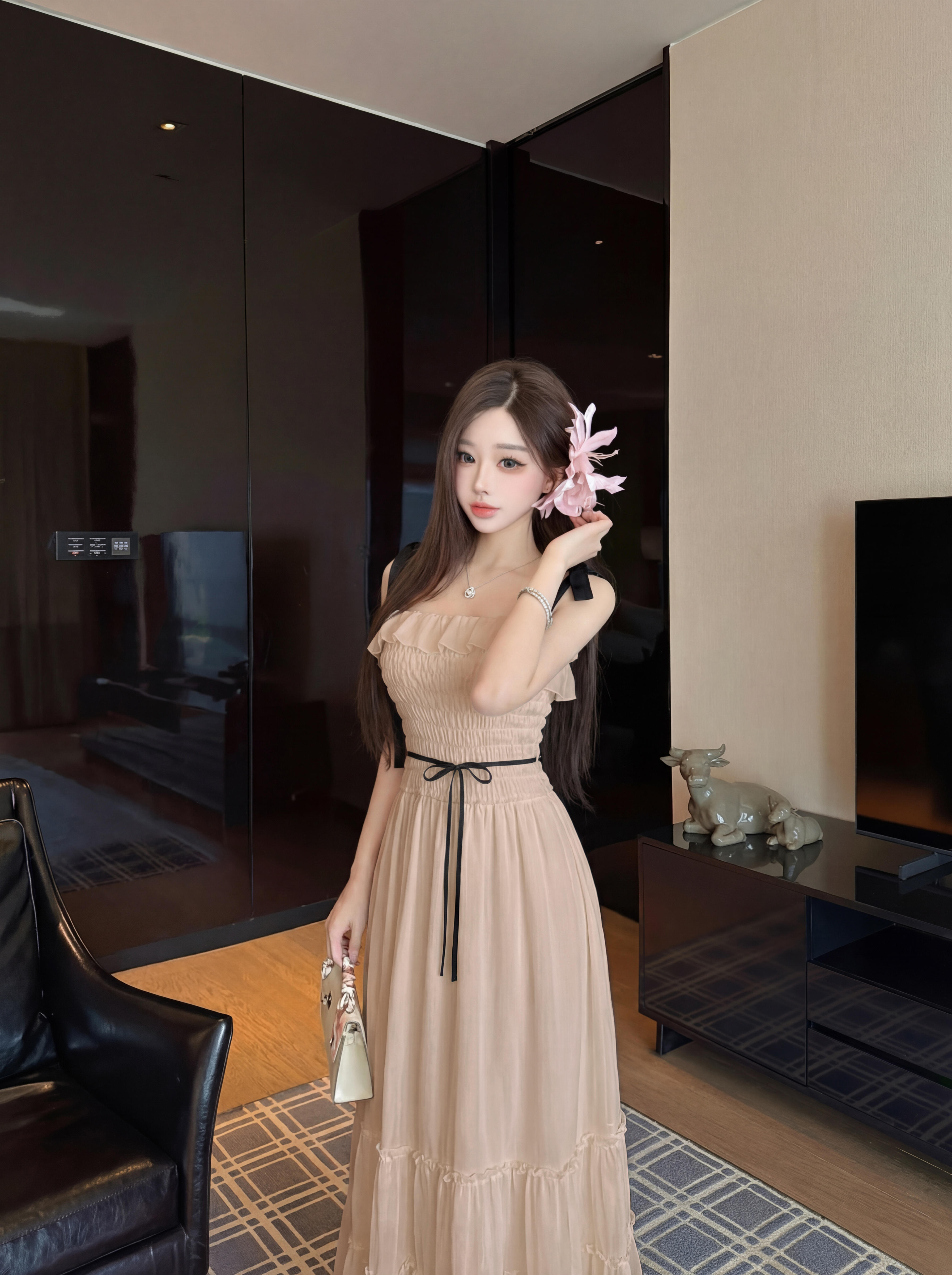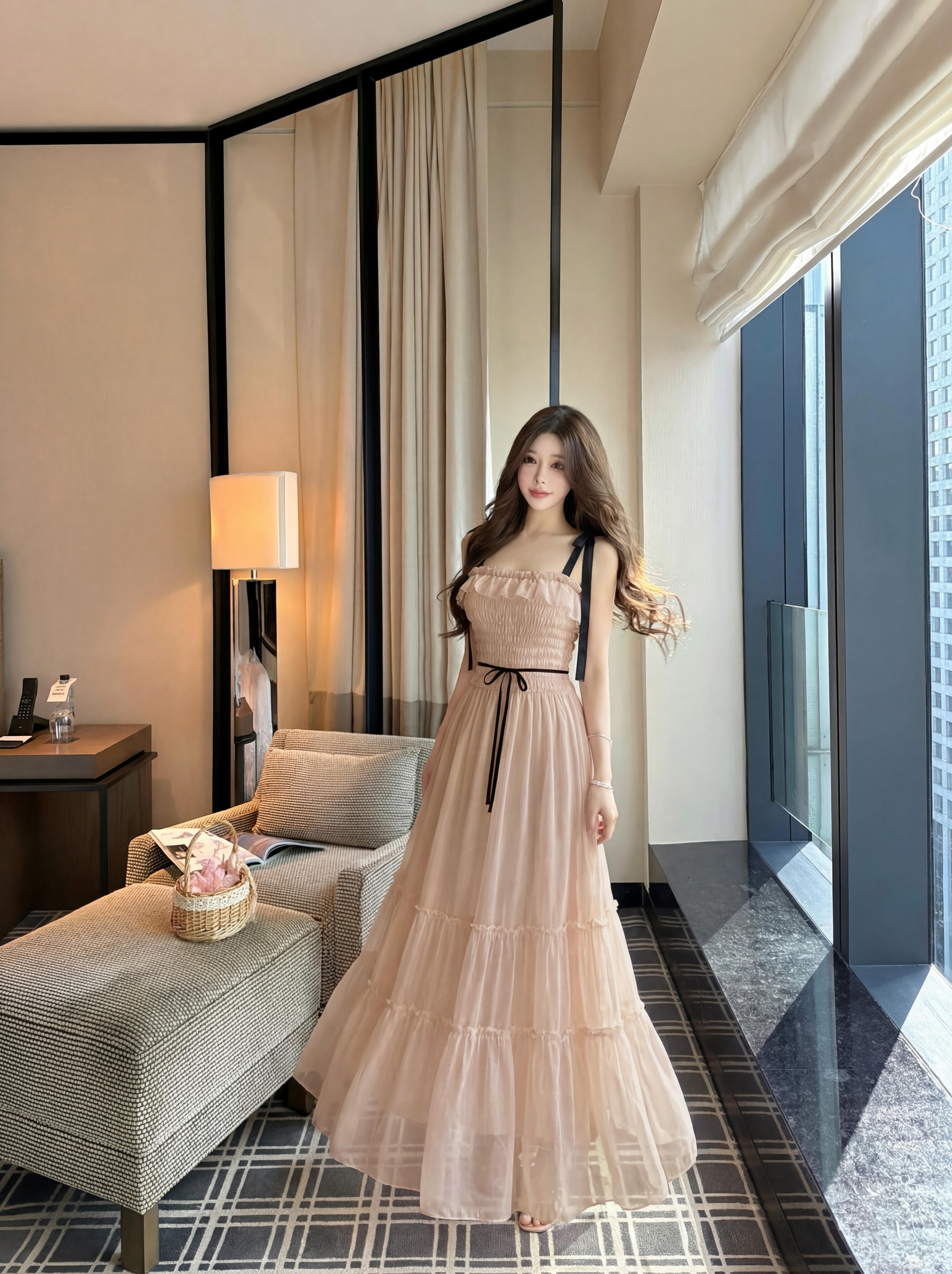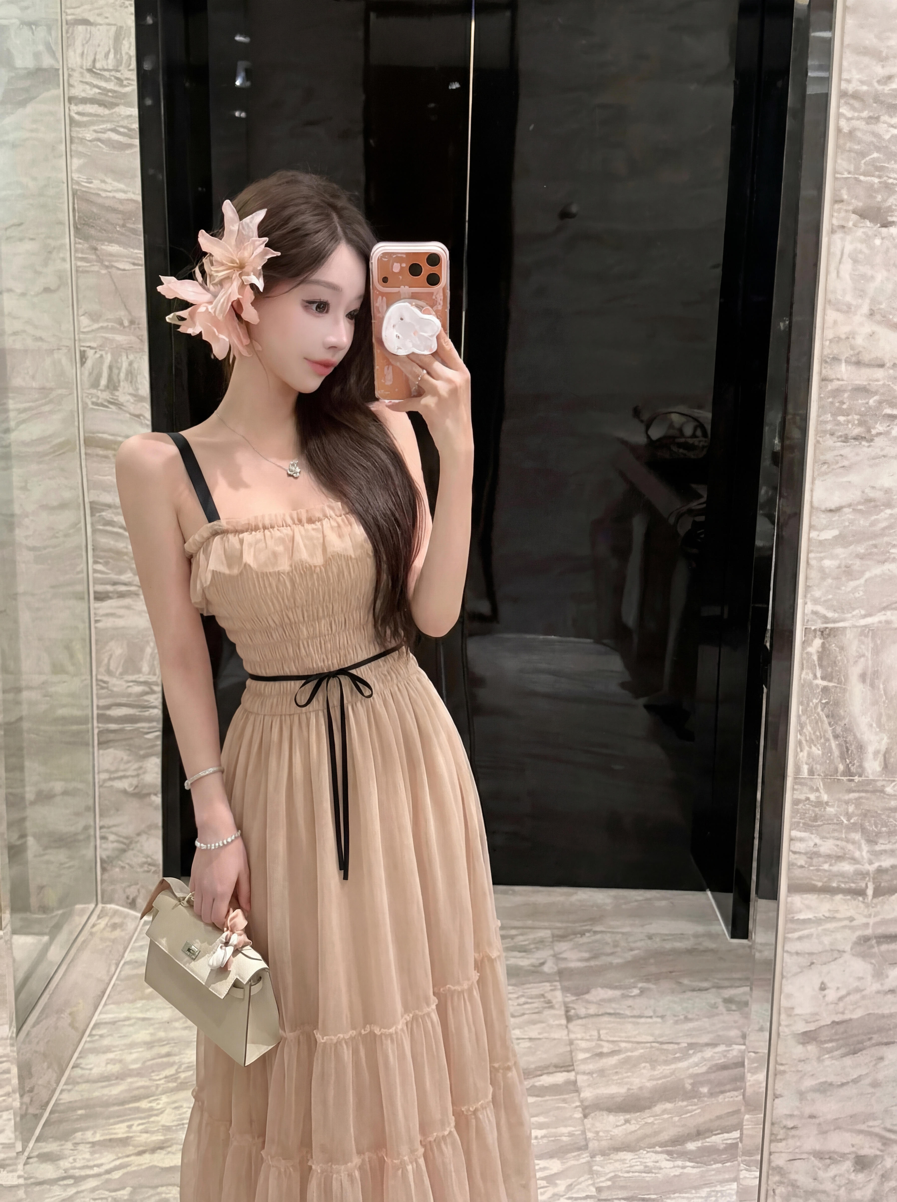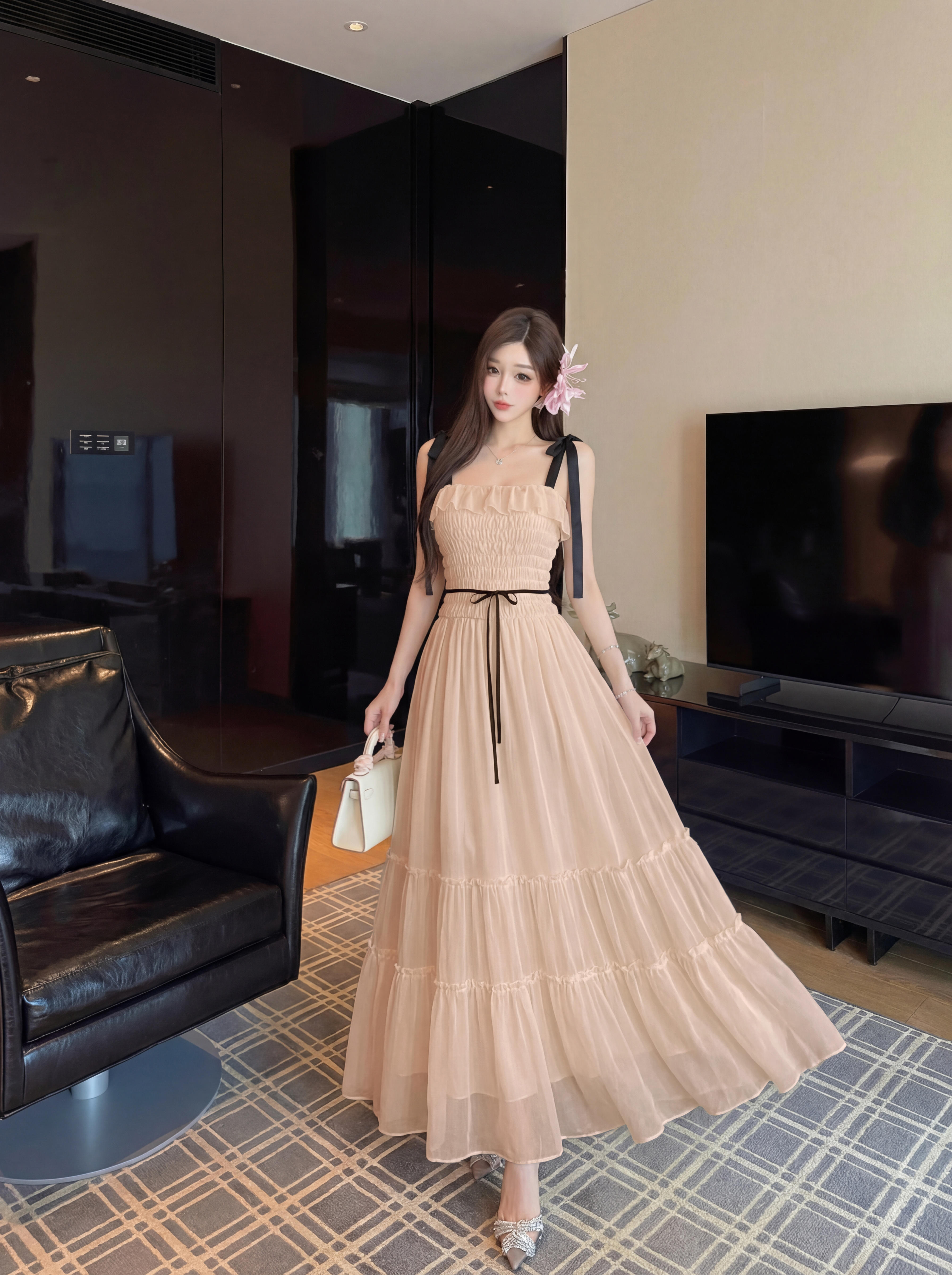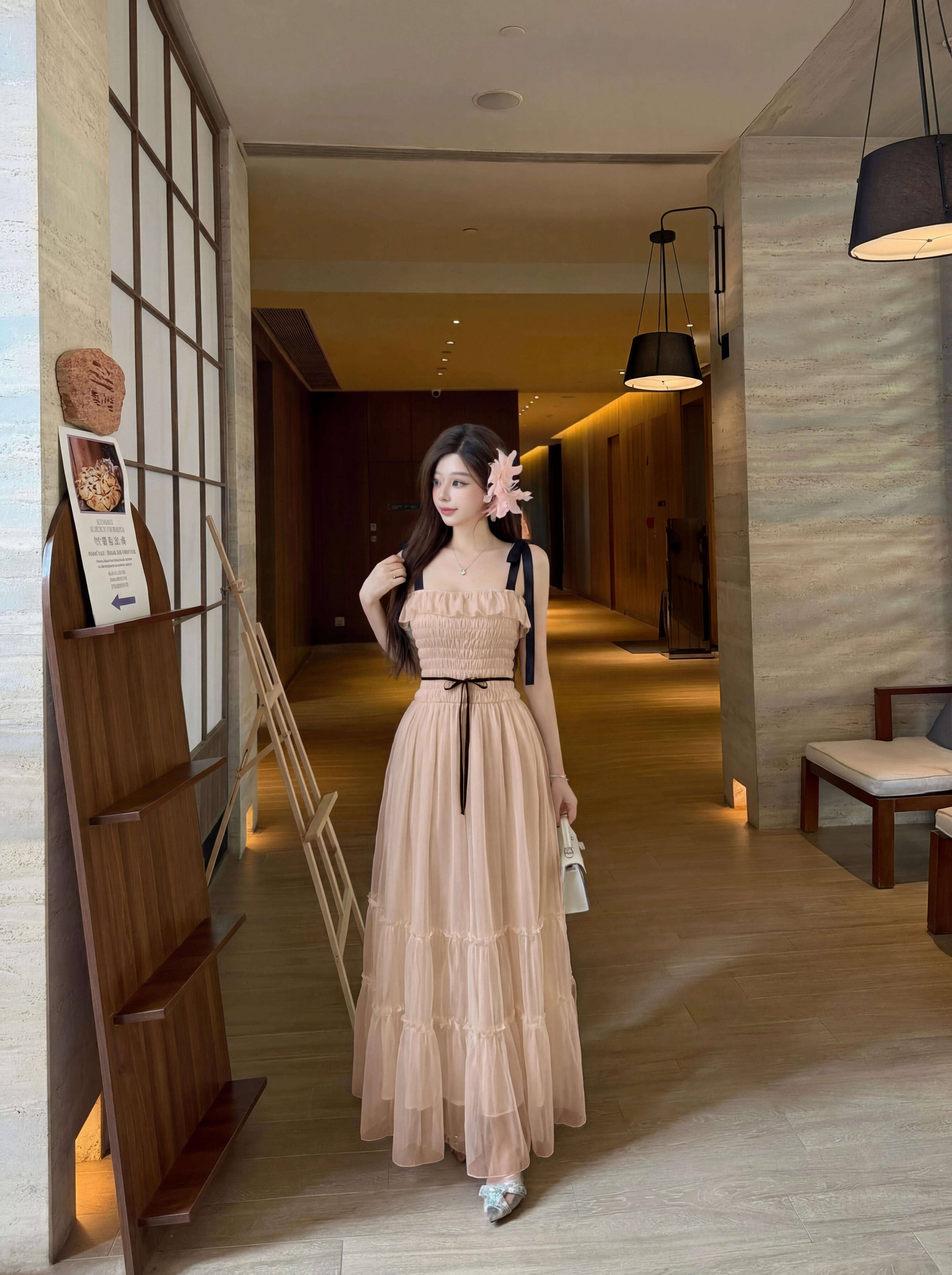 实拍2026夏季甜美风粉茶色蝴蝶结优雅气质甜辣妹穿搭浪漫收腰长裙
