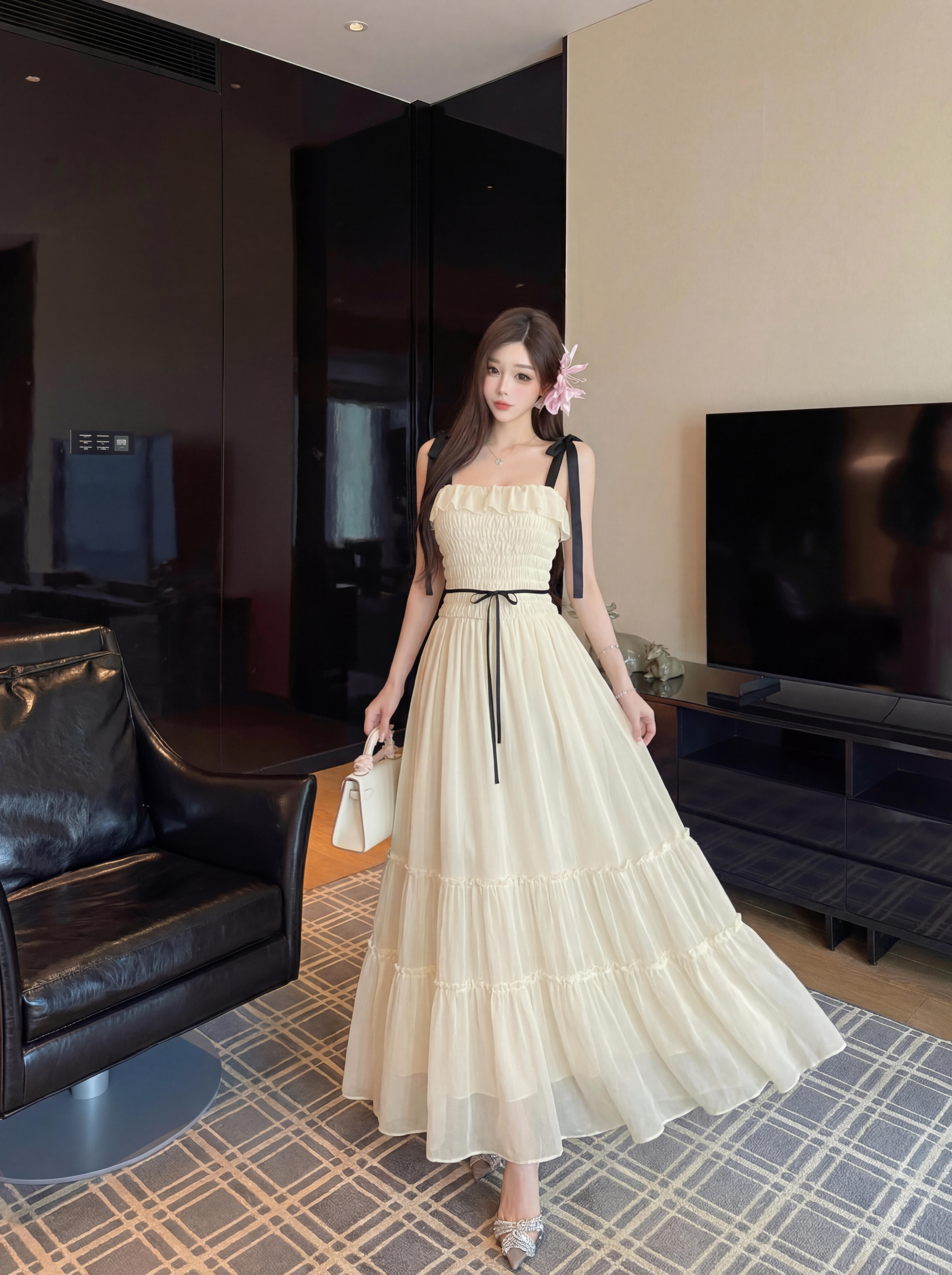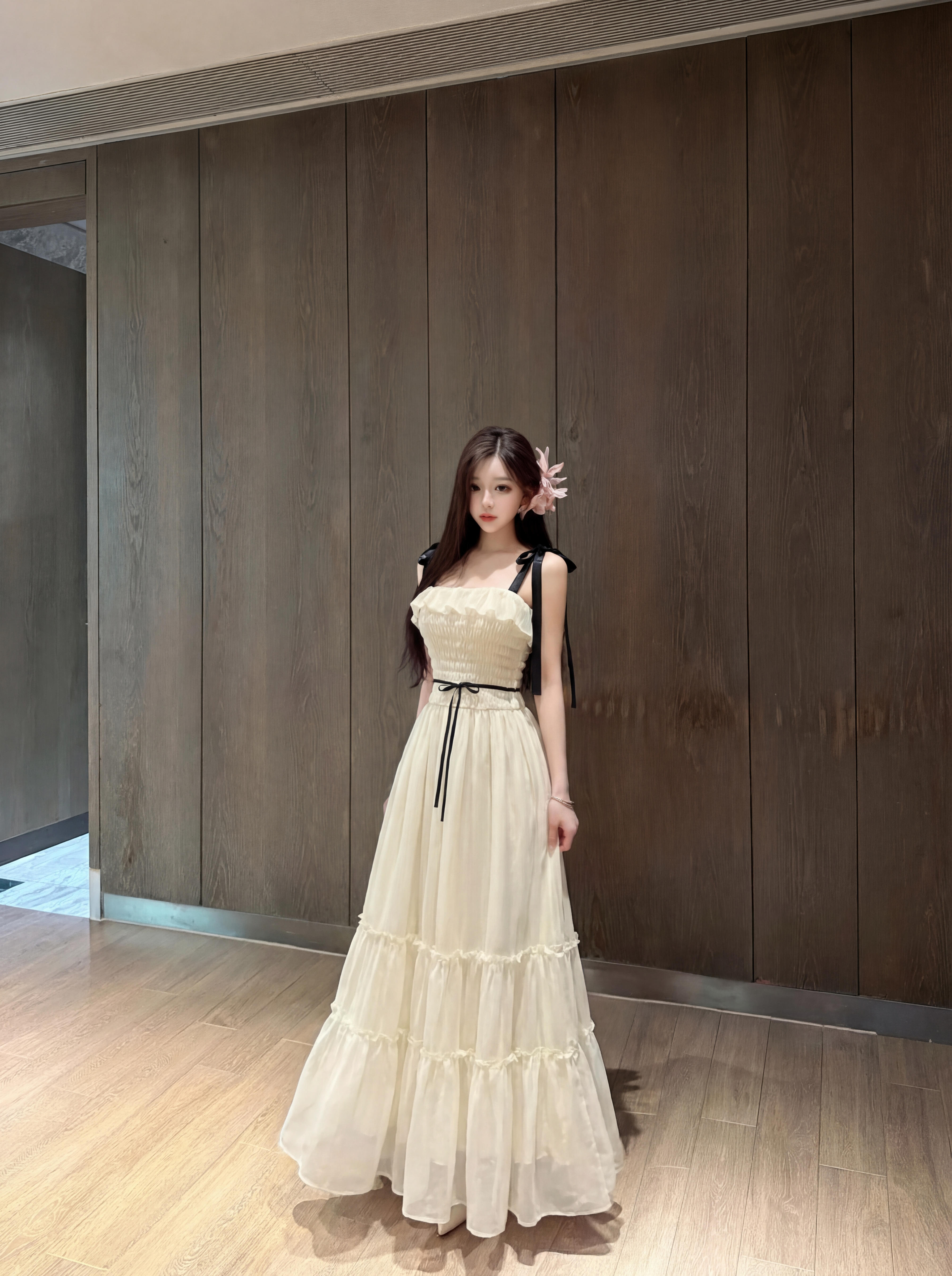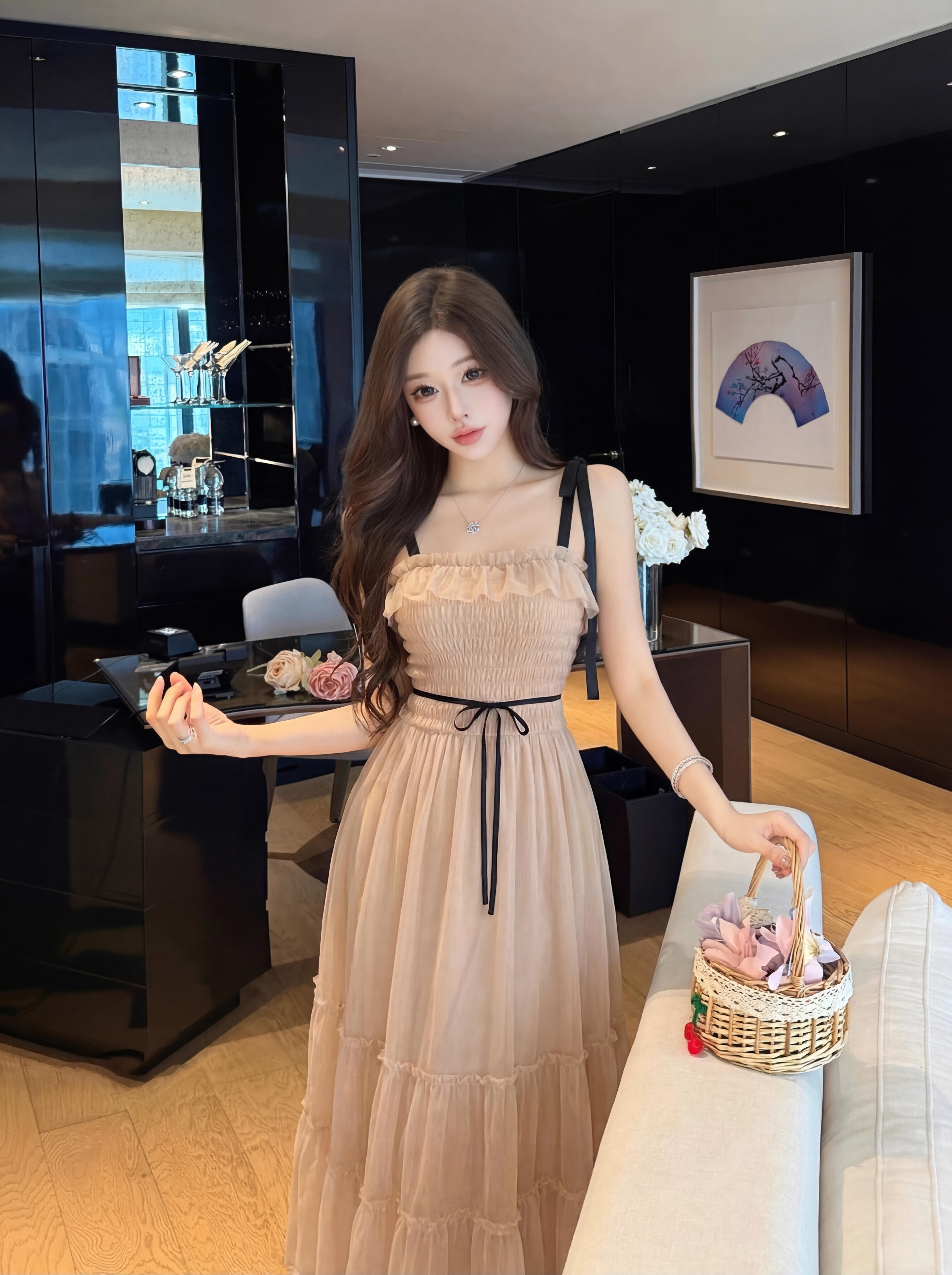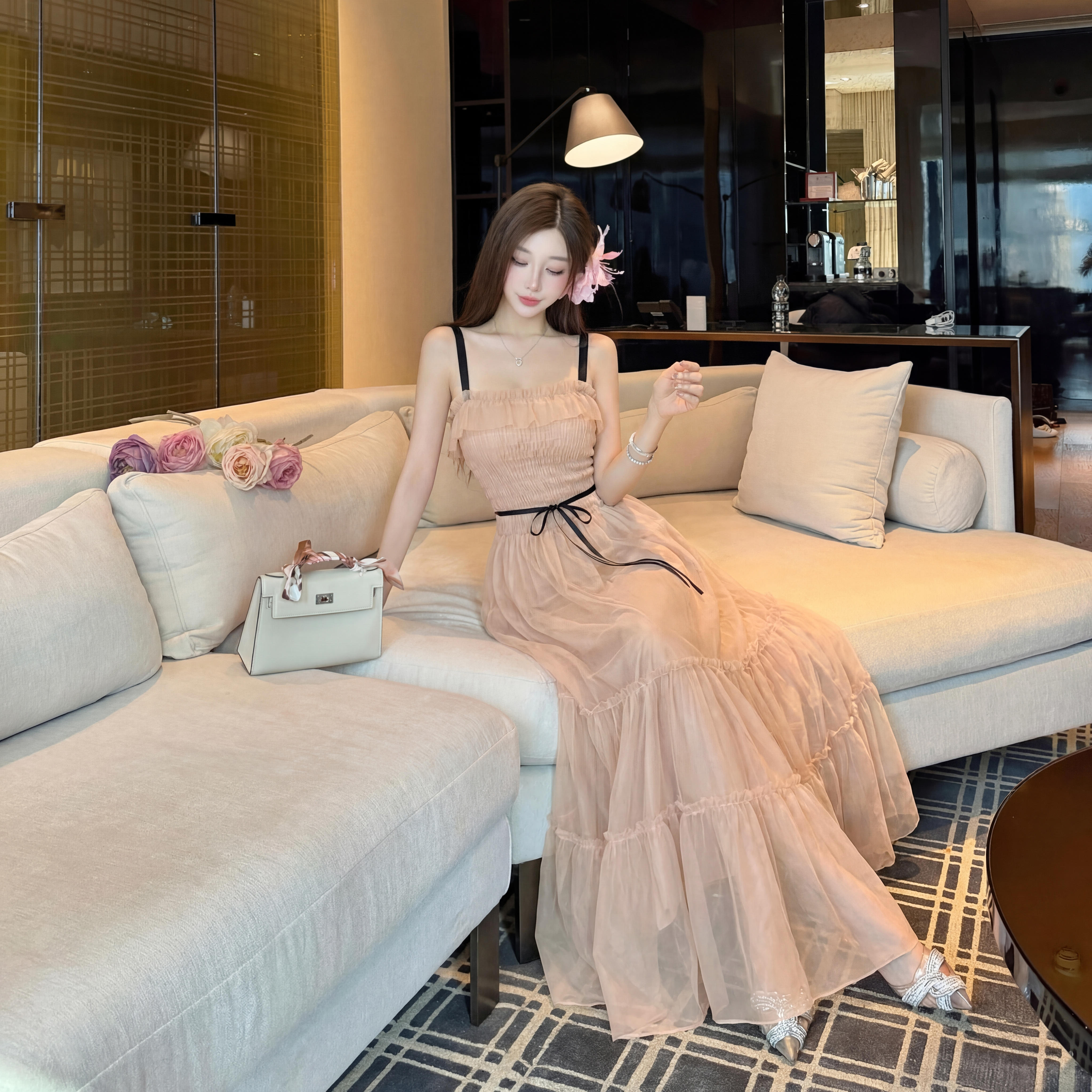 实拍2026夏季甜美风粉茶色蝴蝶结优雅气质甜辣妹穿搭浪漫收腰长裙