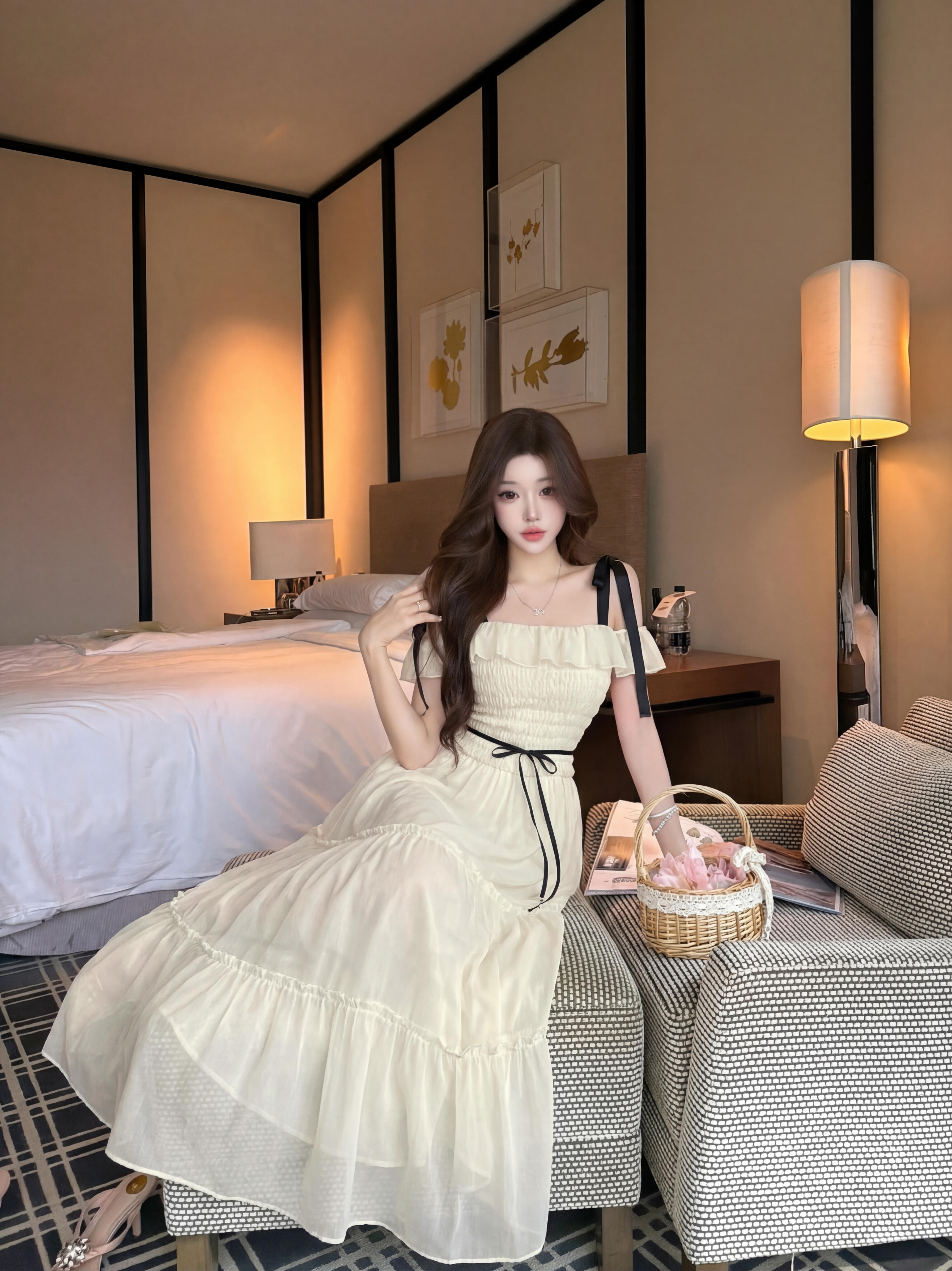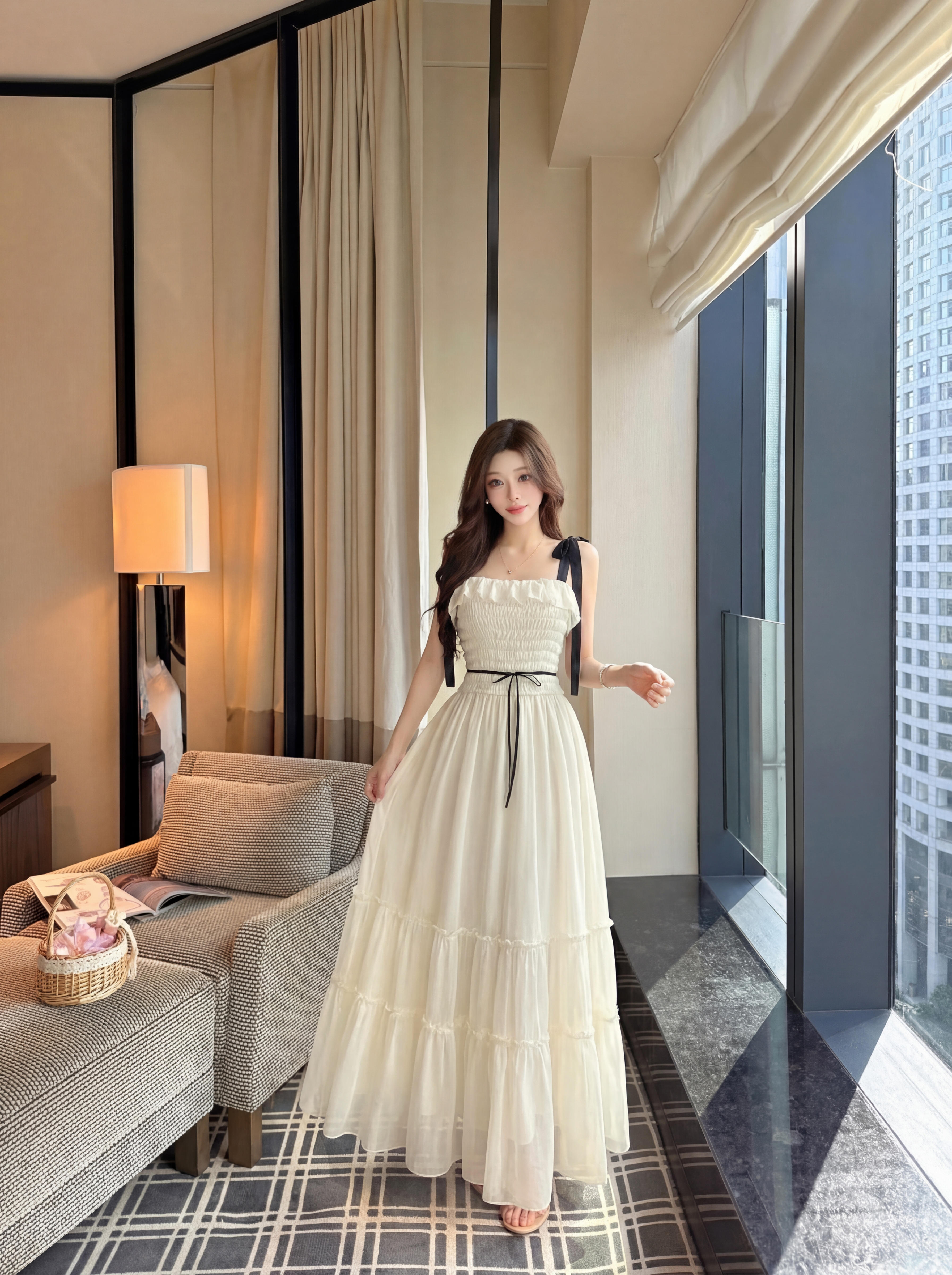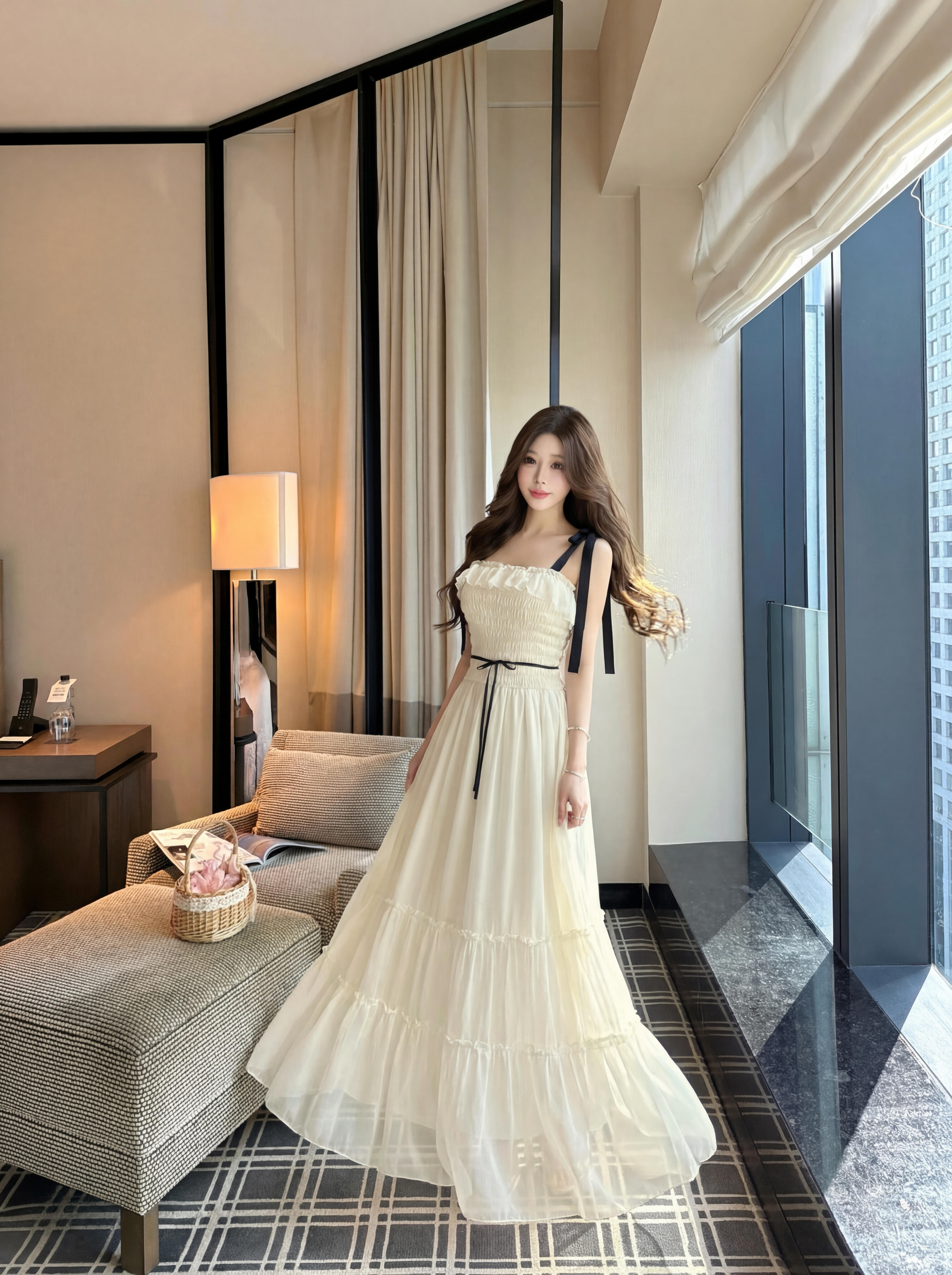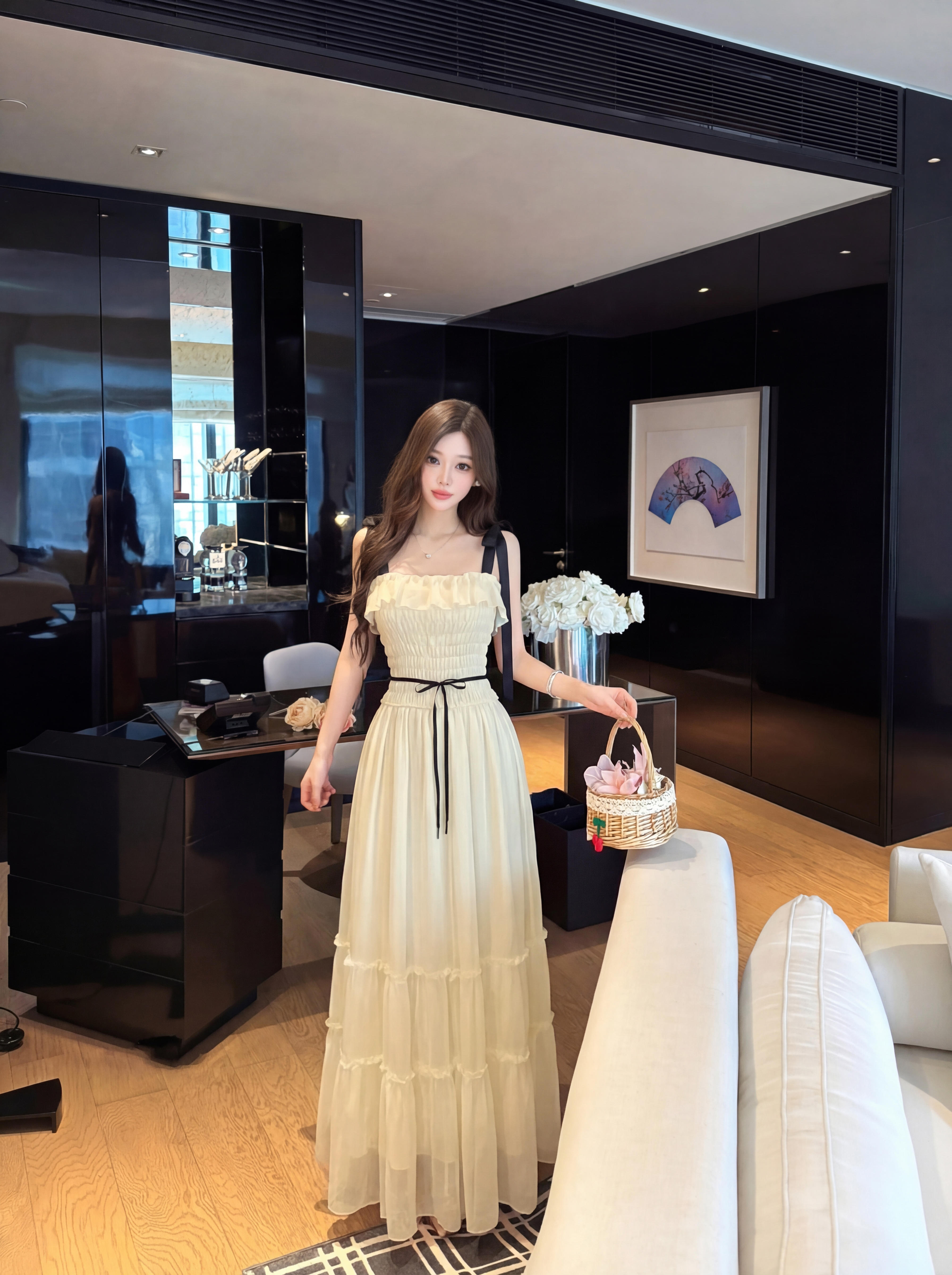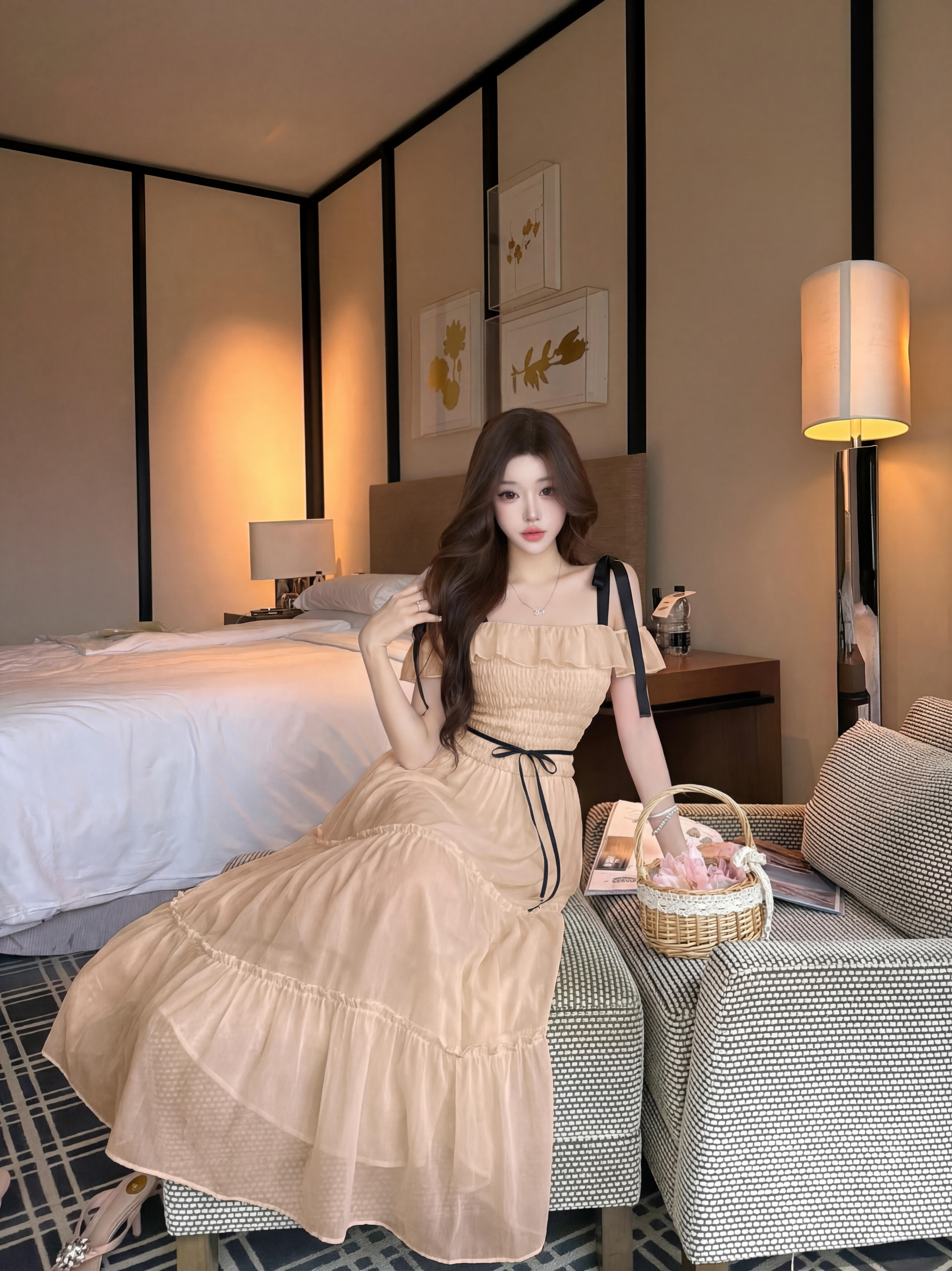 实拍2026夏季甜美风粉茶色蝴蝶结优雅气质甜辣妹穿搭浪漫收腰长裙