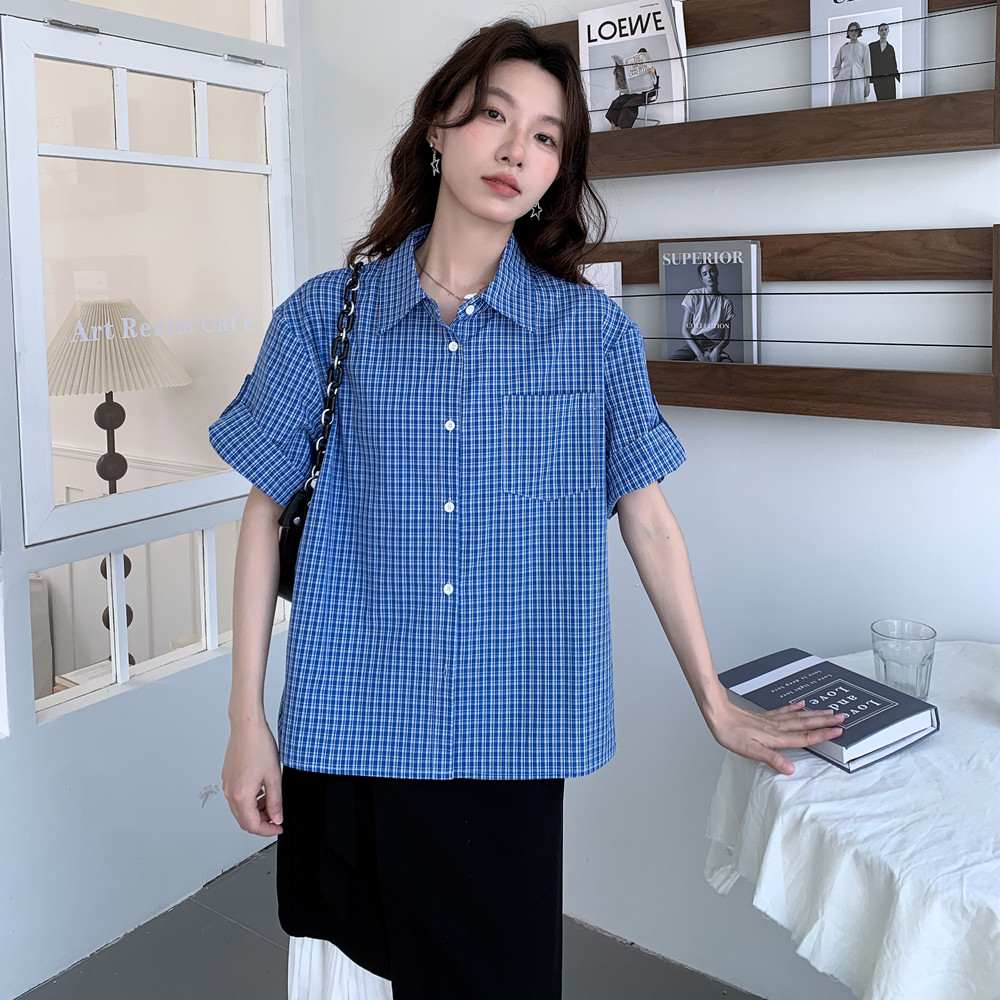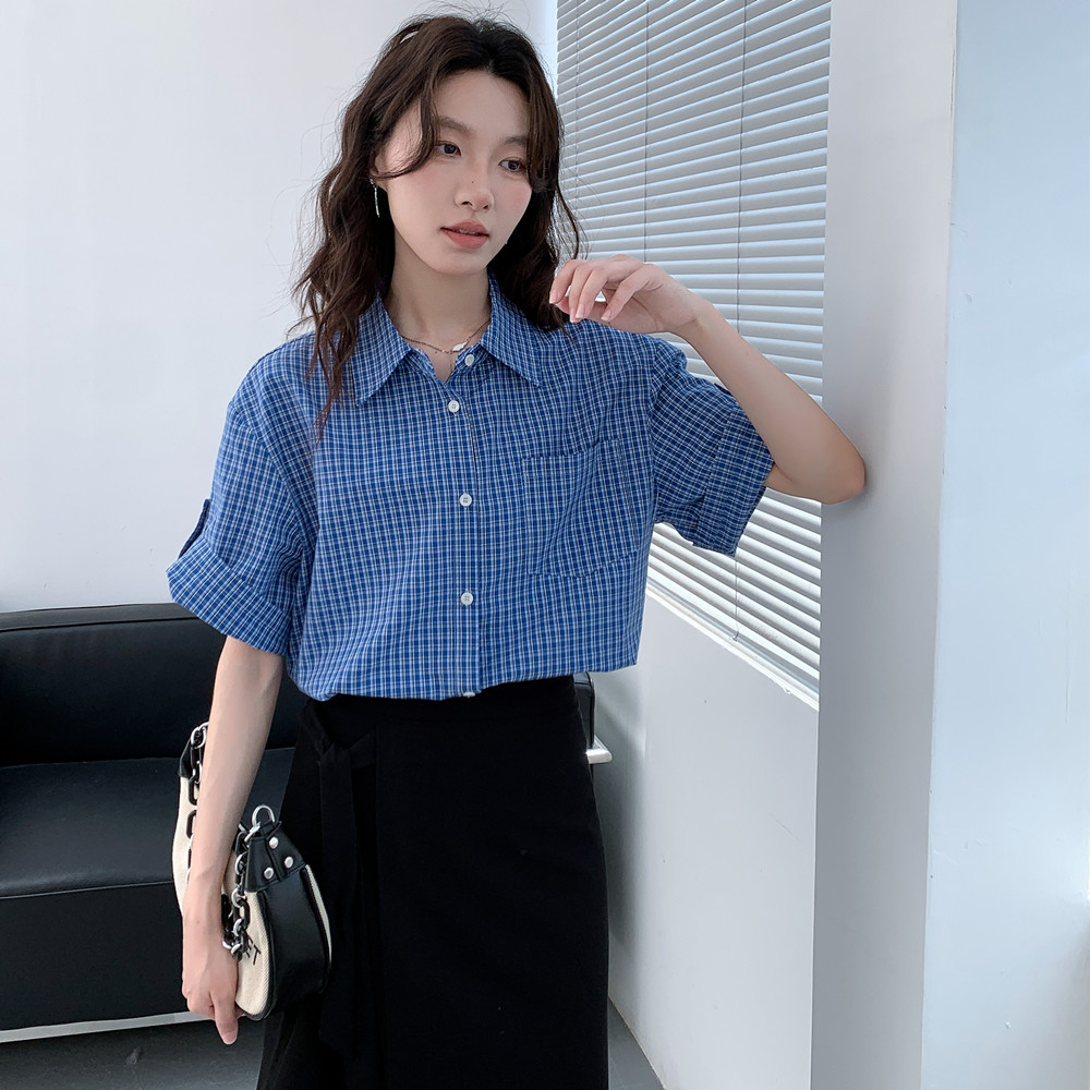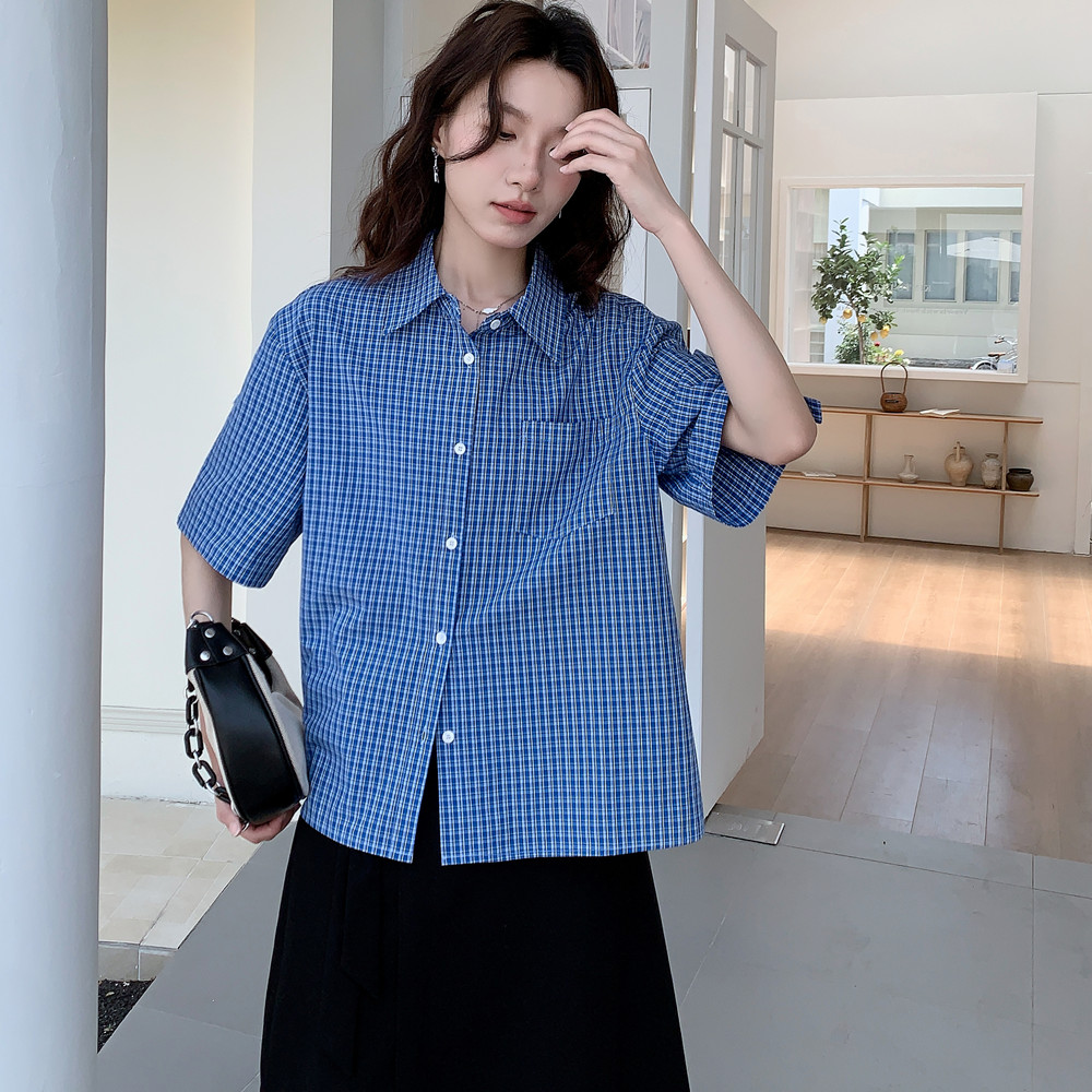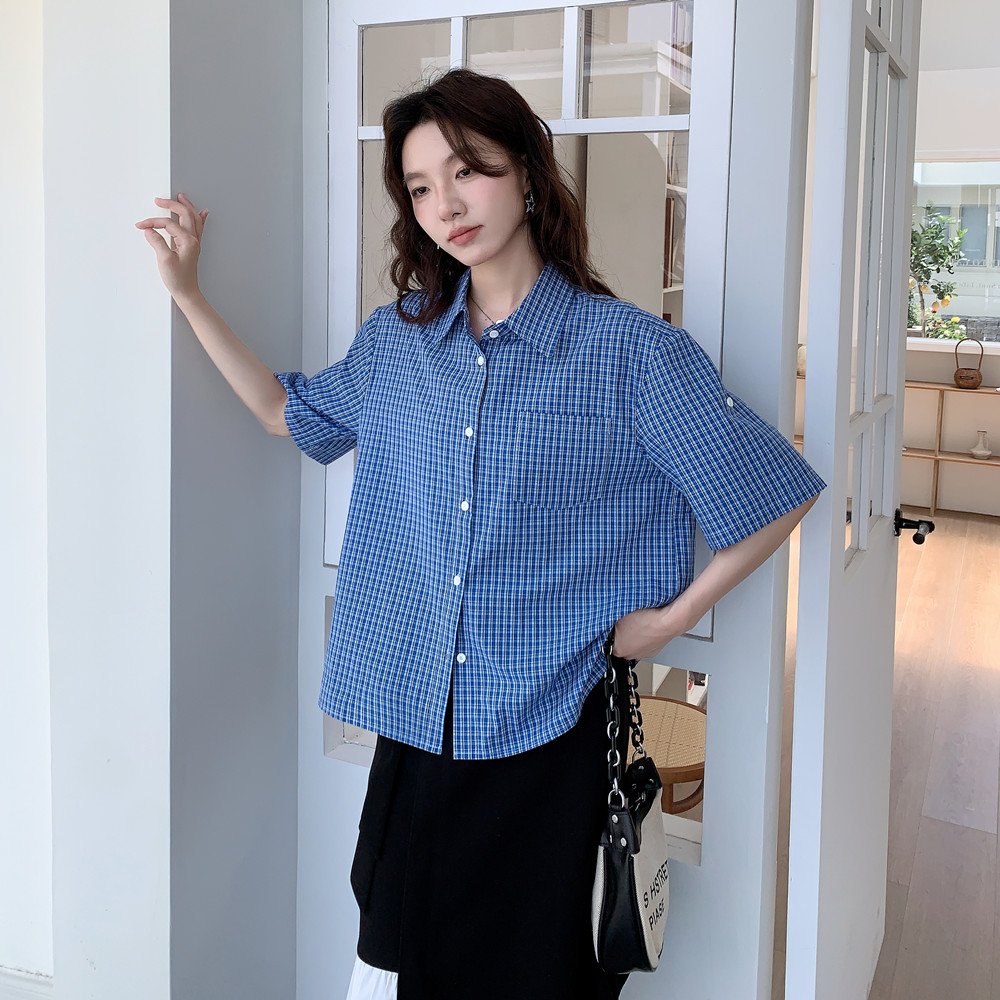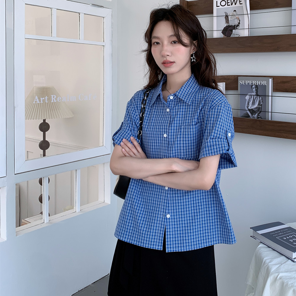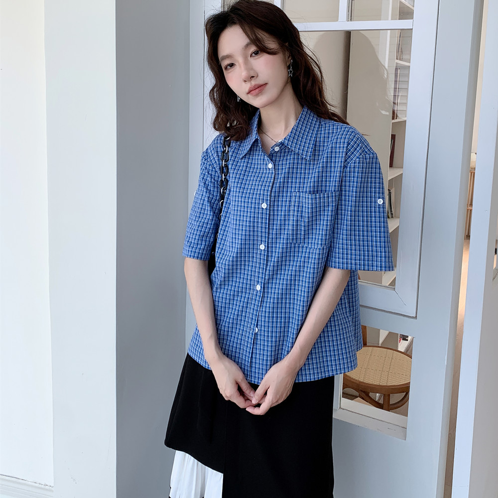 实拍 法式复古色织蓝格纹正肩通勤卷边半袖衬衫女夏季新款