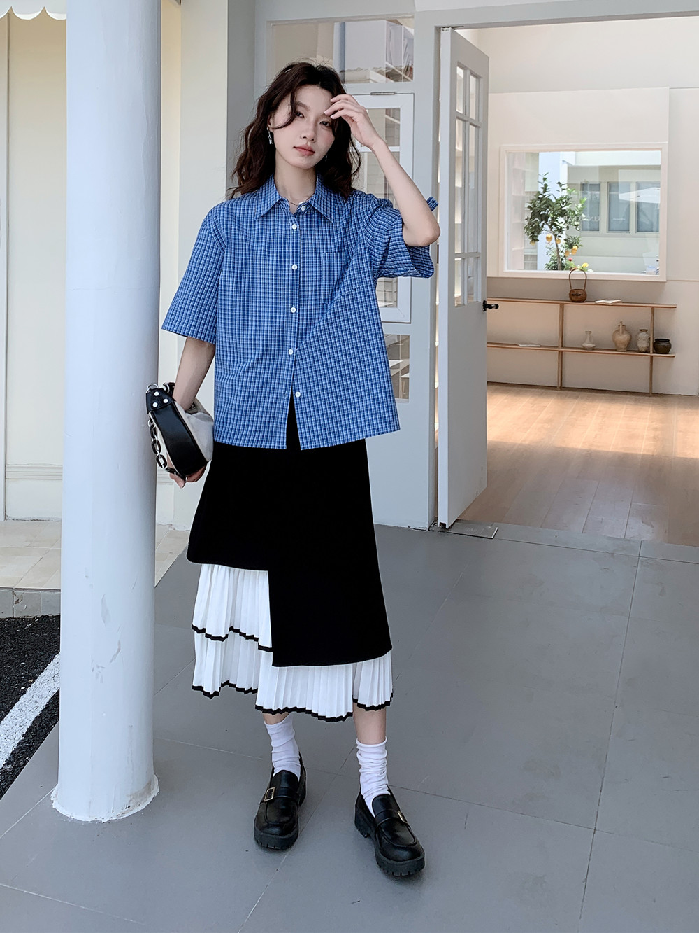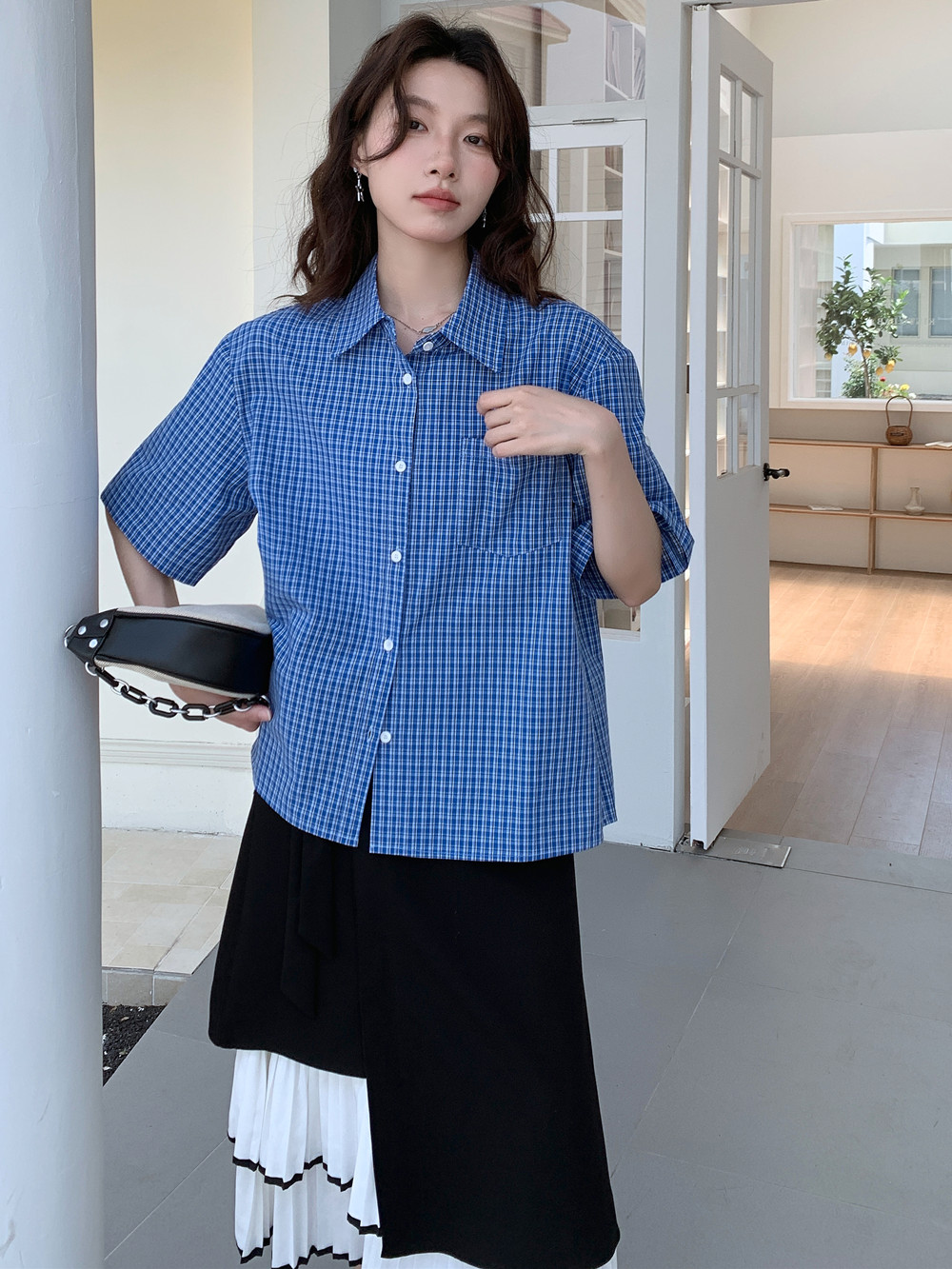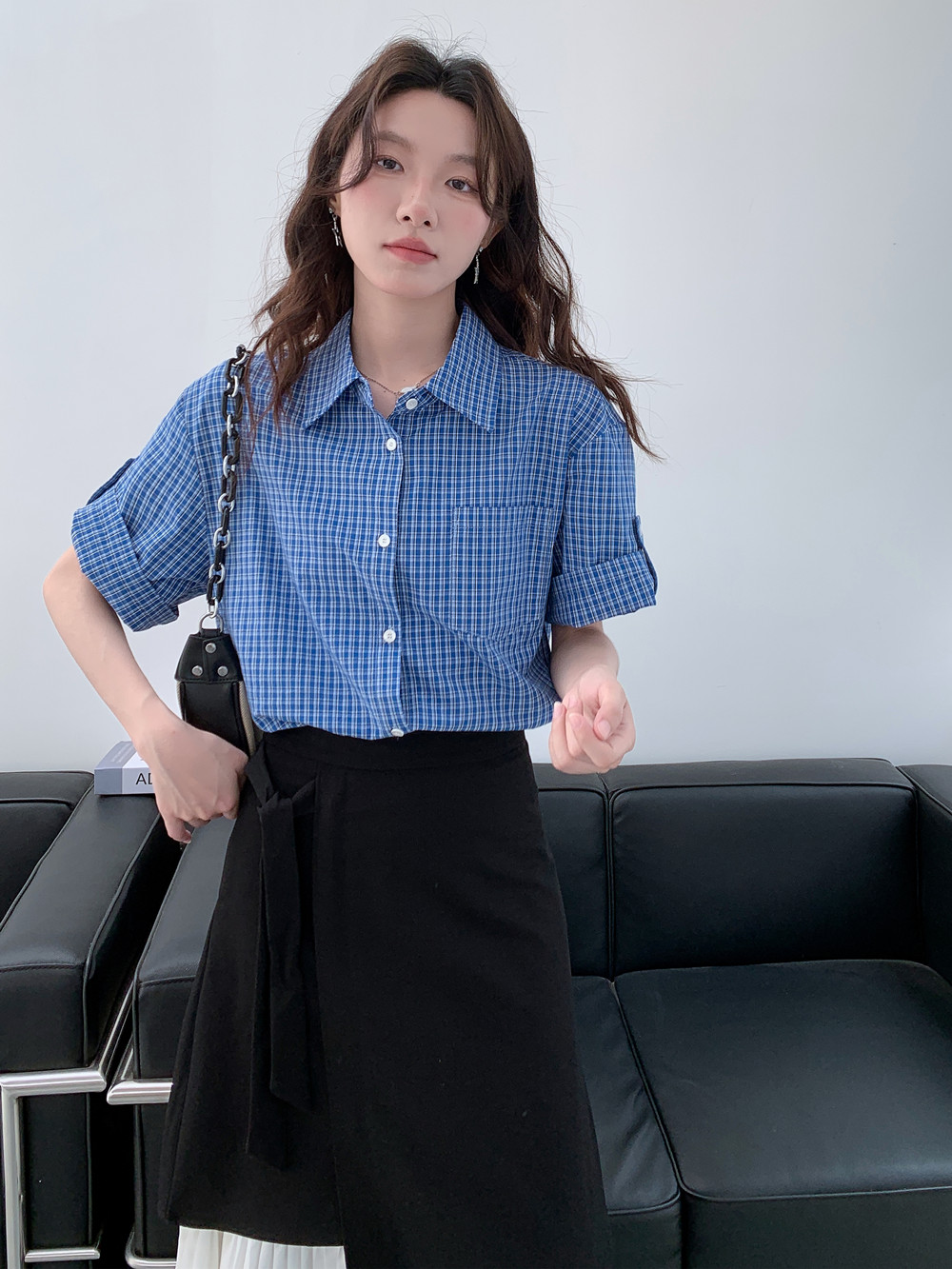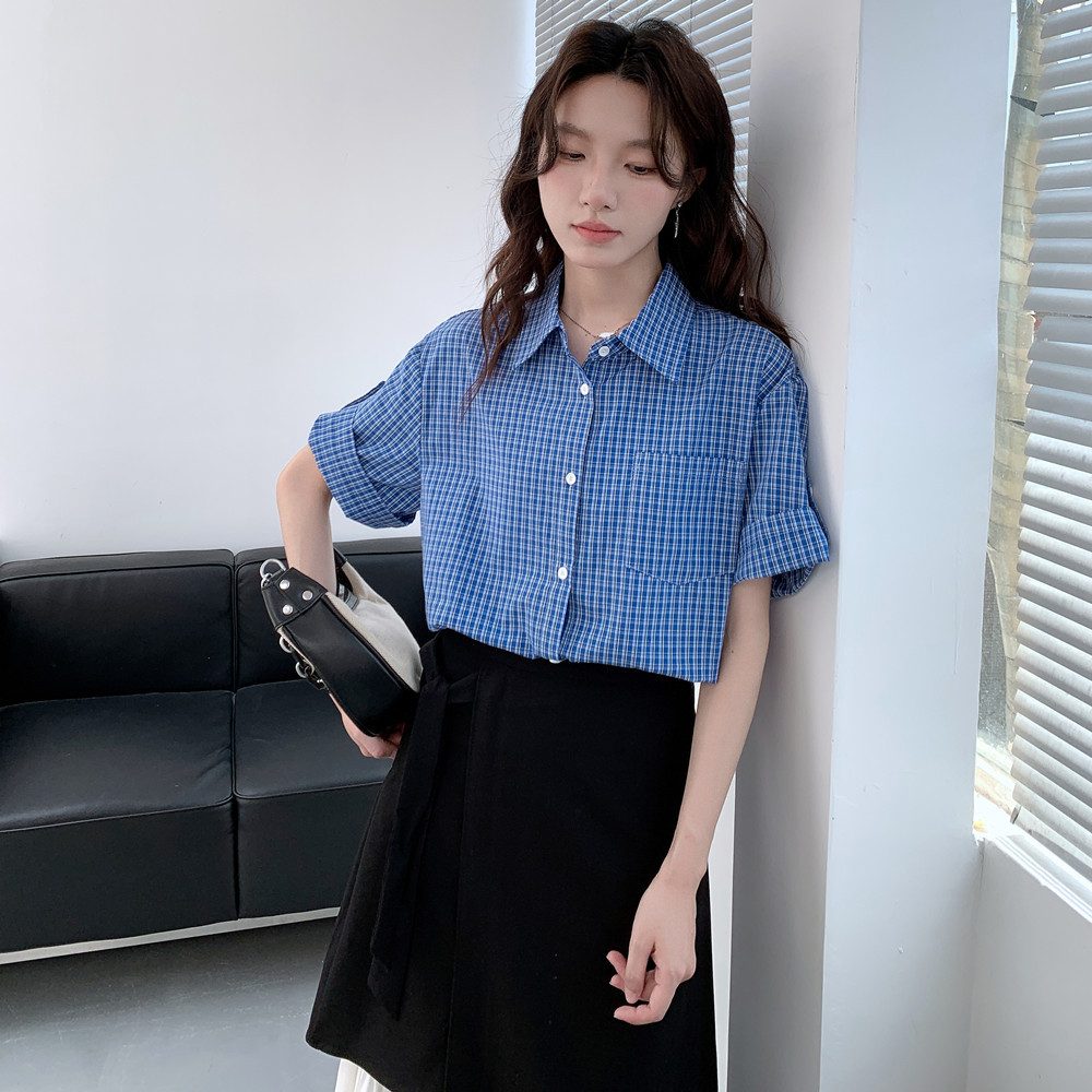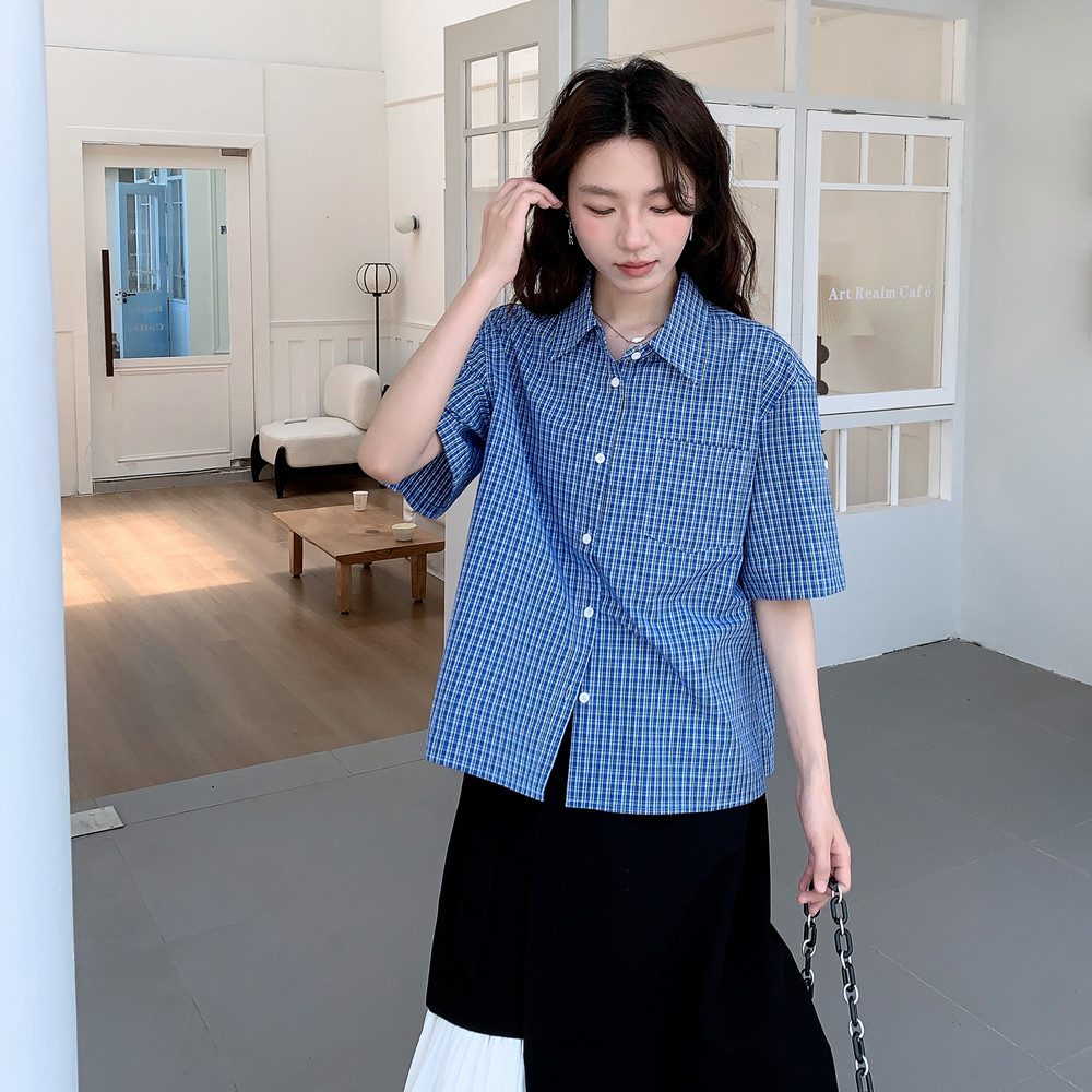 实拍 法式复古色织蓝格纹正肩通勤卷边半袖衬衫女夏季新款