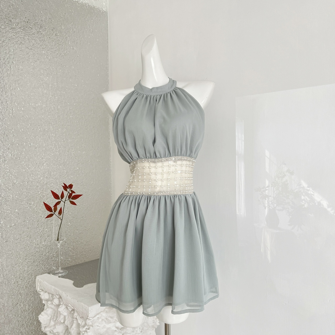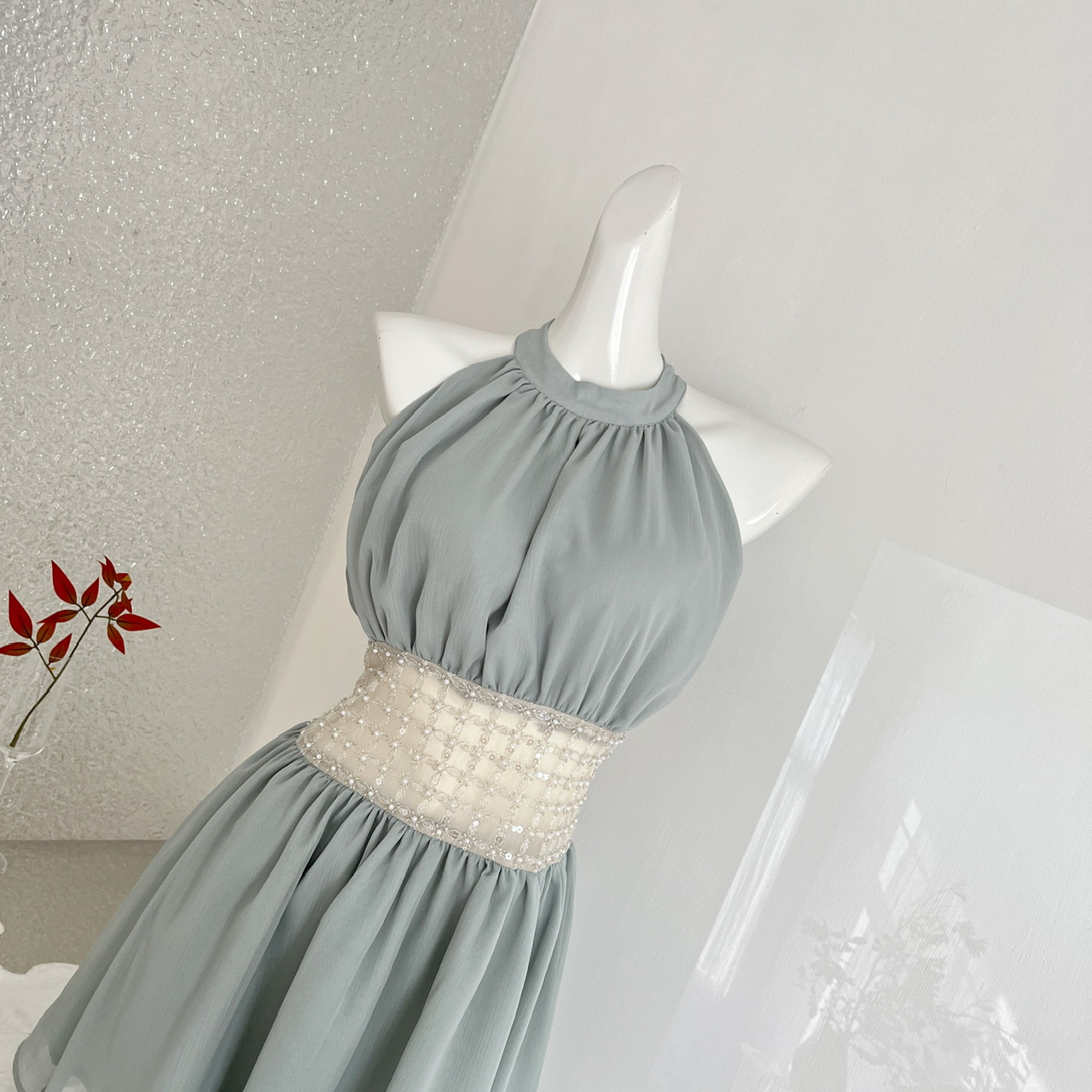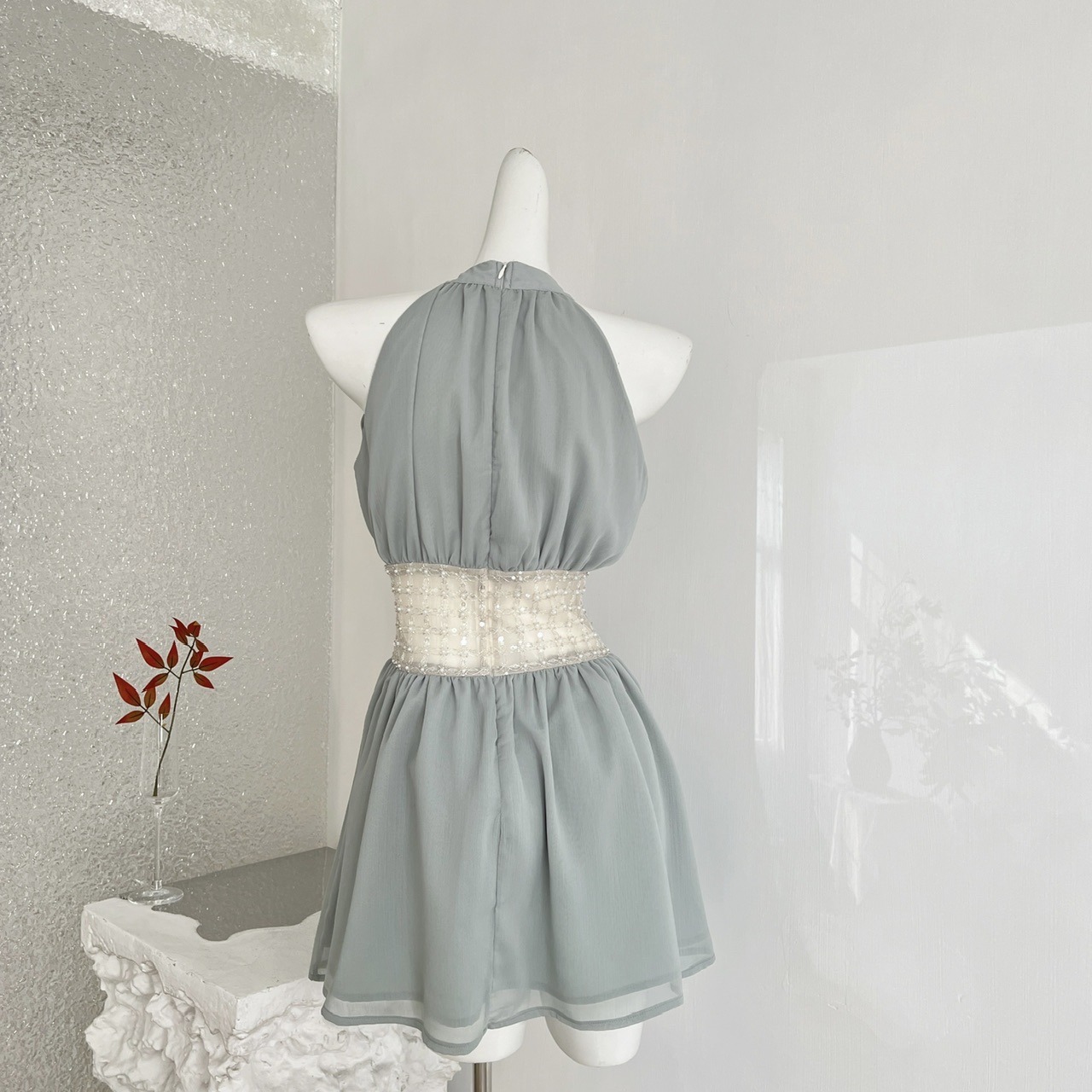 kubiliv海蓝碎珀重工挂脖挖肩纯欲氛围感手工钉珠收腰连衣裙
